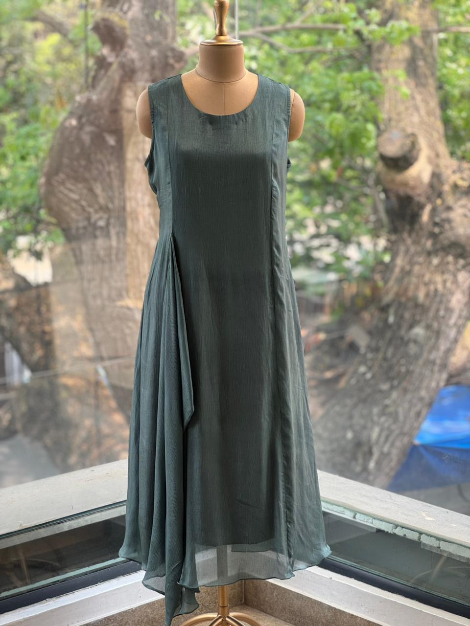 Green soft silk sleeveless tunic with side pleats. Comes with a beautiful marble glass tissue collared jacket with intricate handwork.