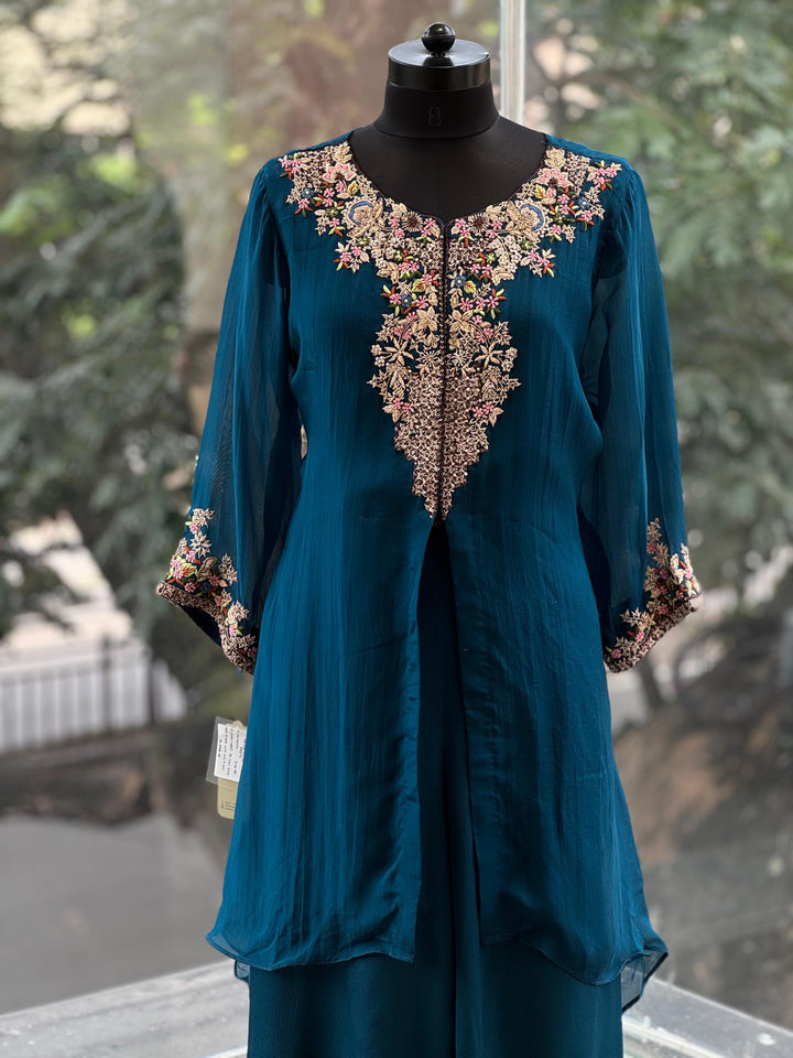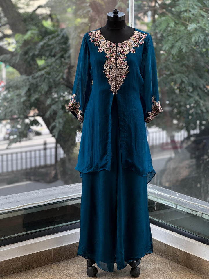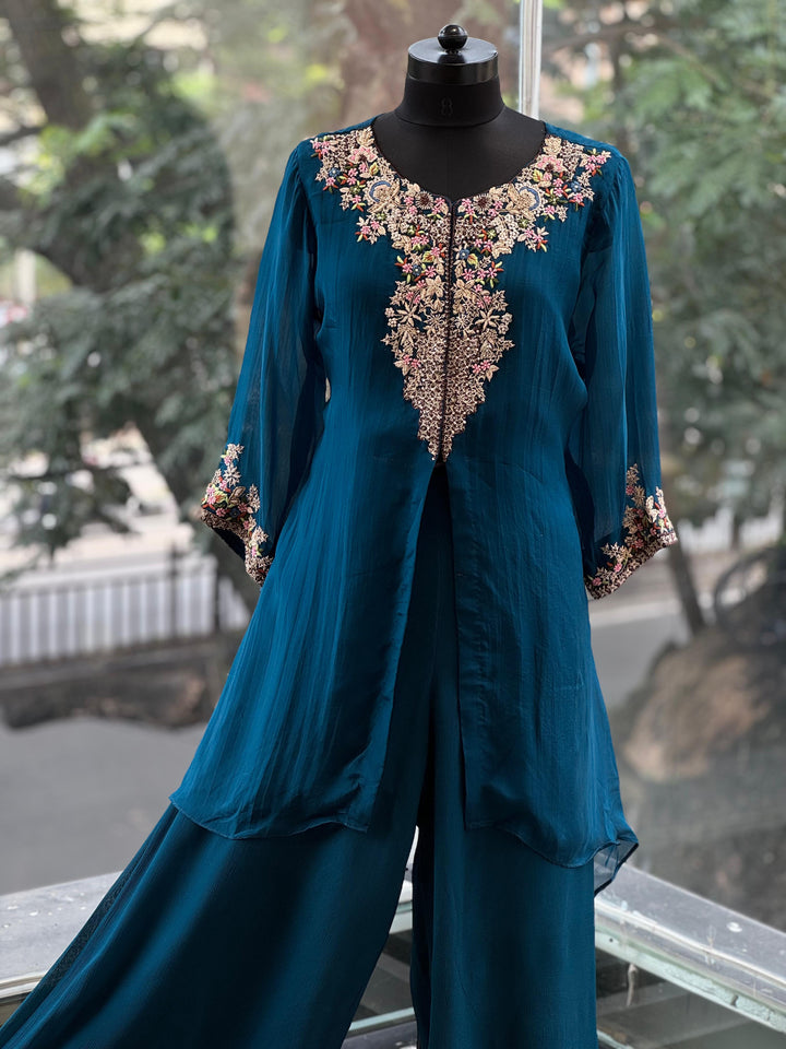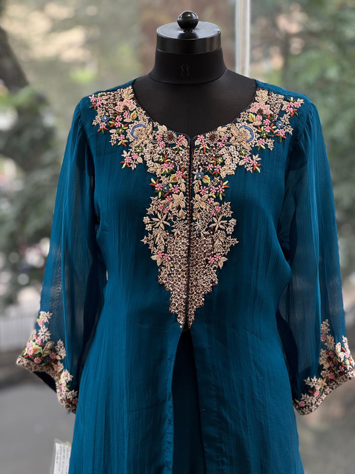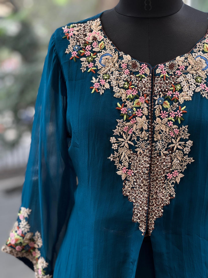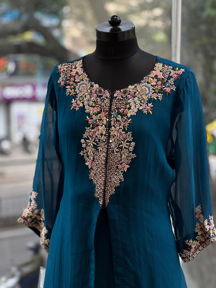 Pure soft organza silk intricate hand embroidered kurta with sleeveless inner. Comes with wide leg pants.