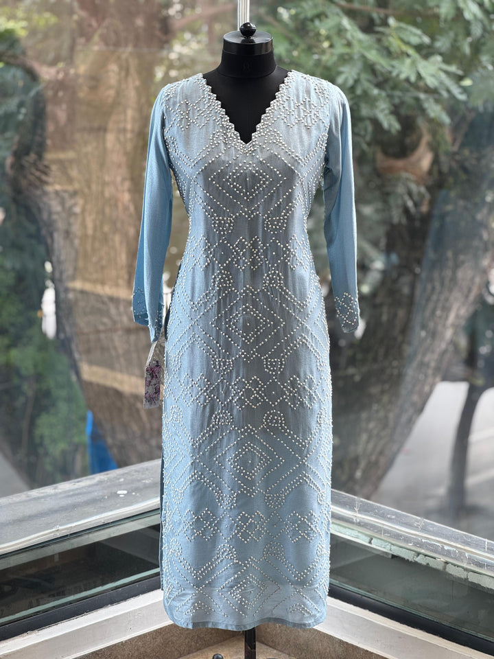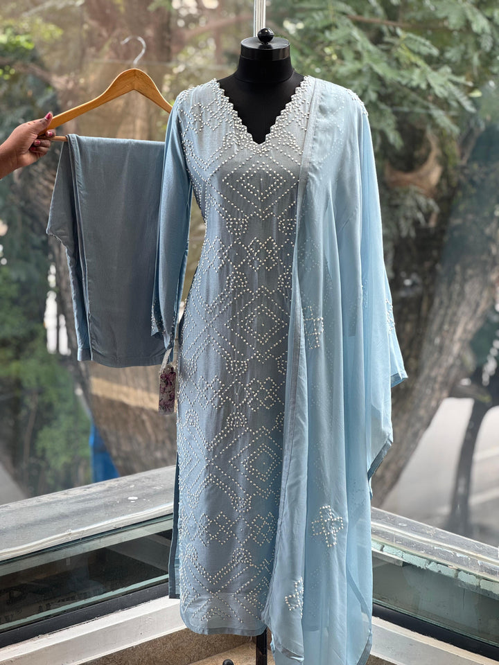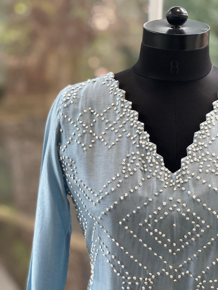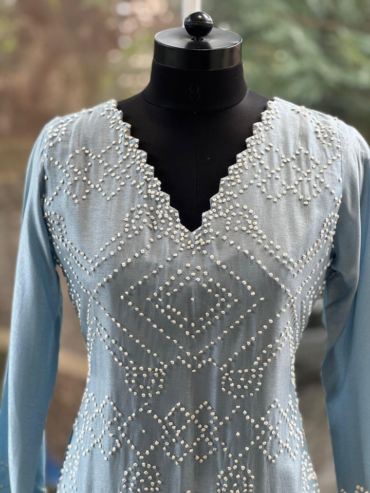 Pure silk pastel blue straight cut jaal knot work kurta, comes with comfort fit pants and soft silk dupatta.