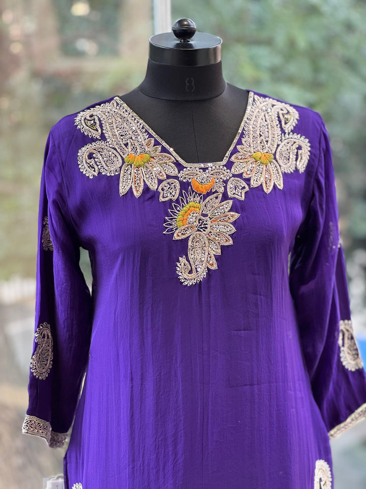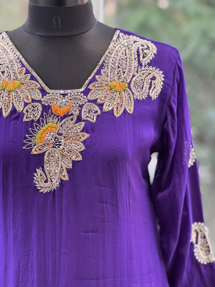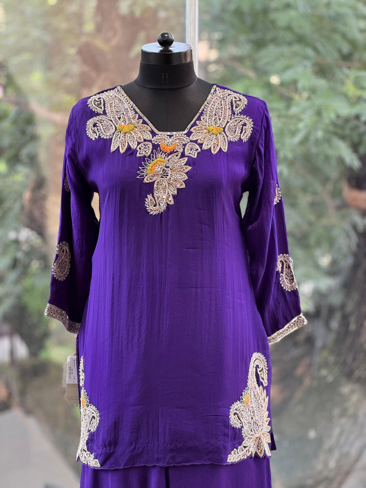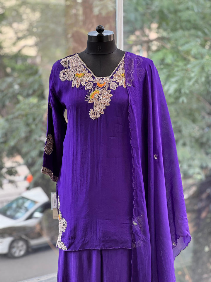 Pure silk short Pure Silk ,Long hand done thread work with hanging tasselss comes with pure crepe silk flowy sharara and soft silk organza ... This ethic beauty commands attention and...