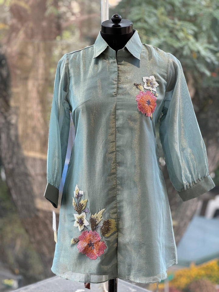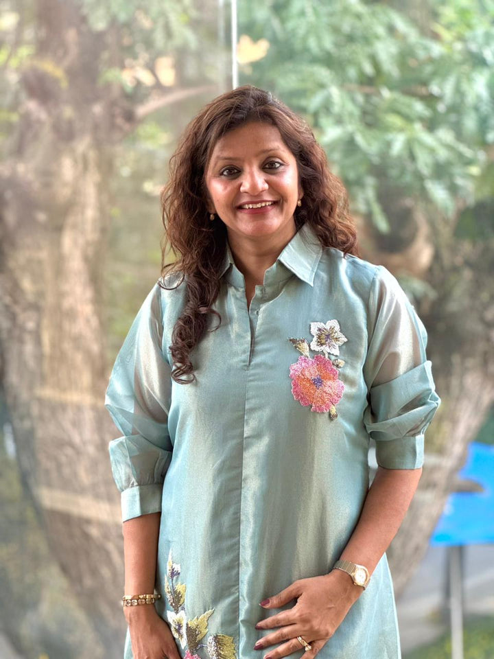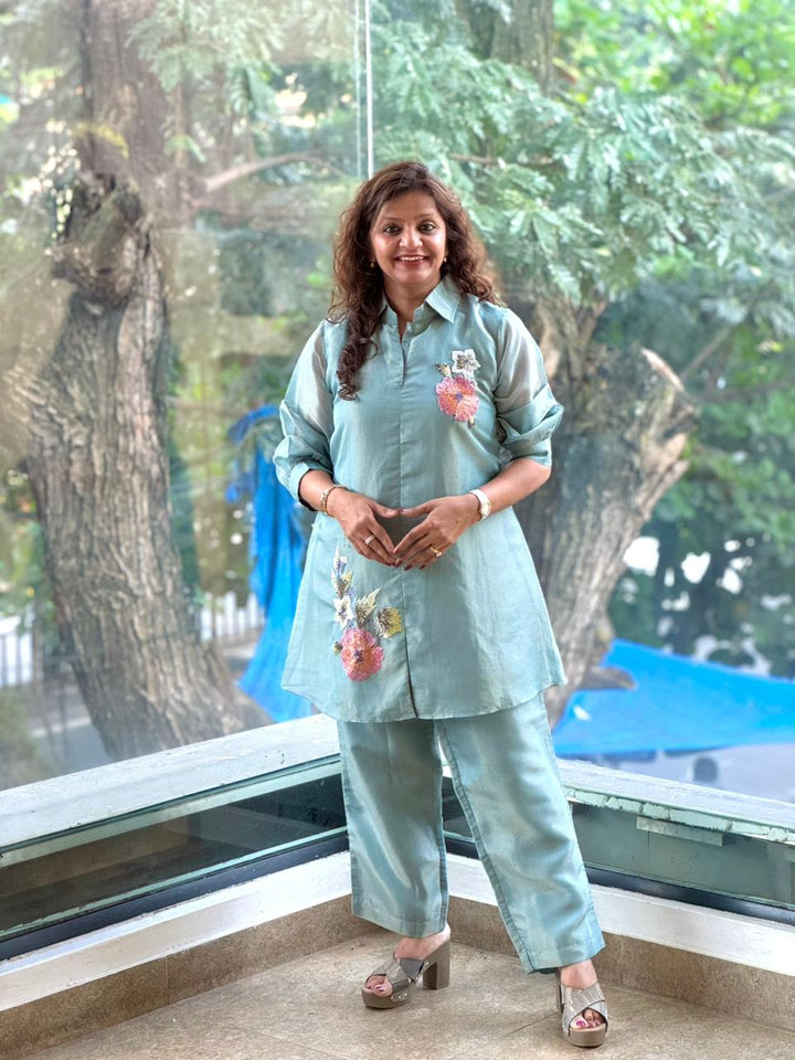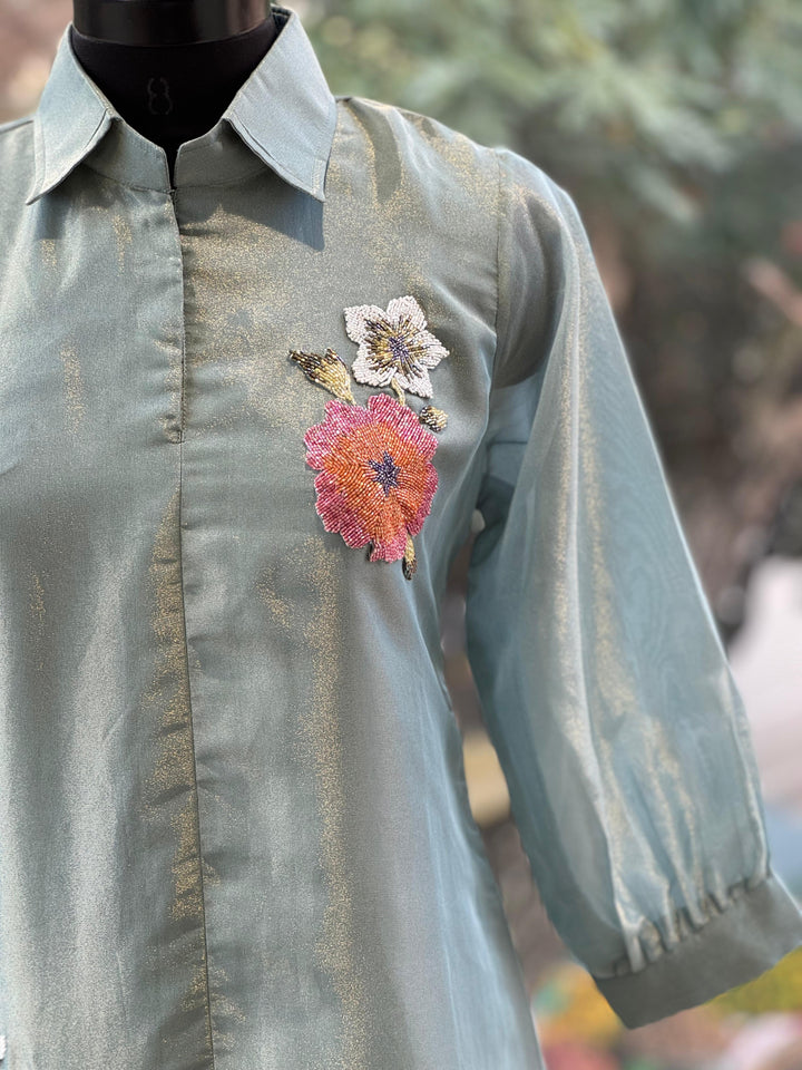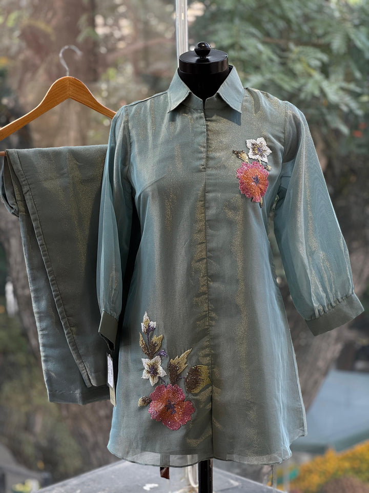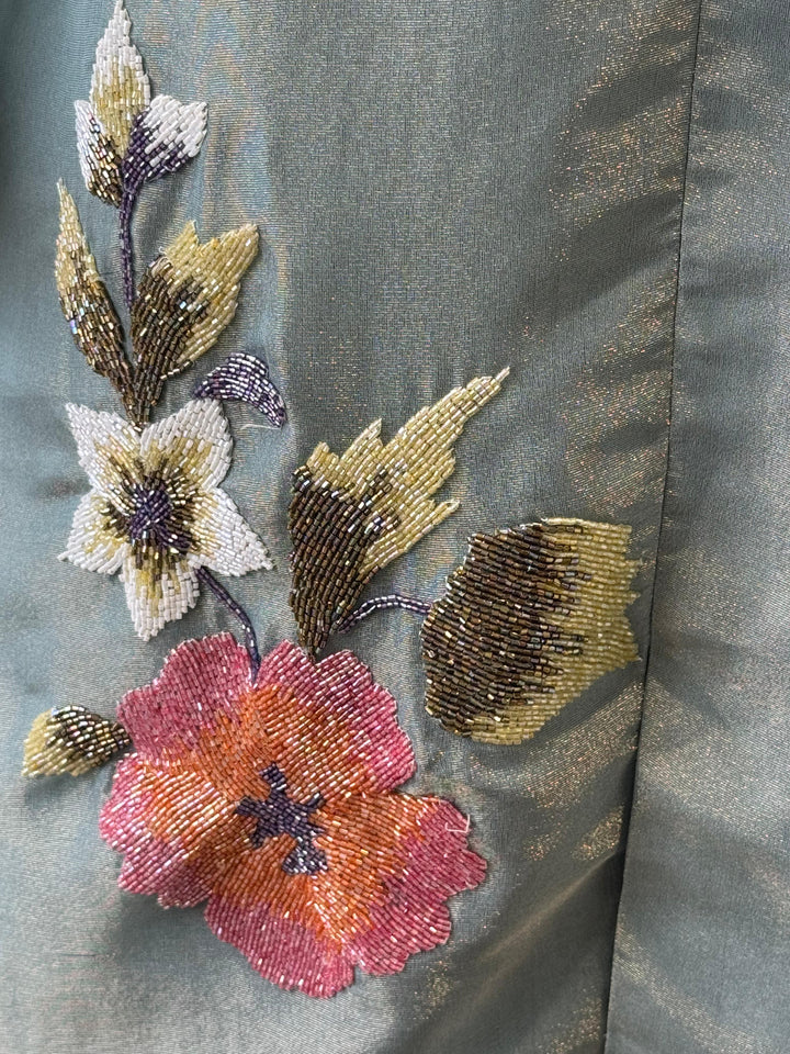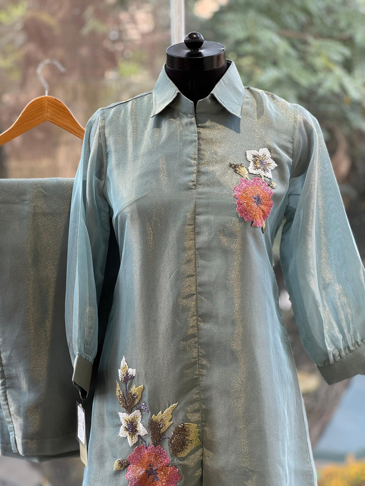 Blue pure glass tissue collared co ord with inrticate bead work detailling.