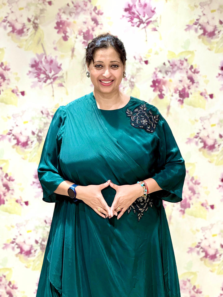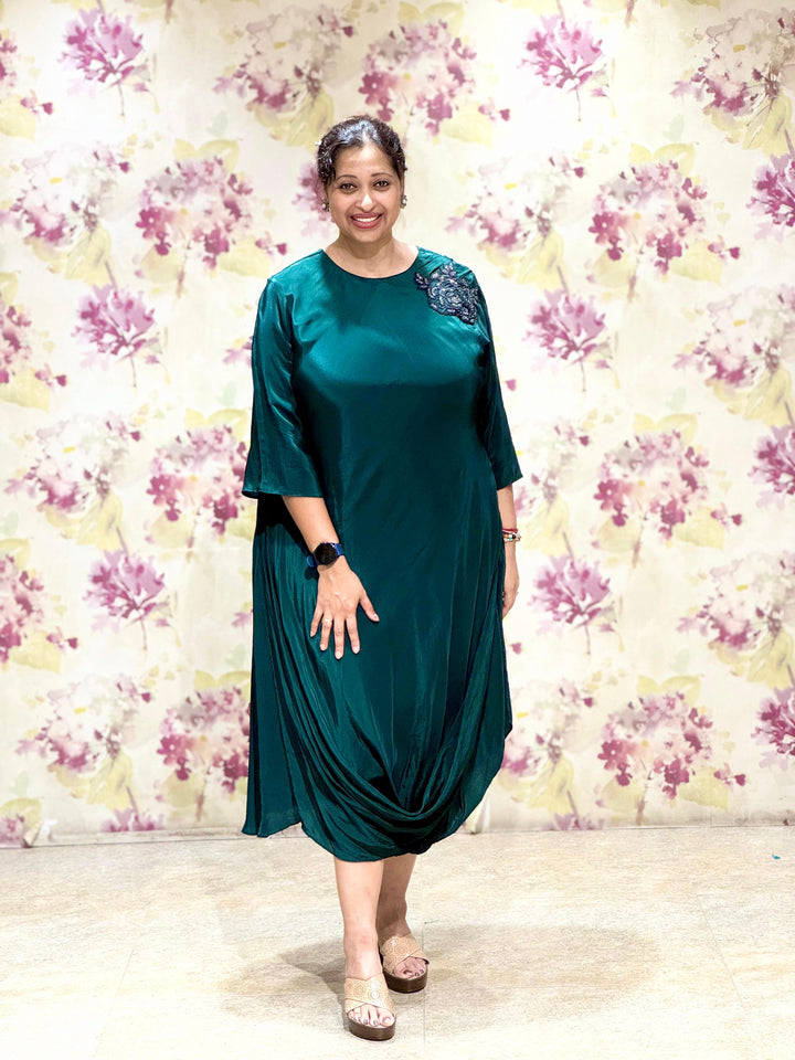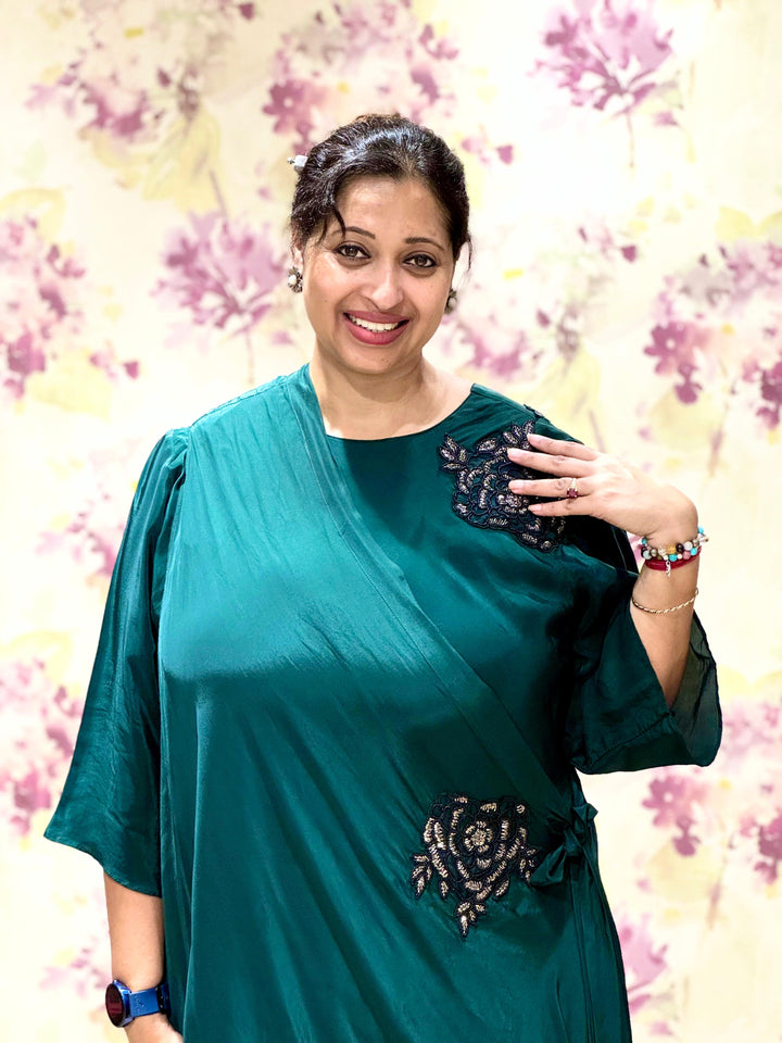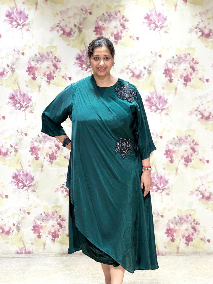 Pure soft crepe silk tunic ,comes with tie knot seperate drape .Hand work motifs done on shoulder and drape....Prefect for small get together.