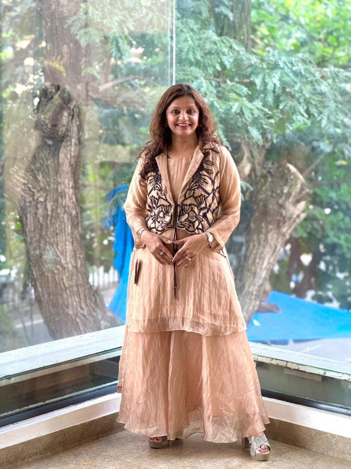 Pure glass tissue sleeveless short kurta with hi-low collared jacket with intricate handwork and comfort fit tissue pants.