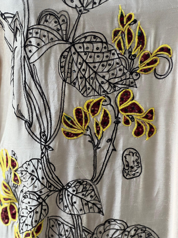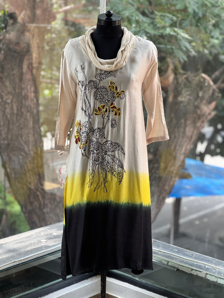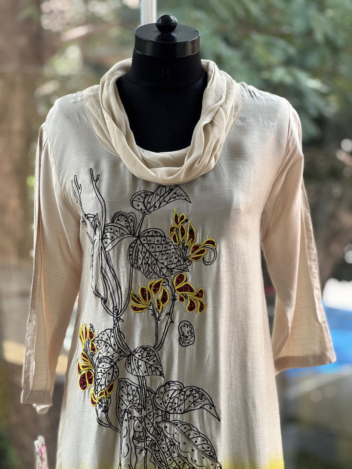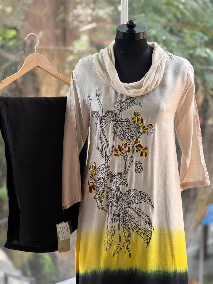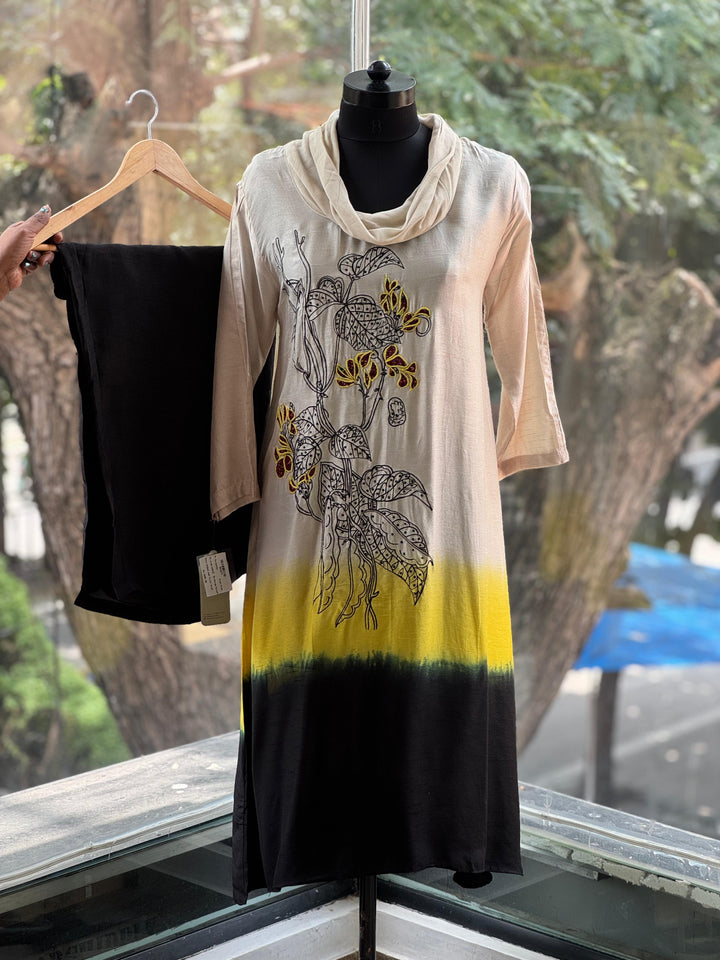 Pure silk colour block embroidered cowl neck kurta with comfort fit pants.
