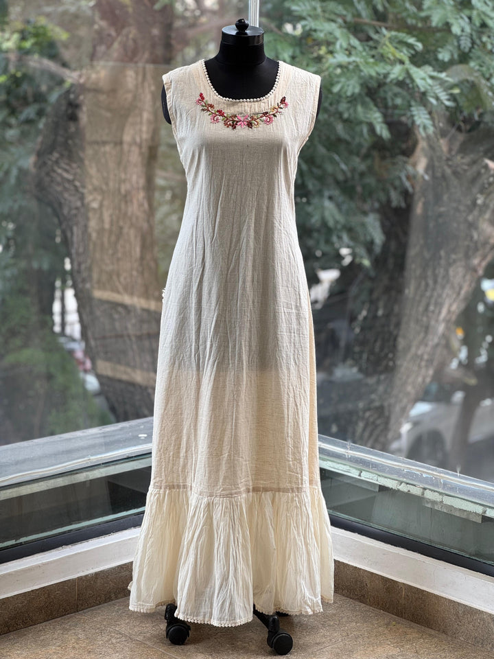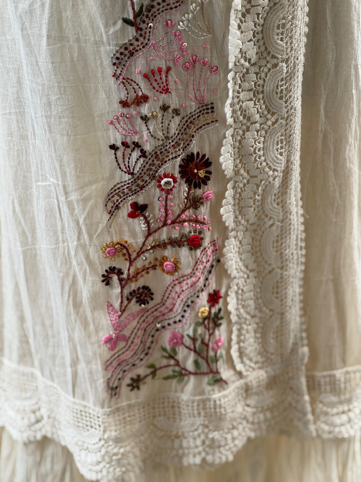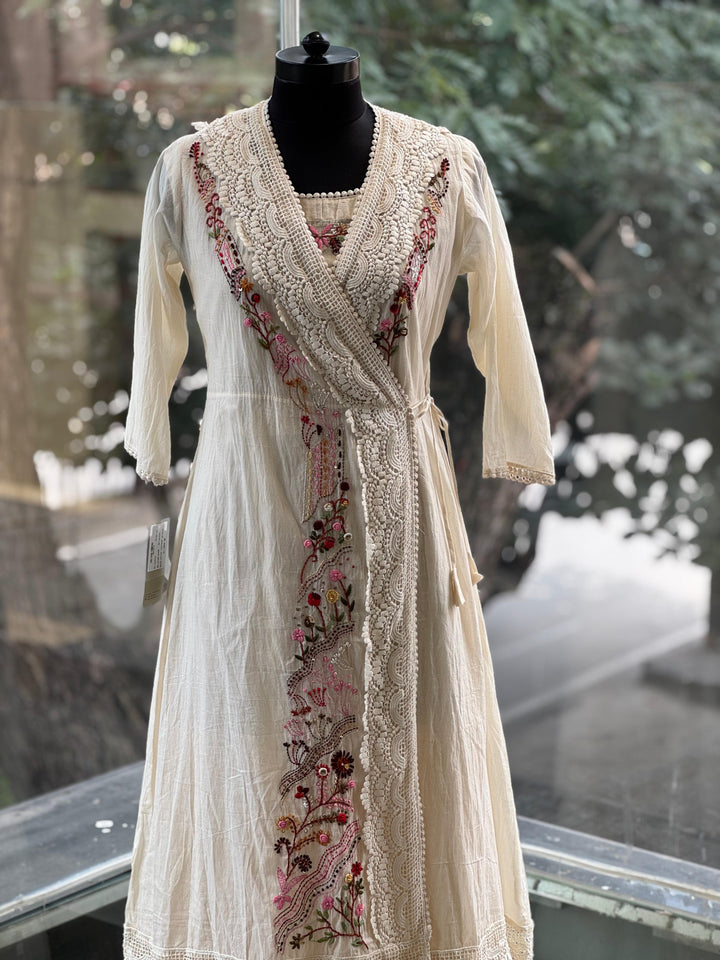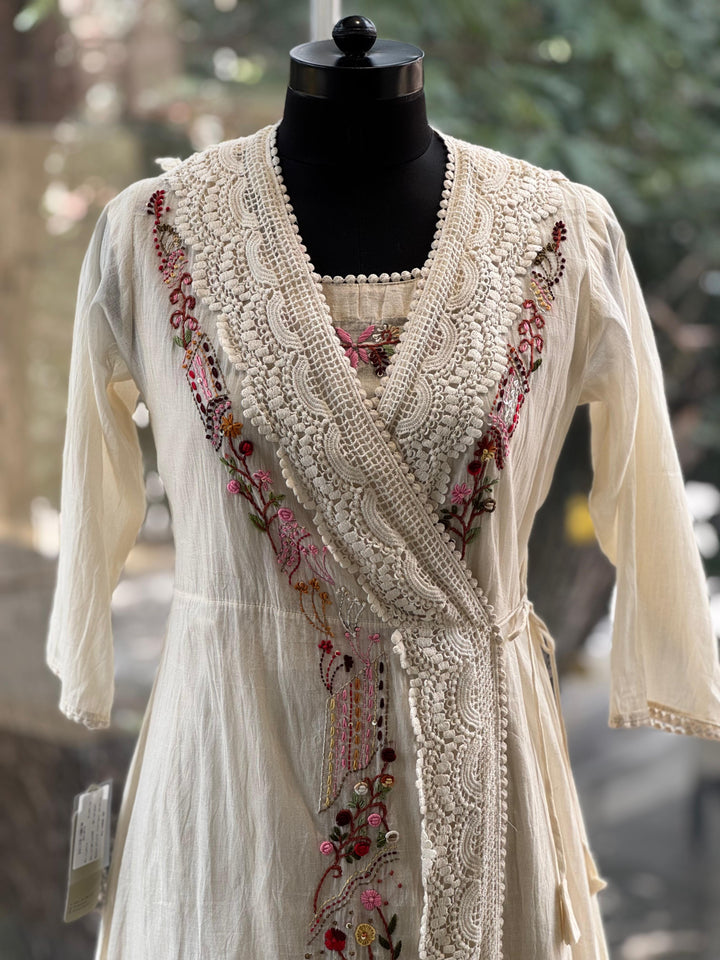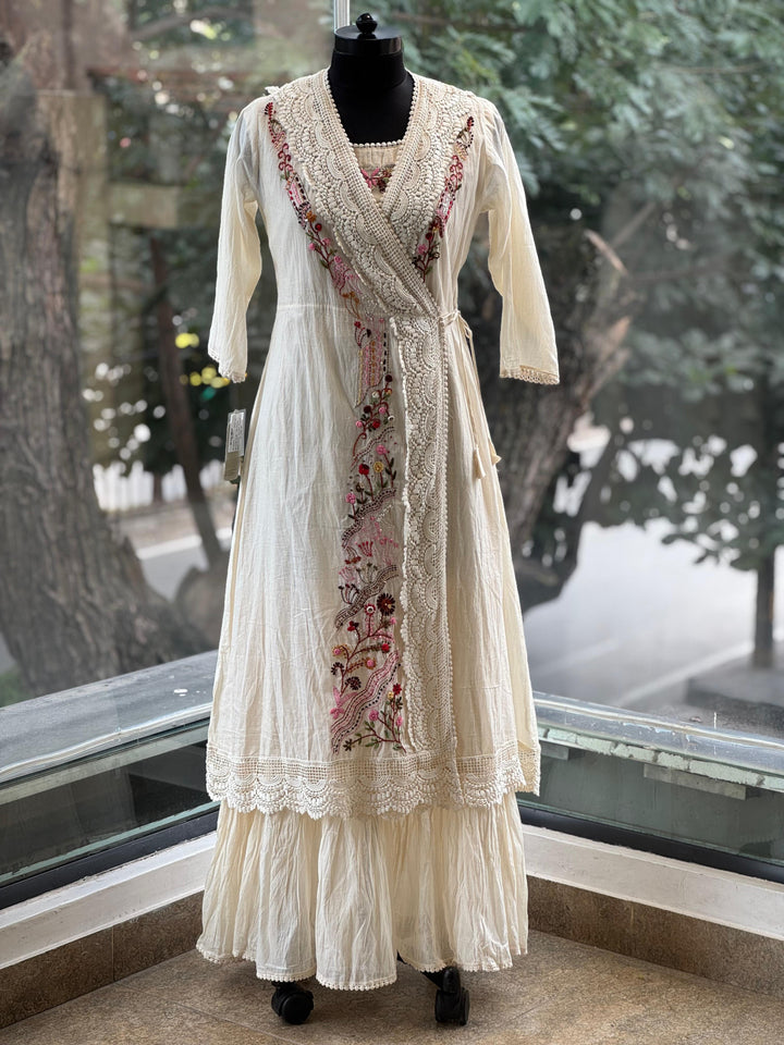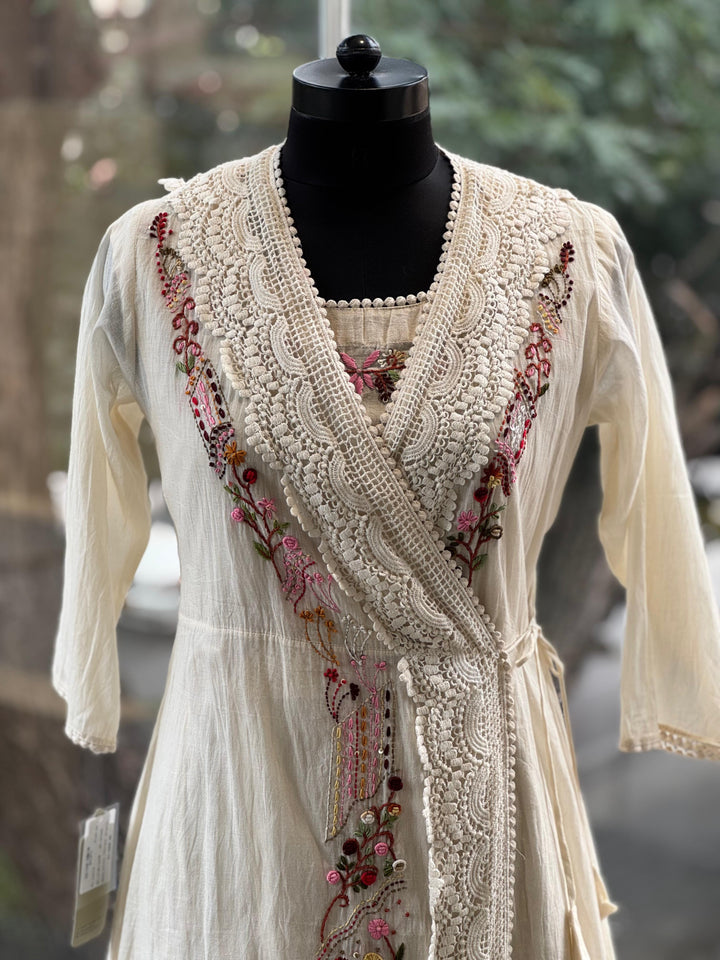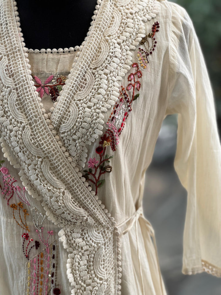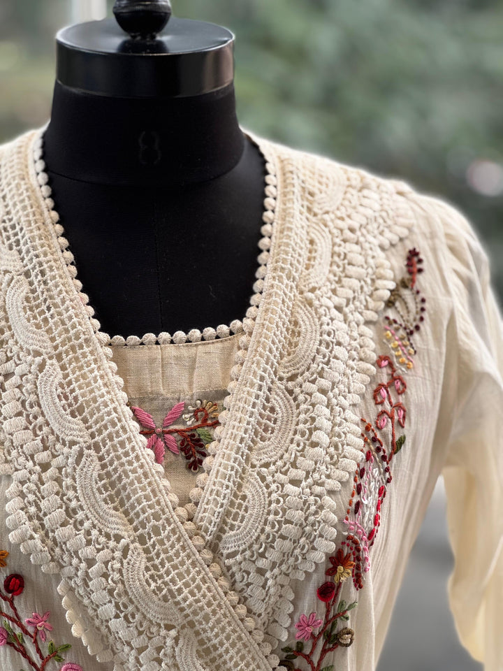 Pure mul anghrakha style tunic with crochia lace detailling & hand embroidered work. Comes with mul sleeveless embroidered yolk inner.