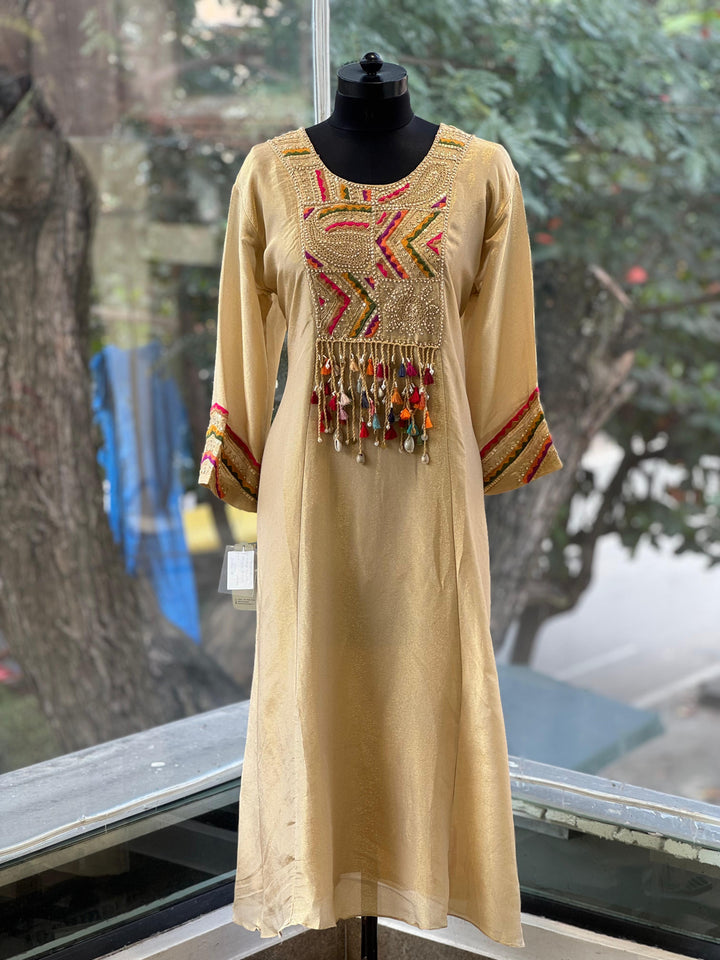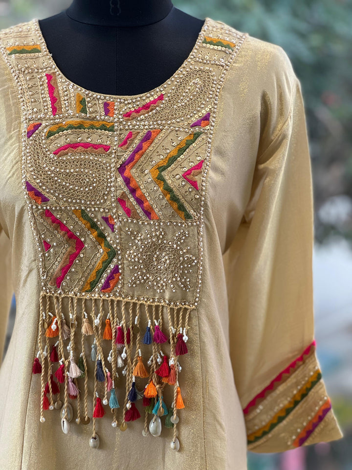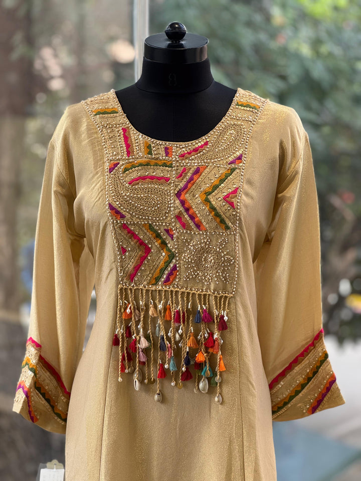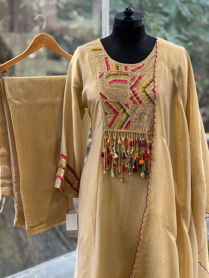 A Symbol of timeless tradition and modern luxury, this golden pure soft tissue ethnic suit is perfect for women who appreciates classic beauty with tassels hand work yolk.
