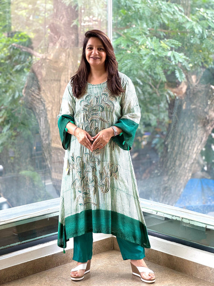 Pure silk loop neck leaf embroidered asymmetrical kurta with plain straight comfort fit pants.