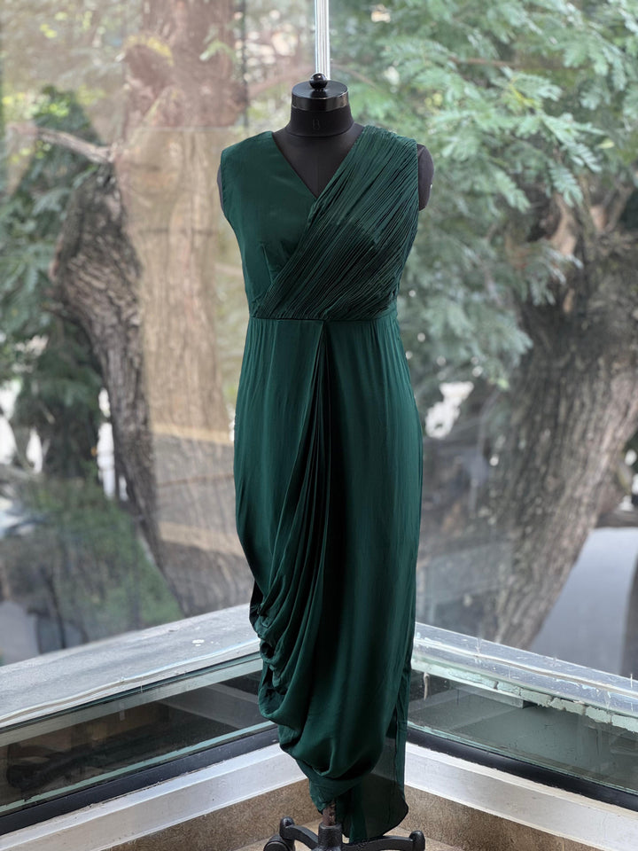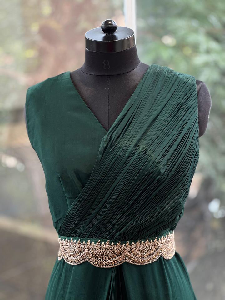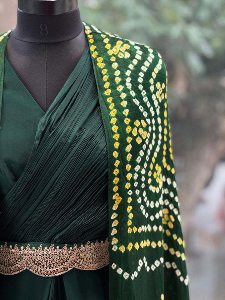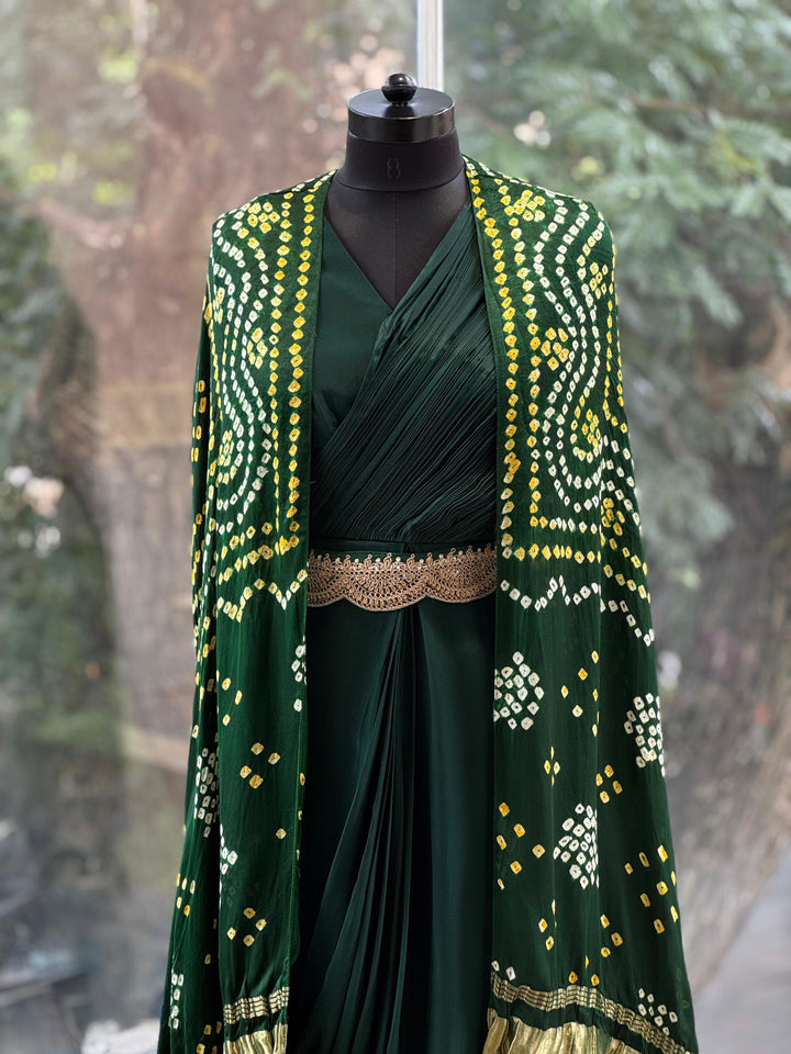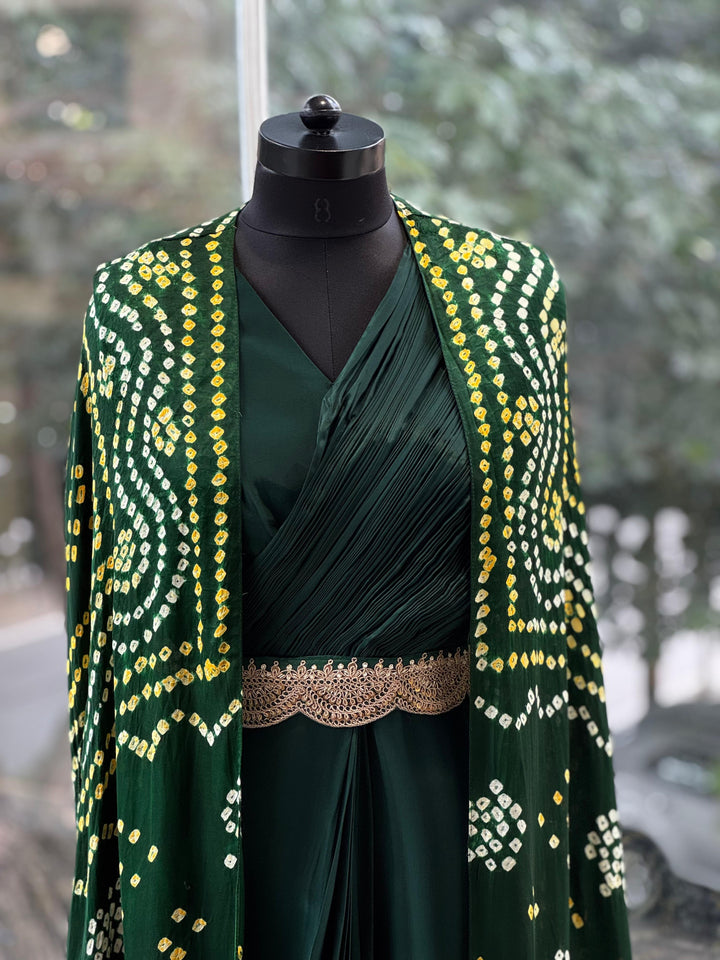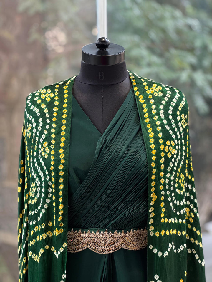 Pure silk sleeveless V pleated neck cowl tunic with pure gajji silk original bandhej cape with detachable work belt.