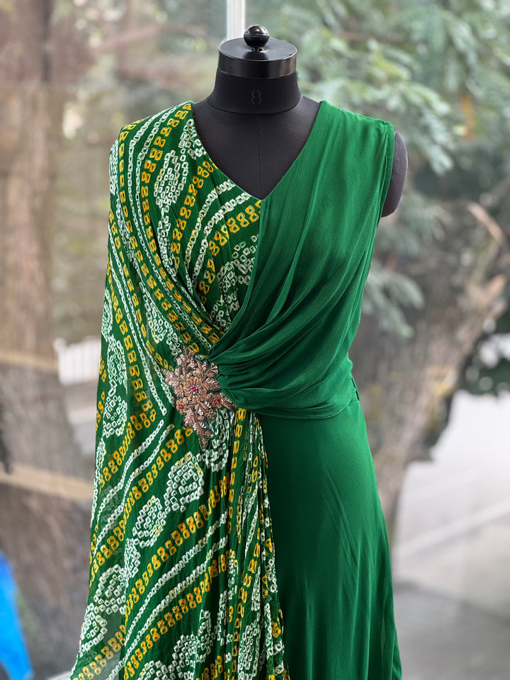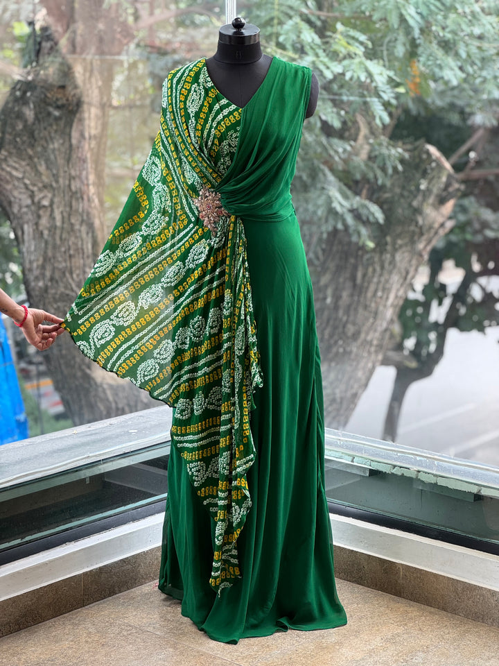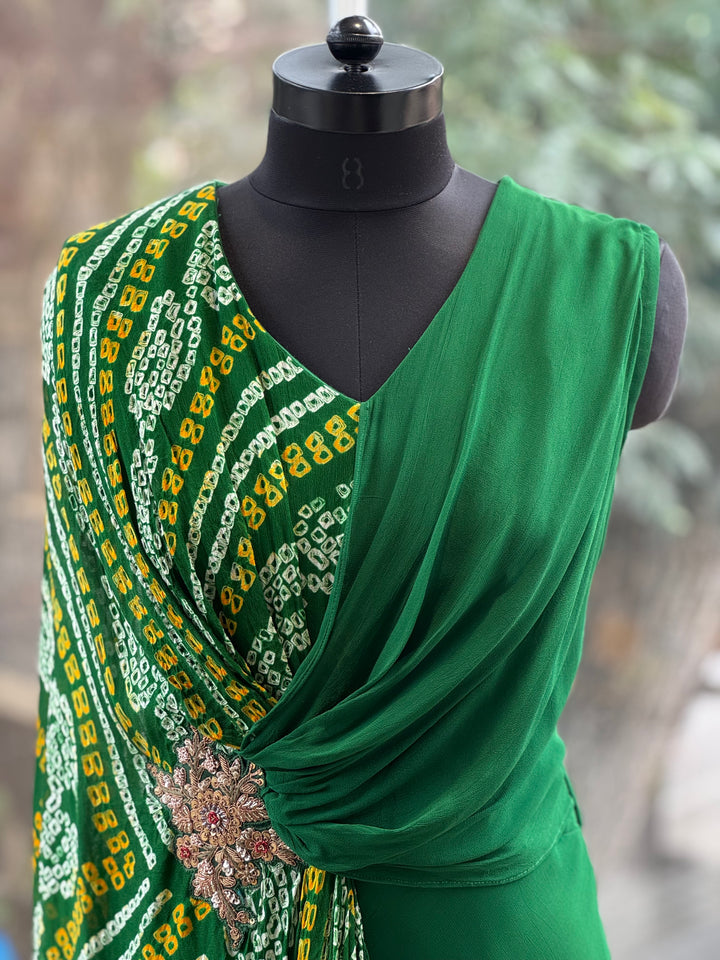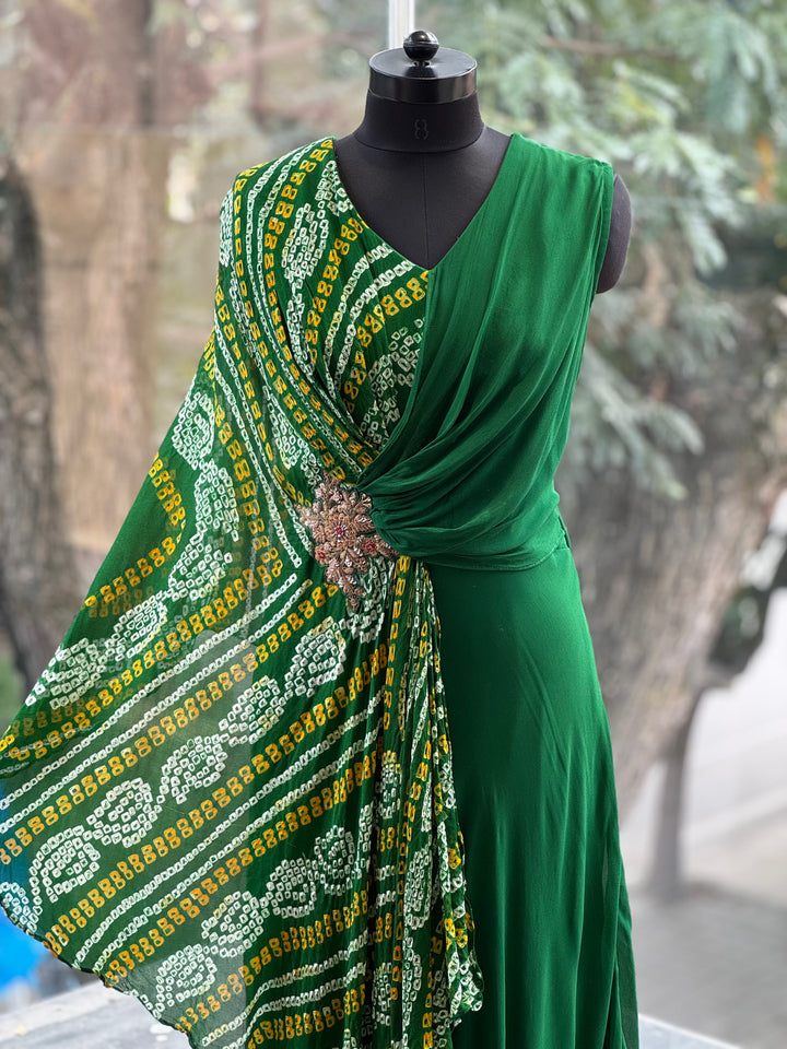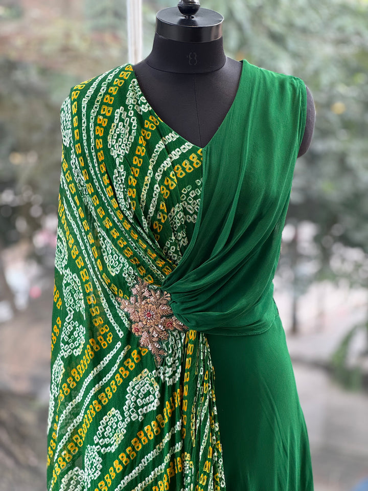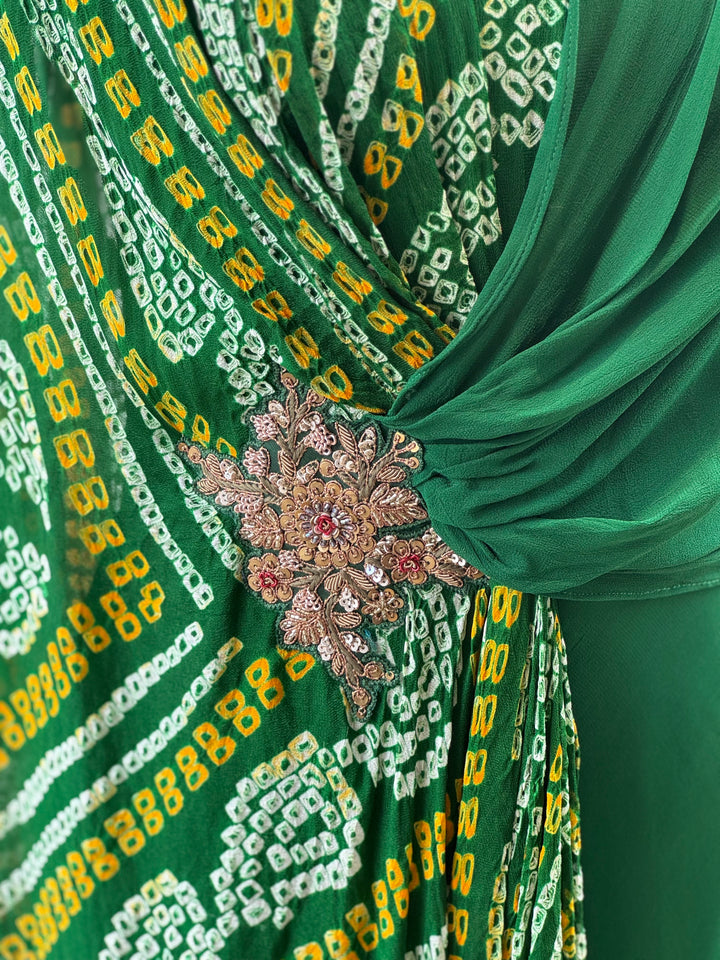 Pure georgette 1 side Bandhej flap gown with intricate work on waist area.