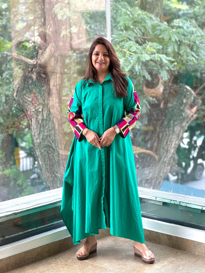 Mercerized cotton collared neck handkerchief cut tunic with aplique colorful sleeves.