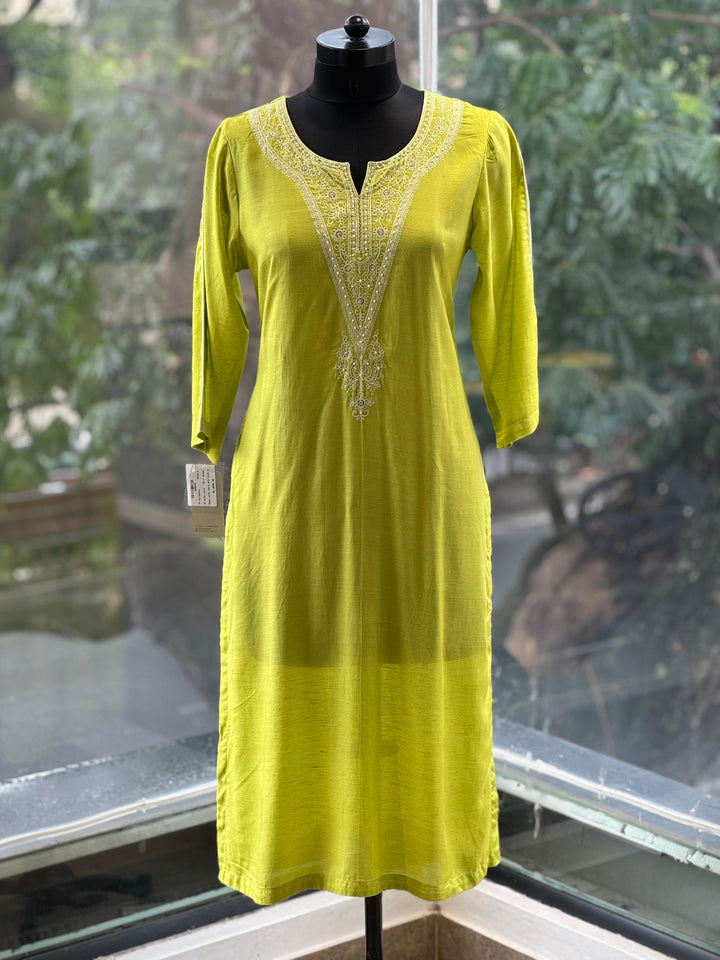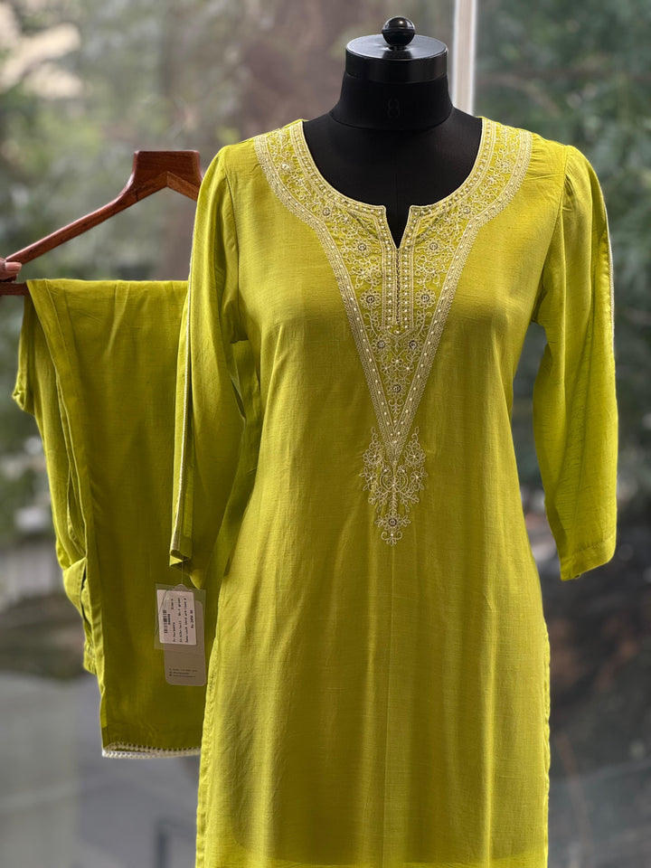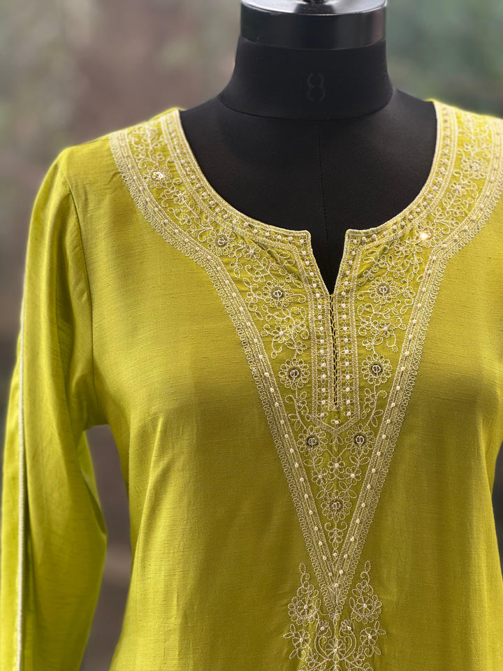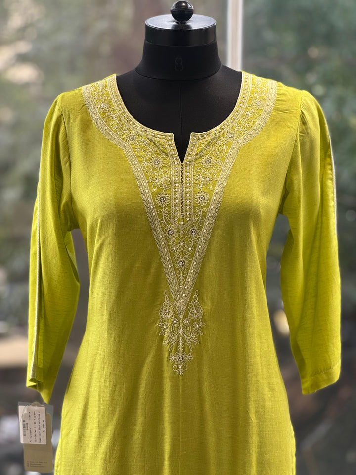 Pure cotton embroidered yolk kurta with plain straight comfort fit pants.