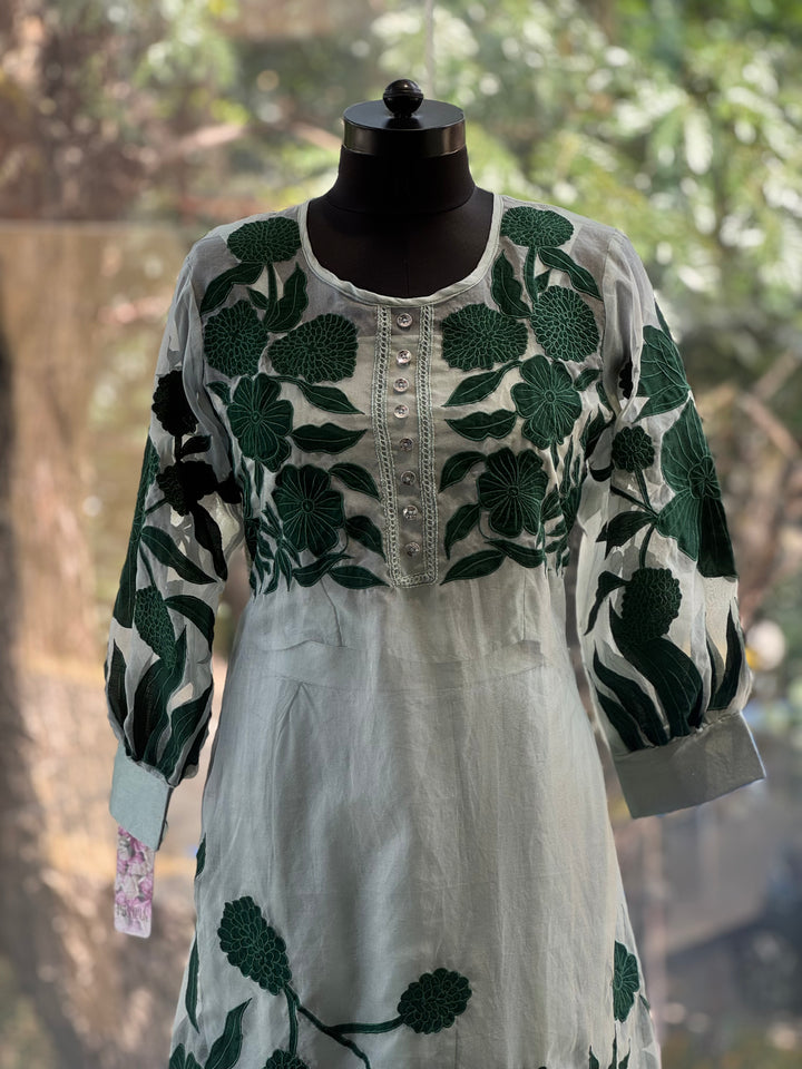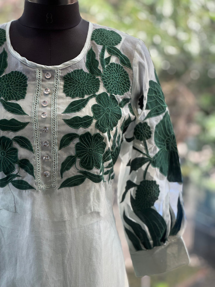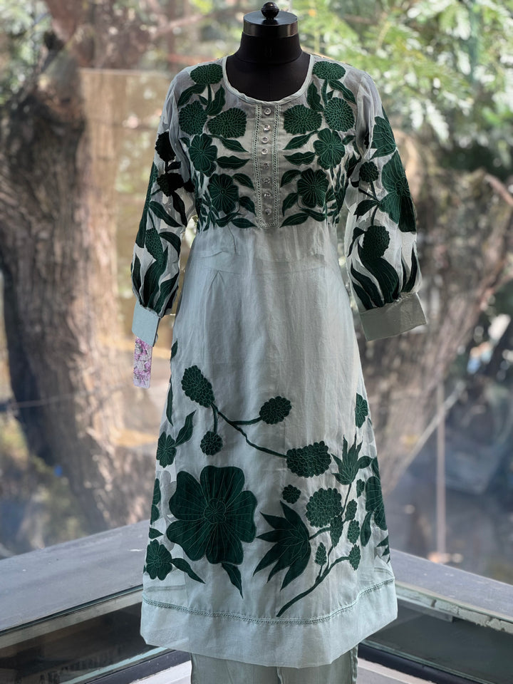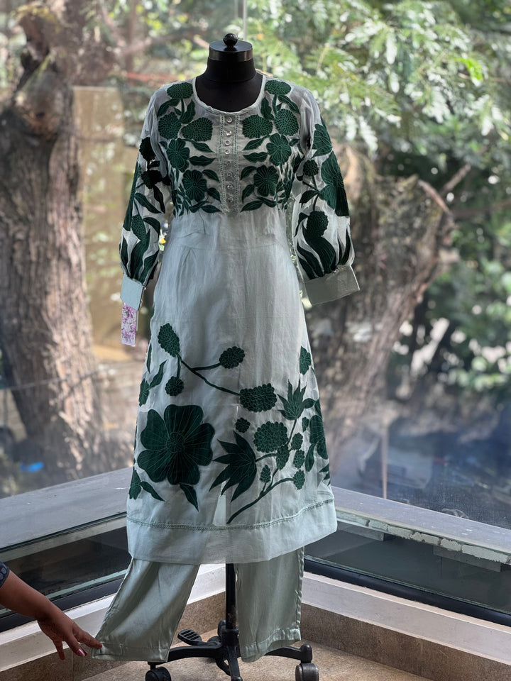 Pure soft organza sea green patch work kurta with sleeveless short inner and comfort fit silk pants.