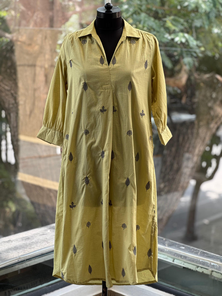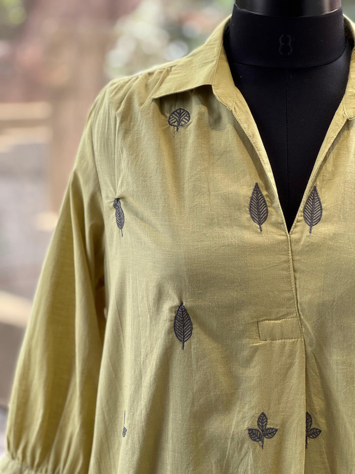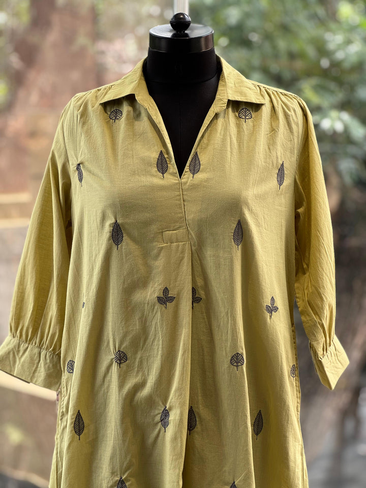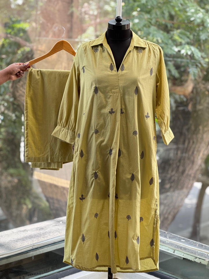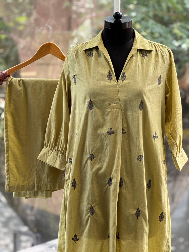 Pure cotton leaf embroidered collared neck kurta with comfort fit pants .
