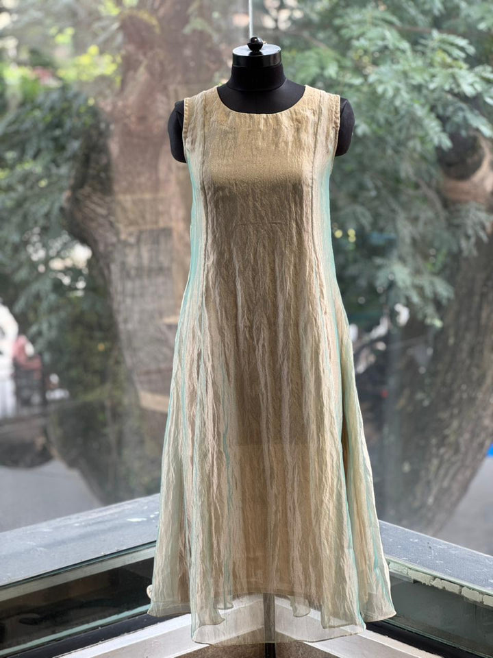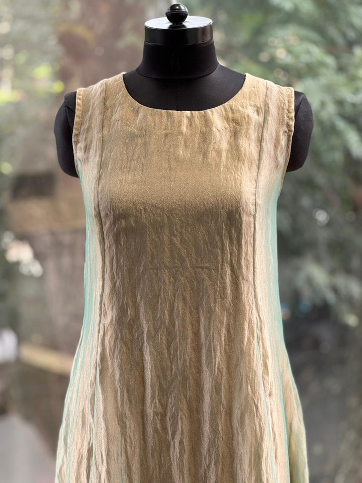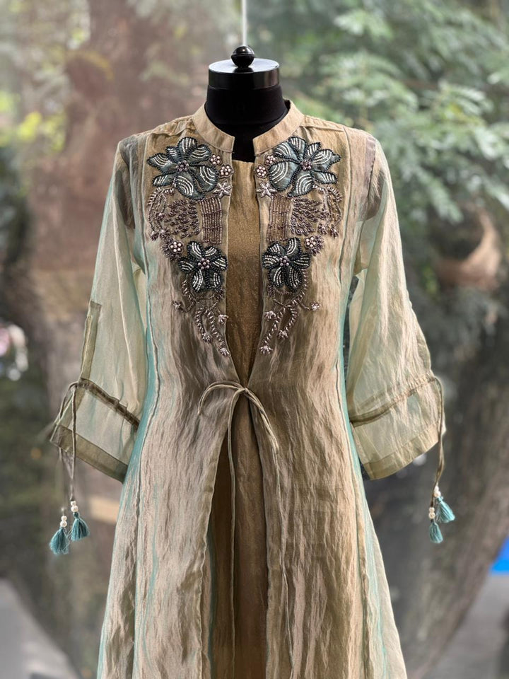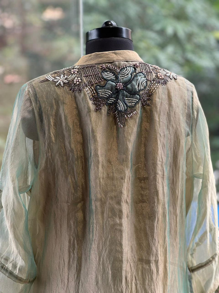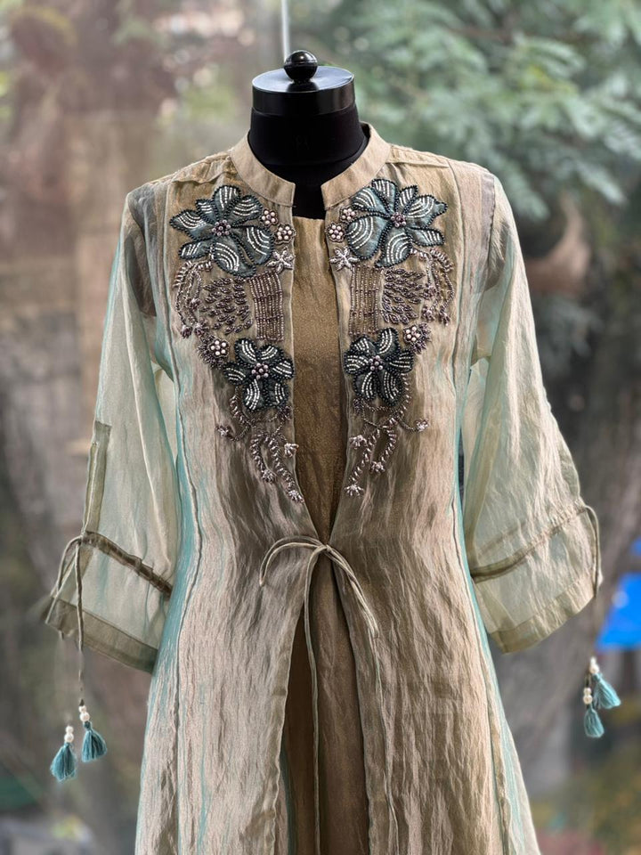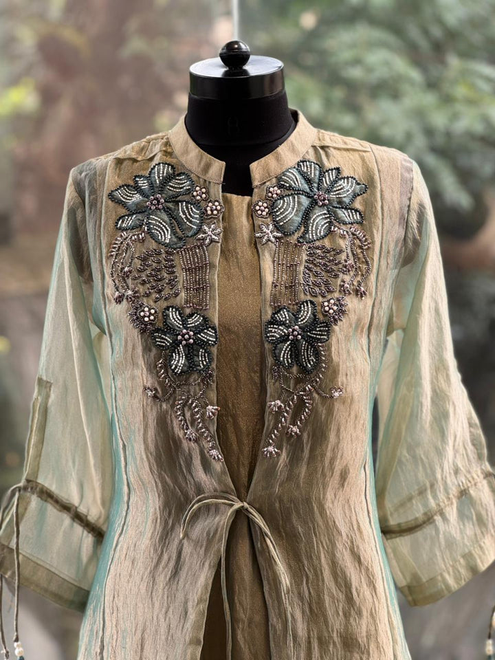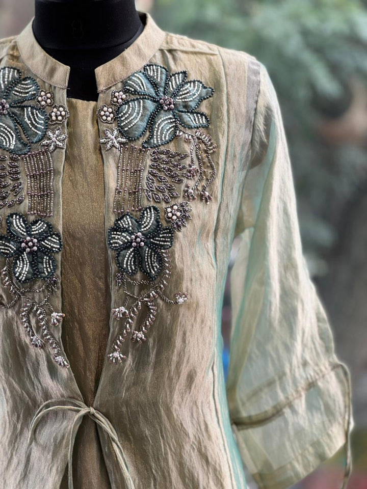 Pure glass greenesh tunic comes with long sleeves inner ,intecrete with glass tissue work jacket.