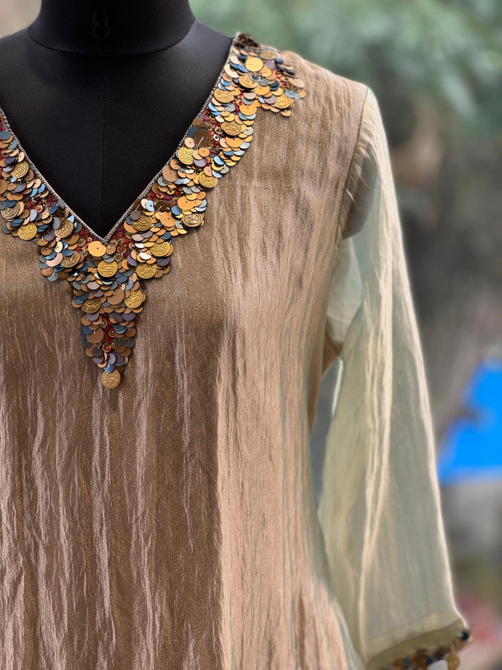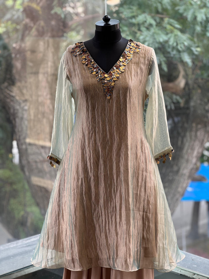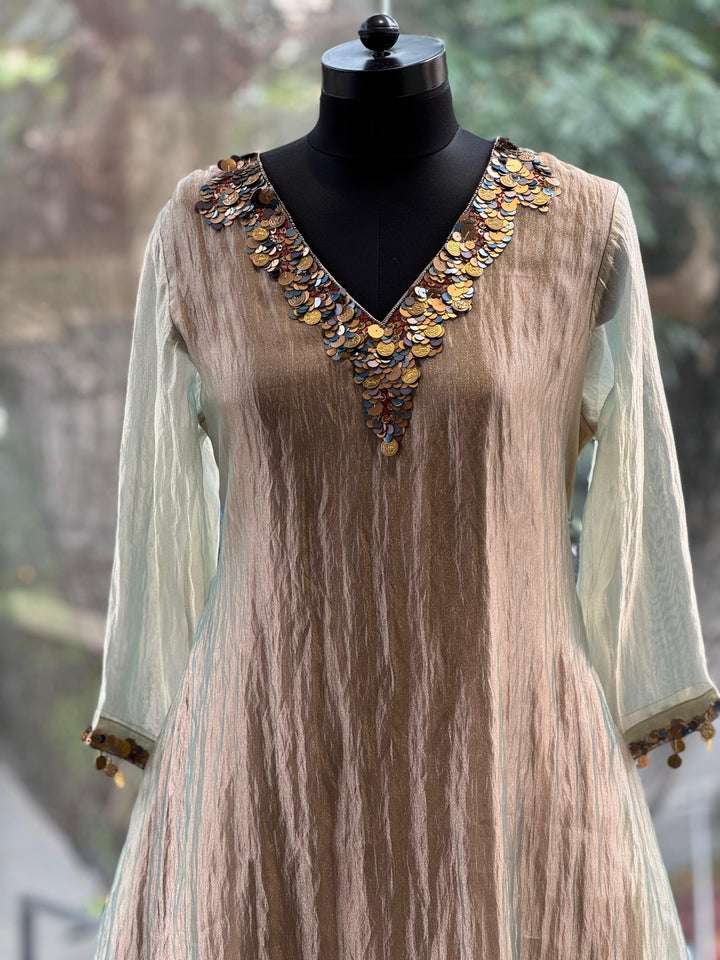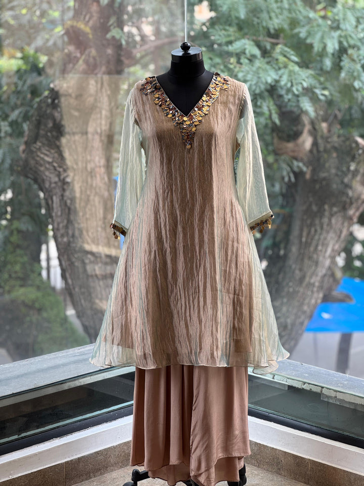 Pure glass tissue greenish brown V neck kurta with neckline detailing and soft satin silk wide leg pants.