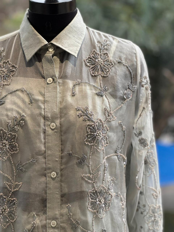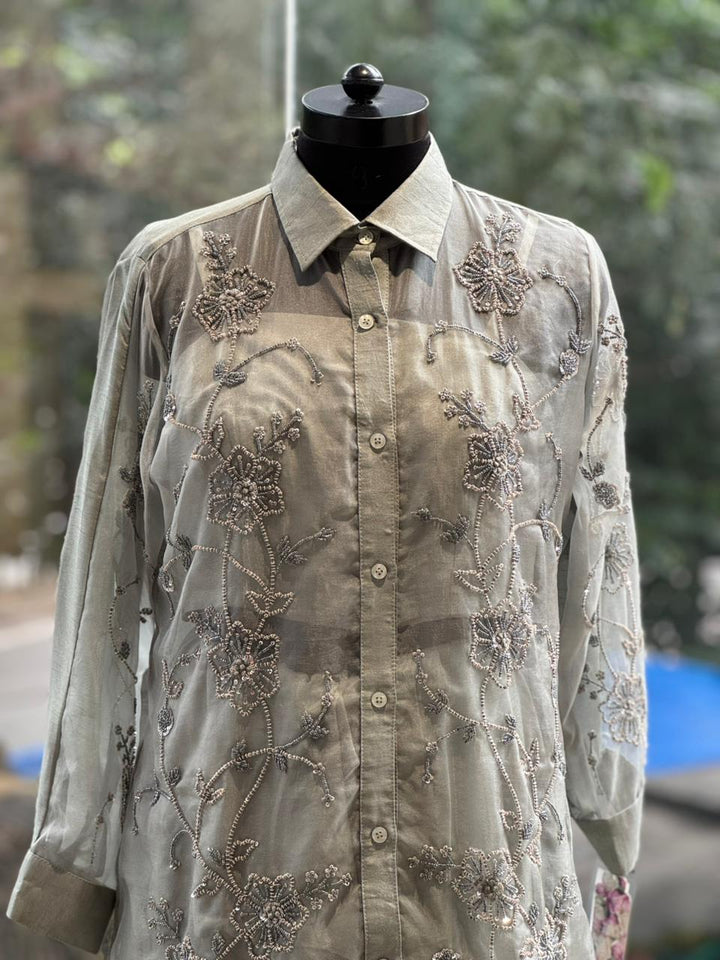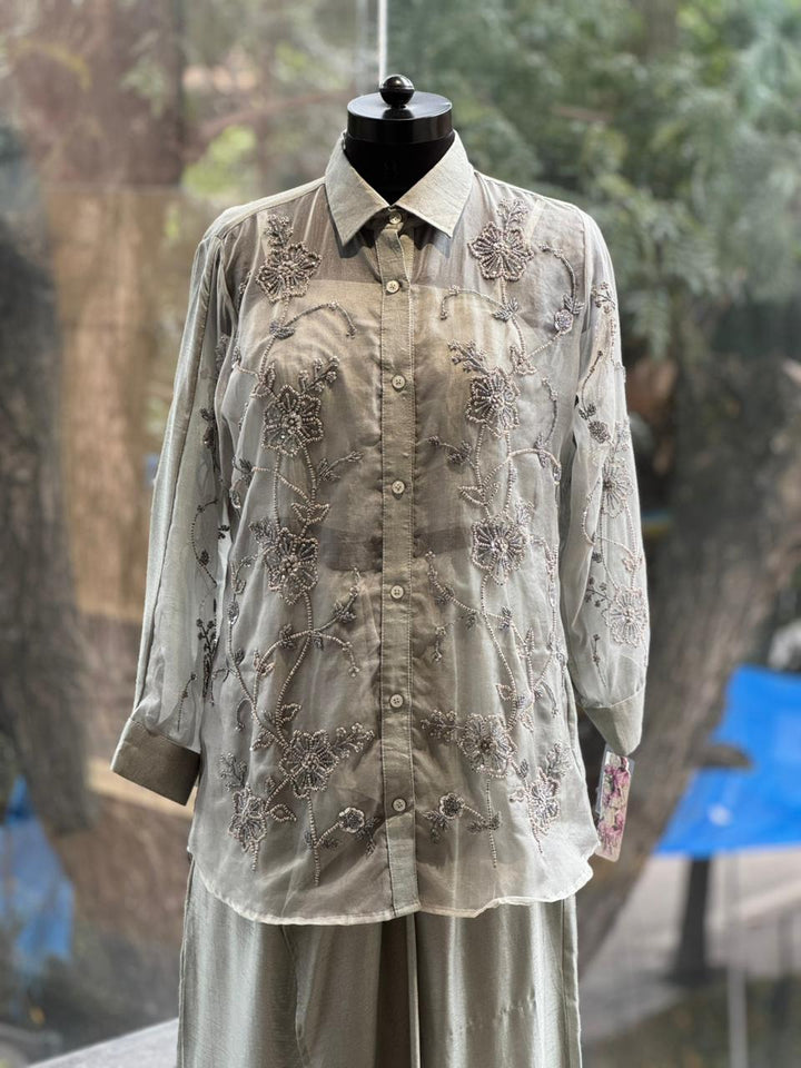 Elegant and effortlessly chic, this light grey ensemble features a sheer embroidered button-down shirt paired with wide-leg palazzo pants.
