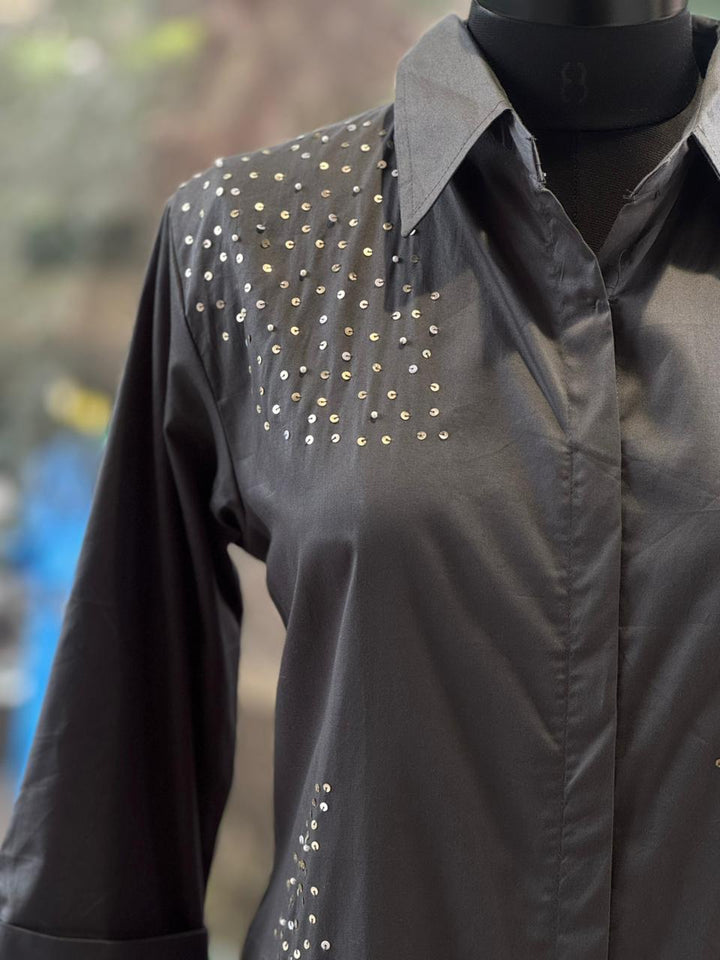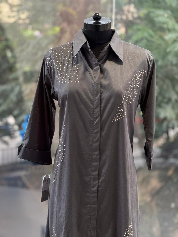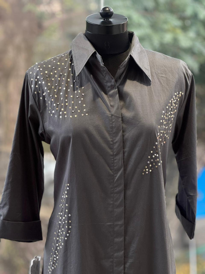 Stylish grey shirt dress featuring elegant sequin detailing on the front and sleeves. Designed with a classic collar, button-down front, and 3/4 sleeves... perfect for both casual and semi-formal occasions.