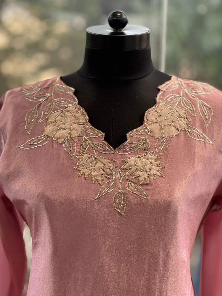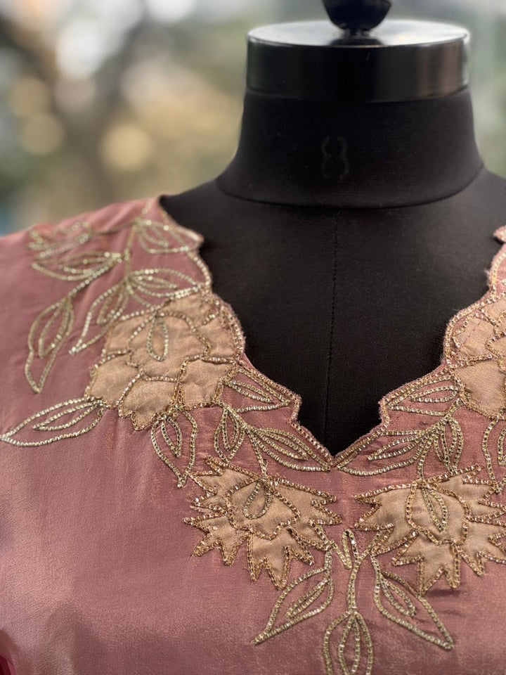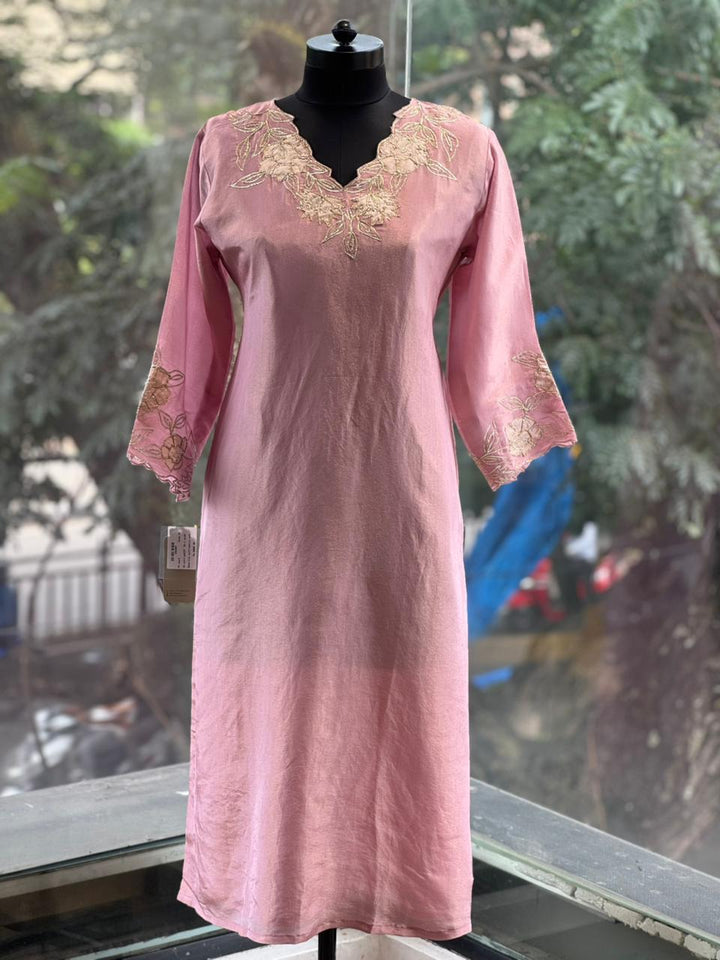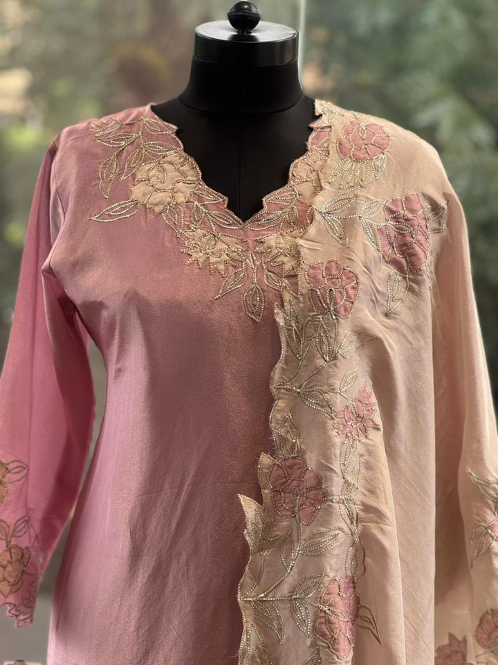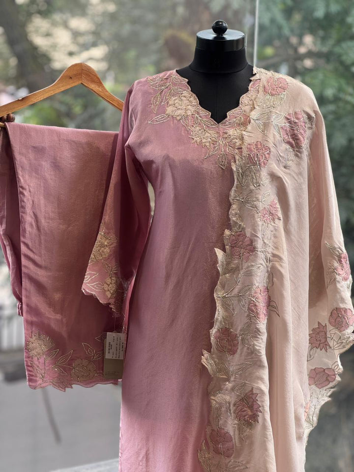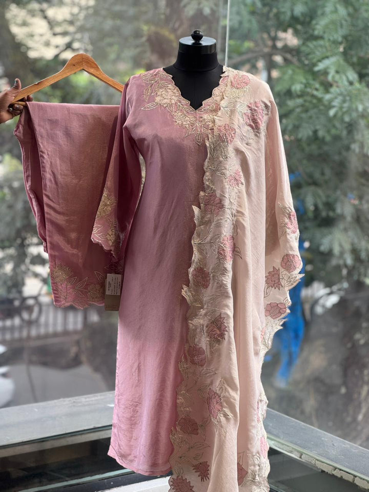 Pure tissue straight cut kurta with gota work detailing...comes with tissue contrast dupatta and comfort fit pants.