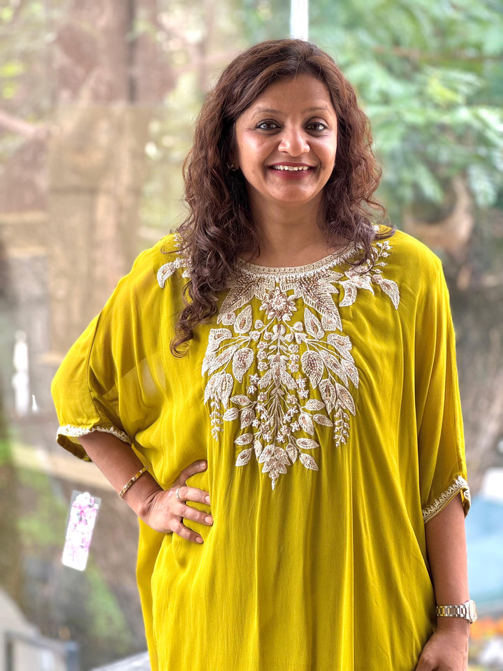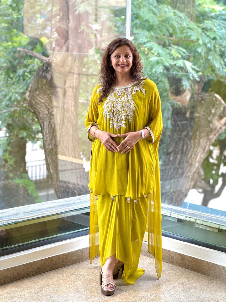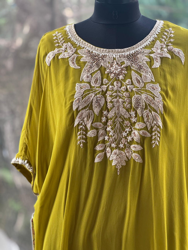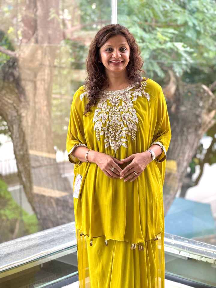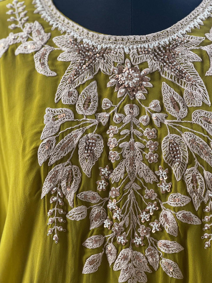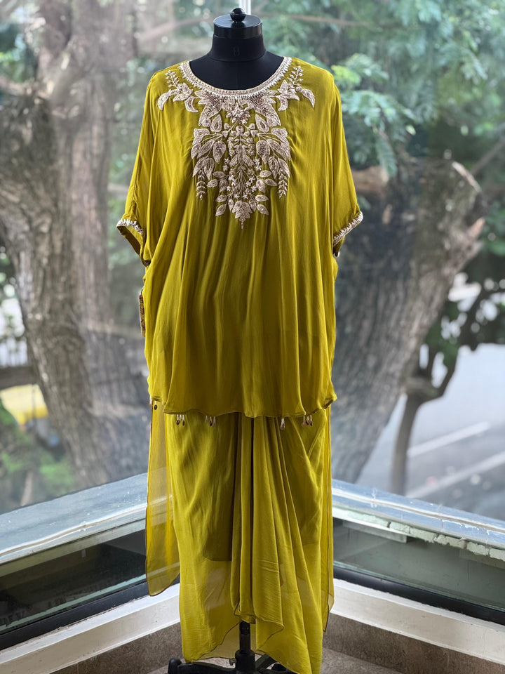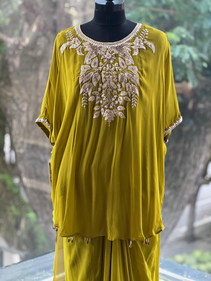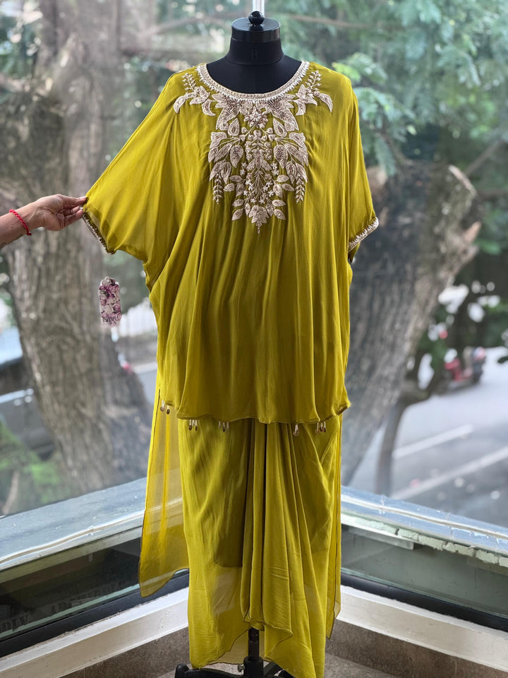 Pure georgette thread embroidered yolk kaftan top with plain front pleated skirt set.
