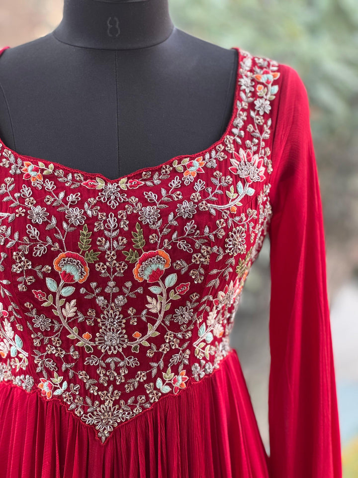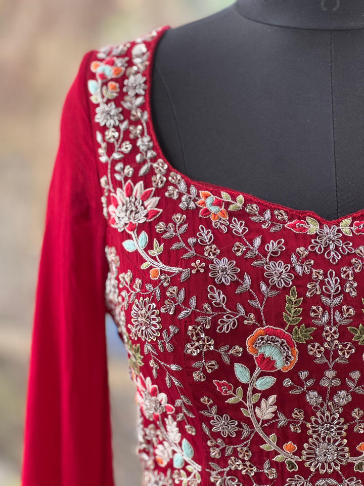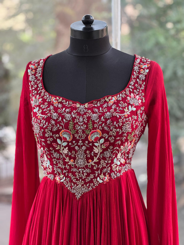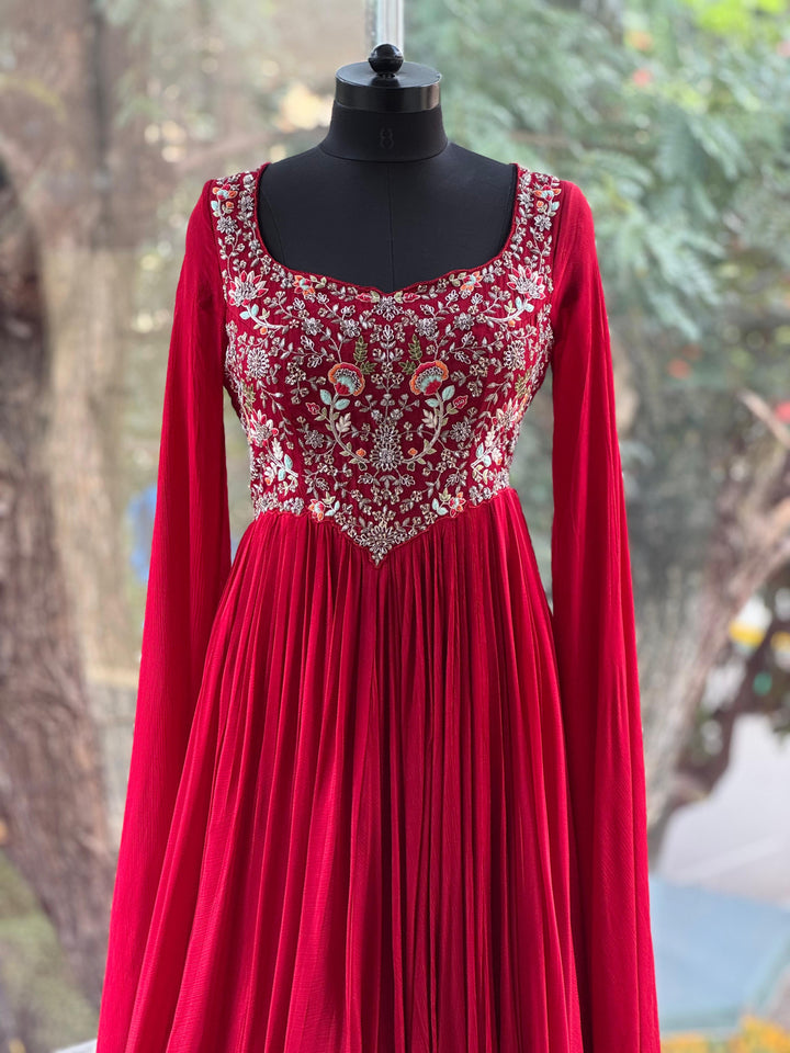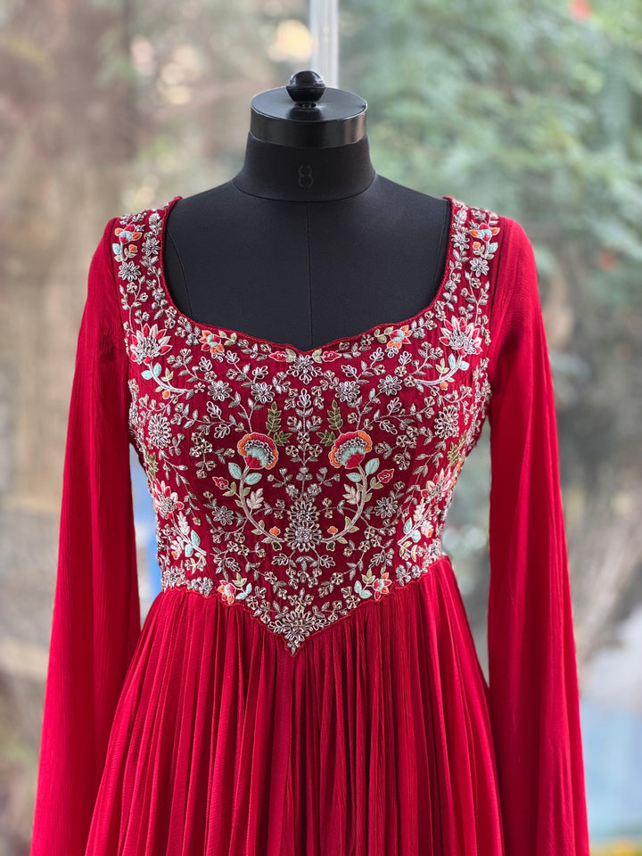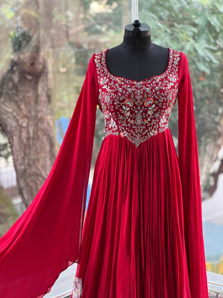 Pure crepe silk complete hand embroidered yolk gown with hi-low pattern and tail sleeves.