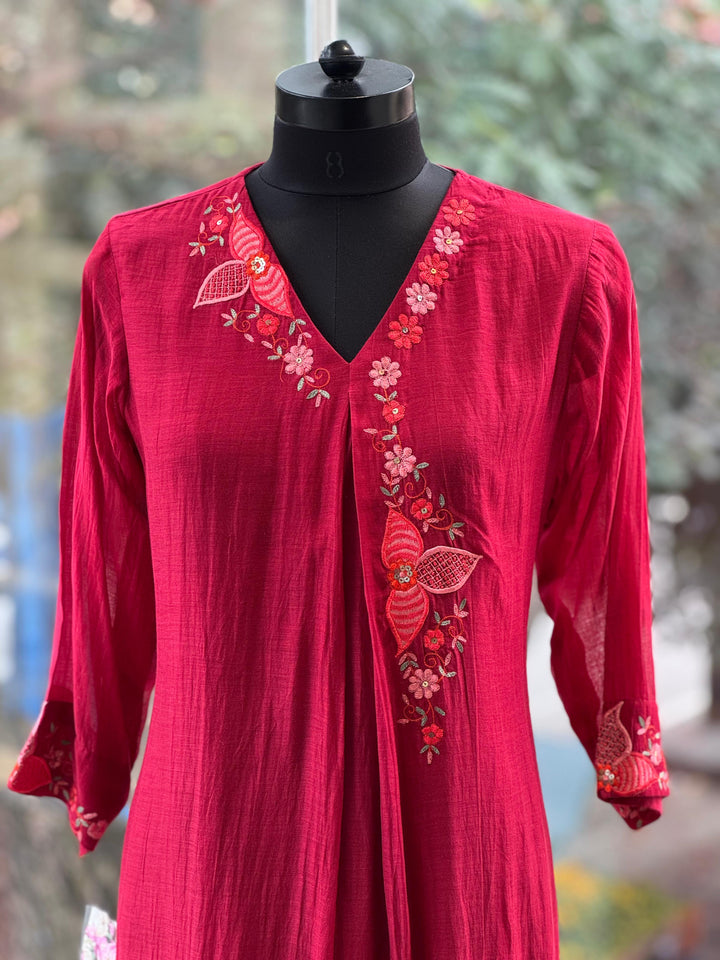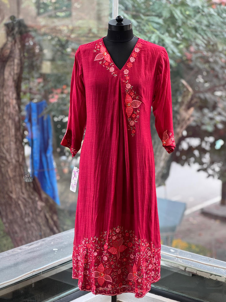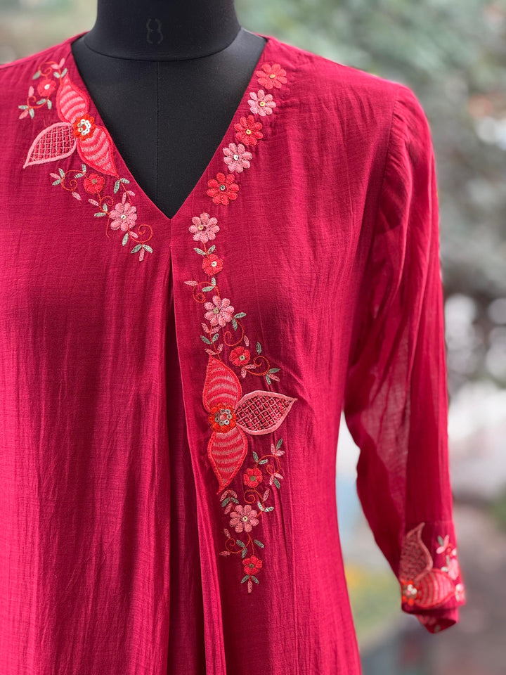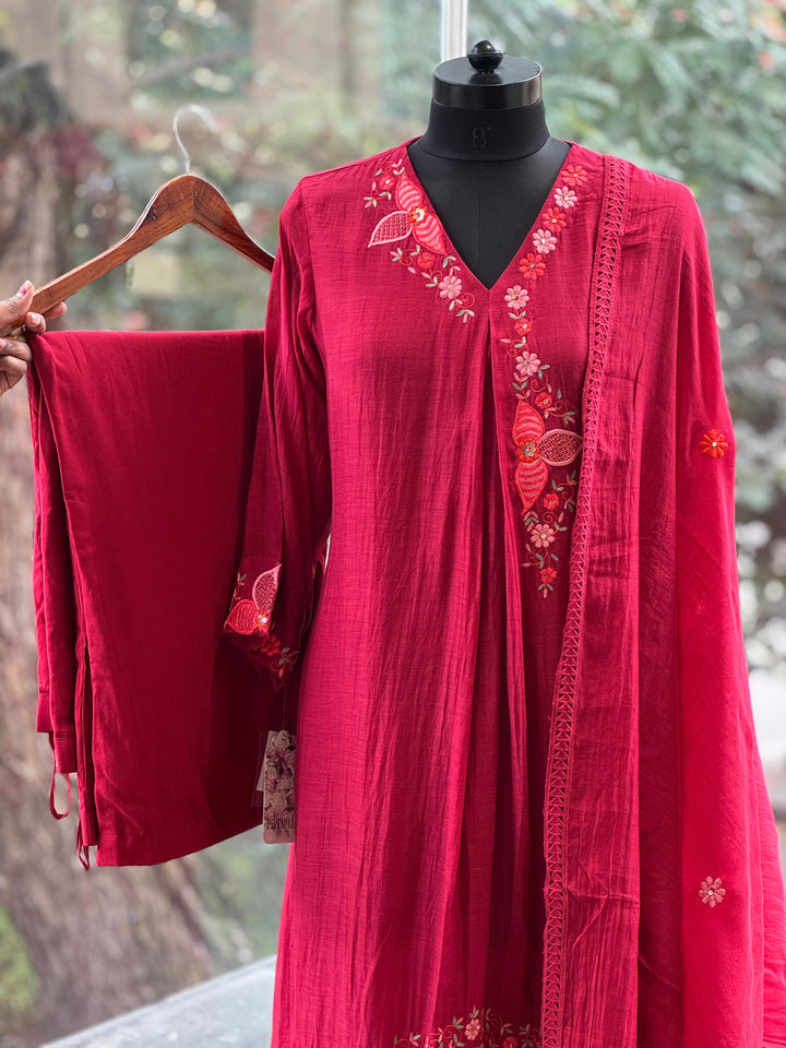Pure mul V neck kurta with front pleates. Comes with hand embroidery, comfort fit pants & mul dupatta with embroidered buttas.