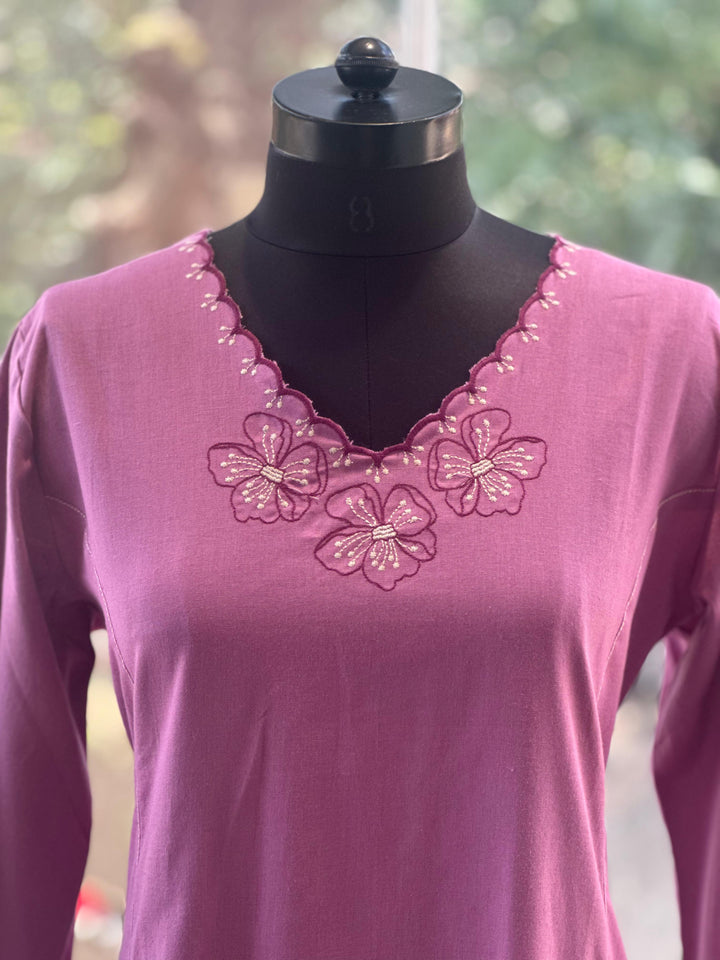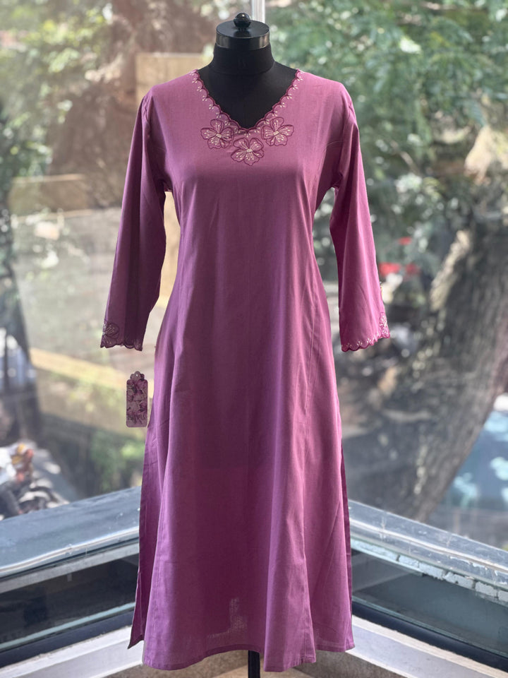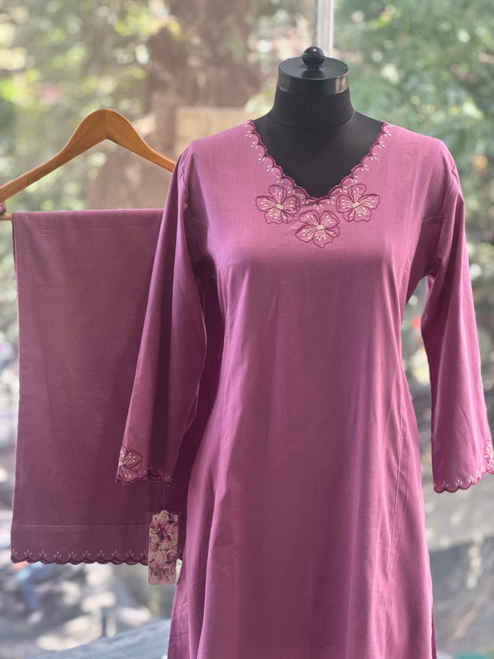 Handloom cotton v neck embroidery kurta with comfort fit pants.