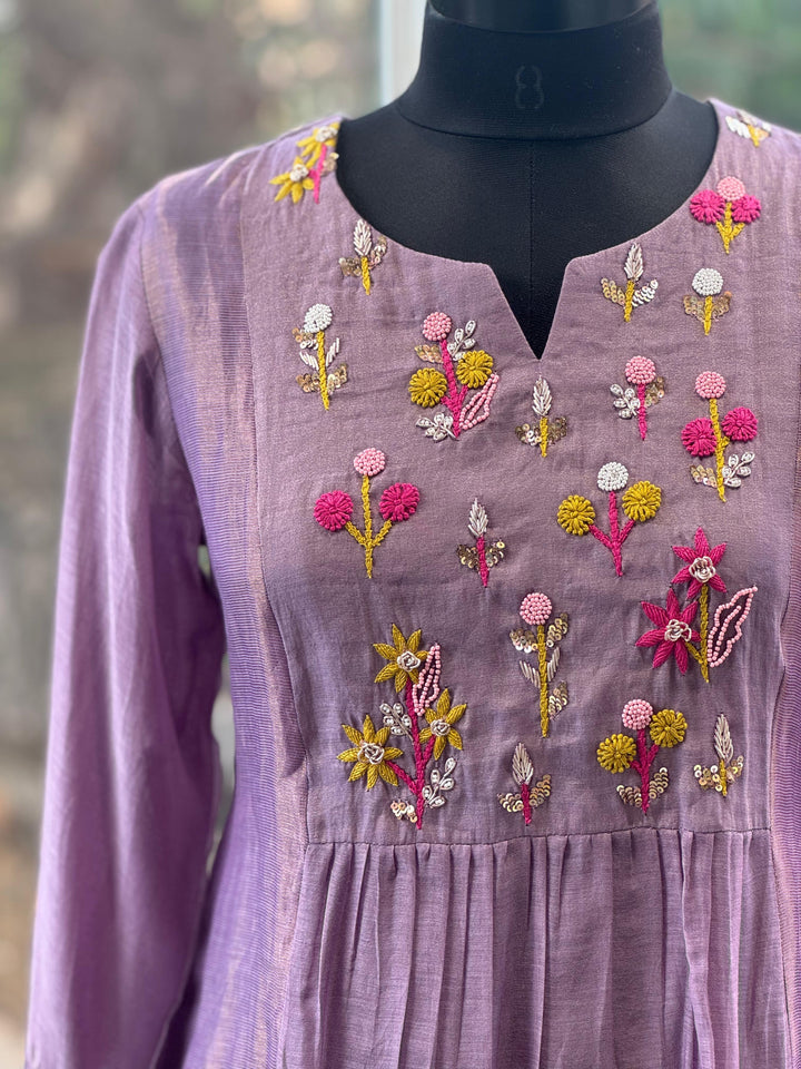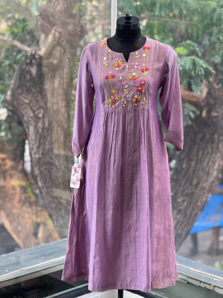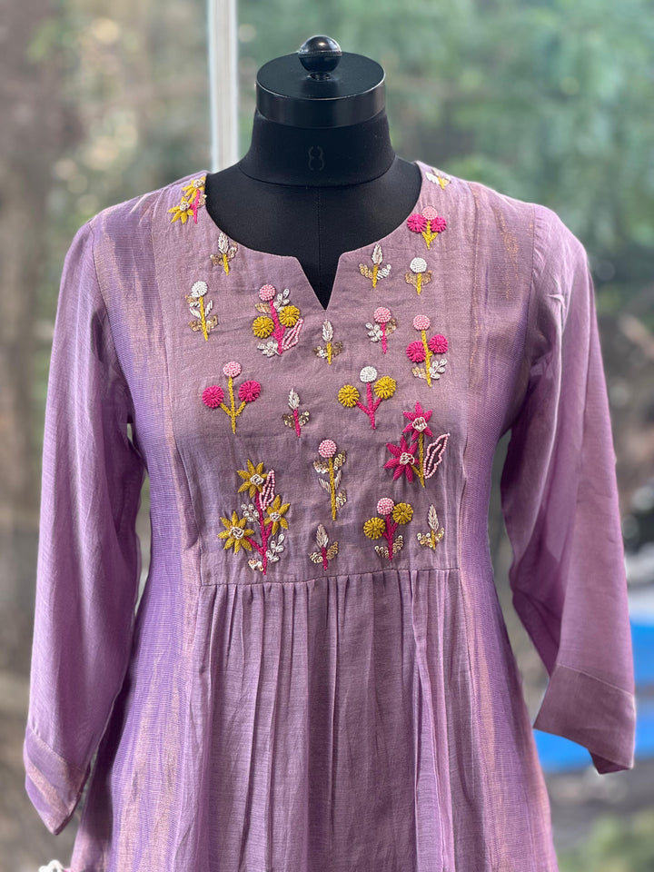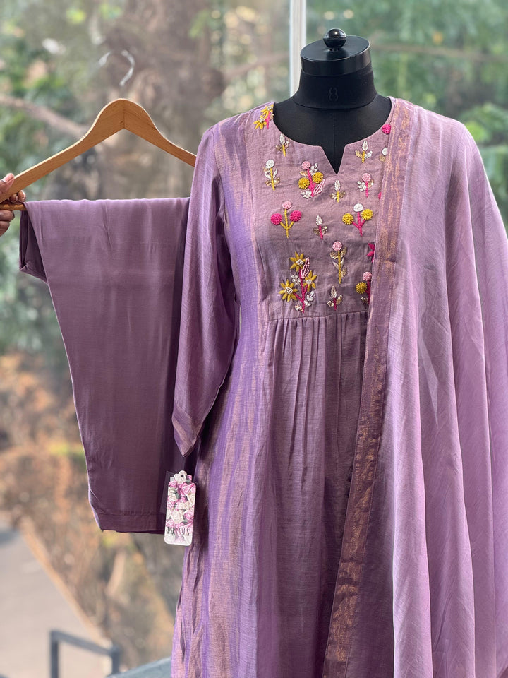 Pure mul Chanderi intricate yolk work kurta with comfort fit pants and dupatta.