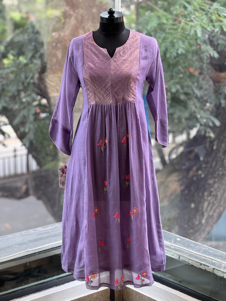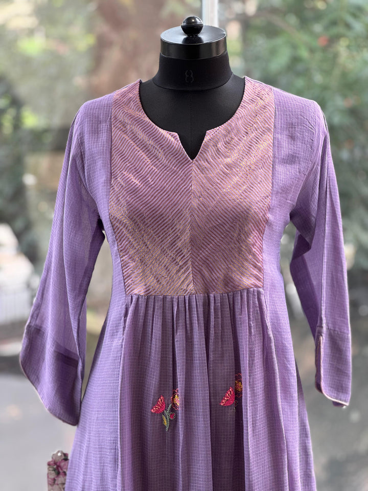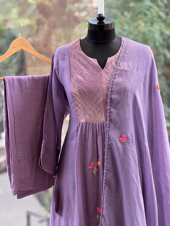 Pure Mul mauve Kurta with tissue yolk pannel with hand embroidary comfort fit pant and dupatta.