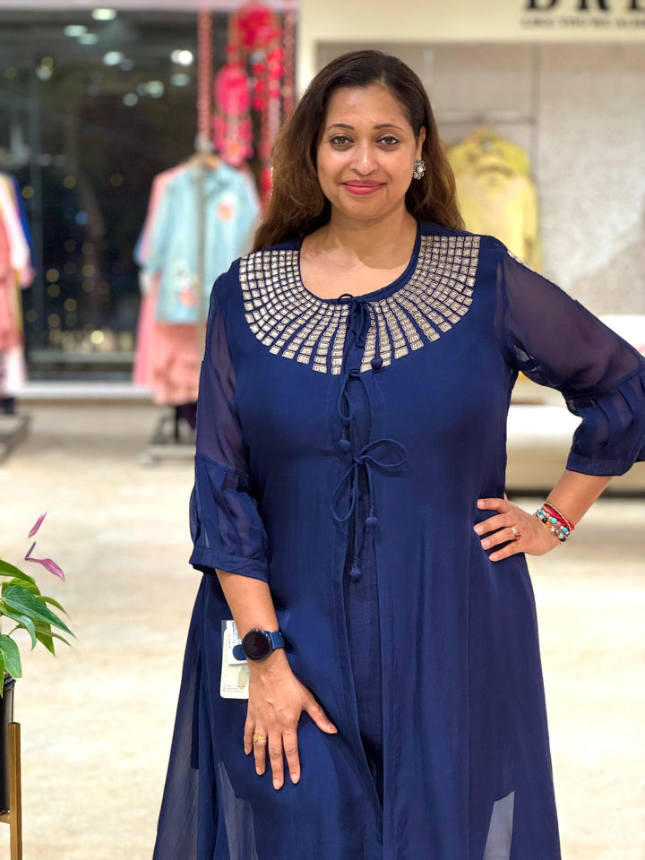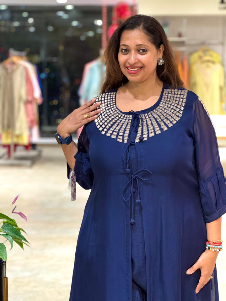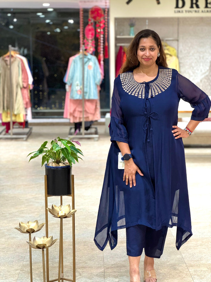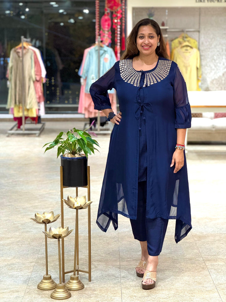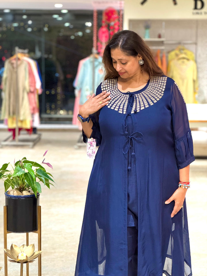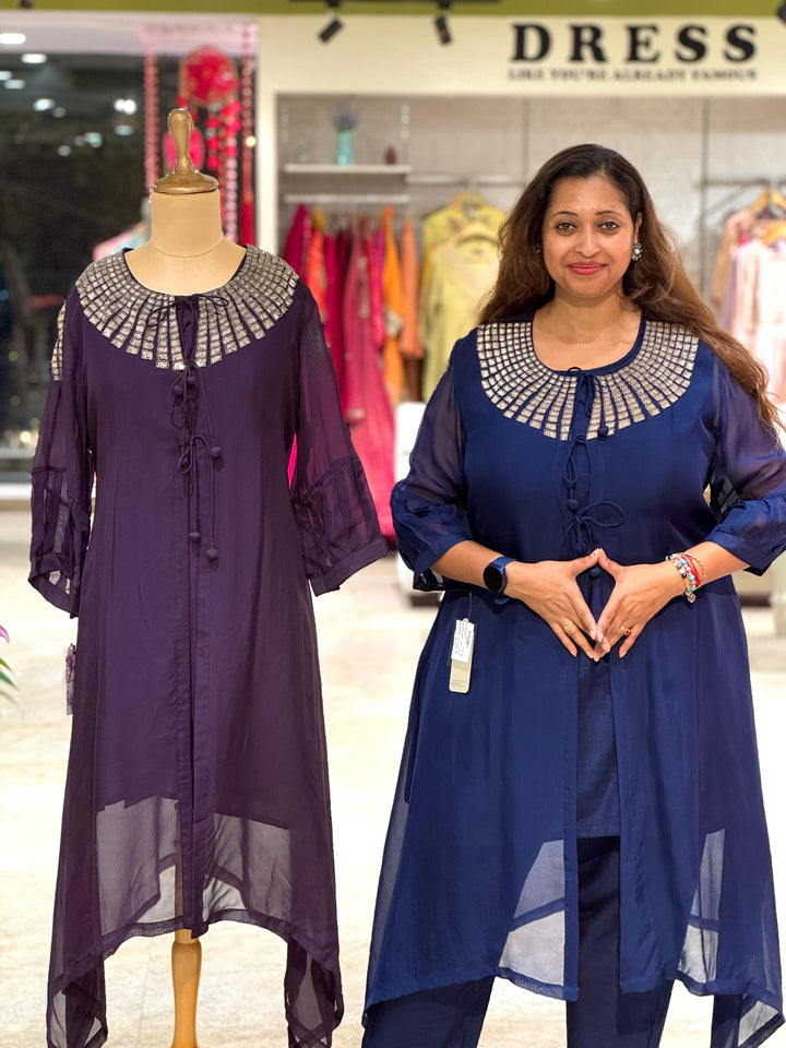 Plain silk short inner with same color pants,comes with soft silk organza stylish tunic with heavy yolk work.