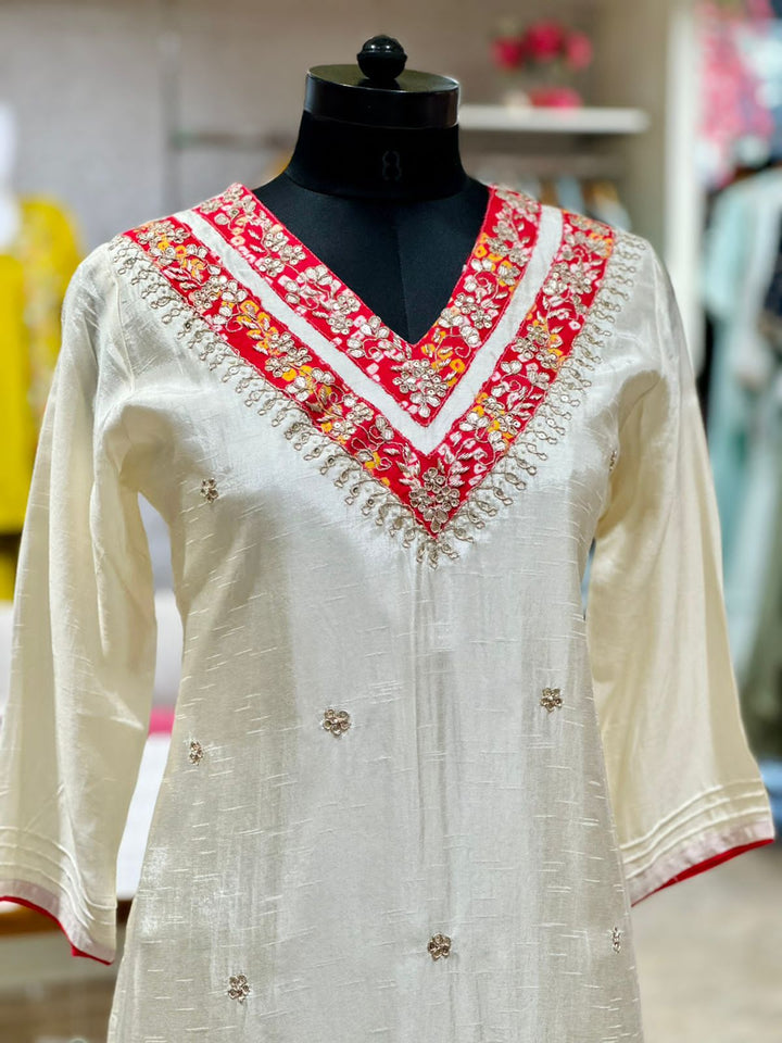 Pure silk gota v neck kurta with comfort pants and organza dupatta