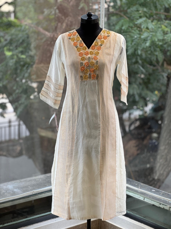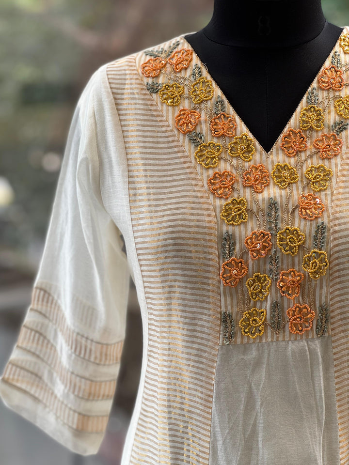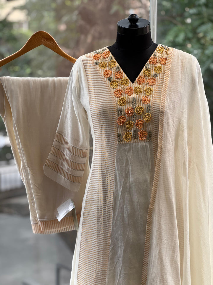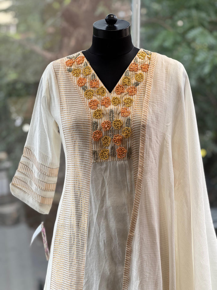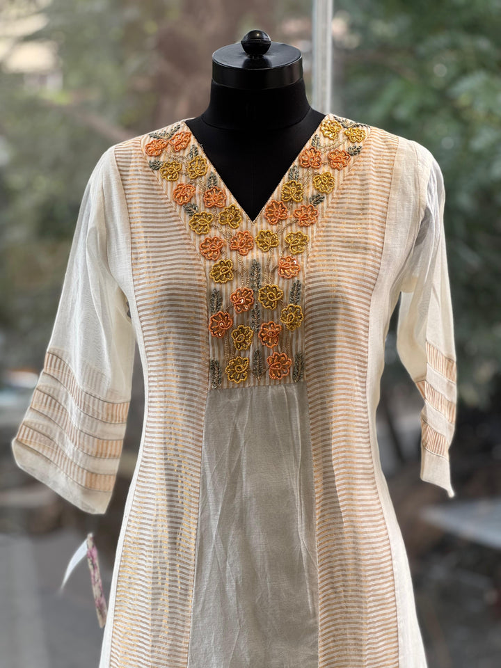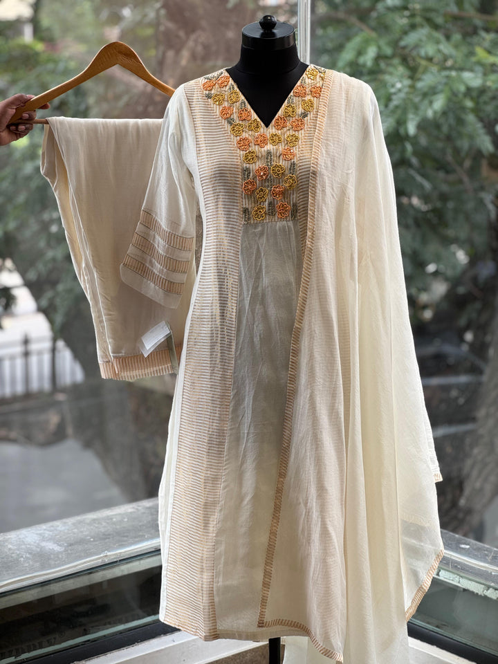 Pure chanderi mul and tissue lines orange and yellow beads work kurta with comfort fit pants and embroidered and mul dupatta.