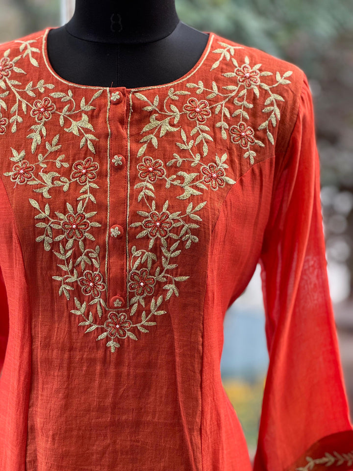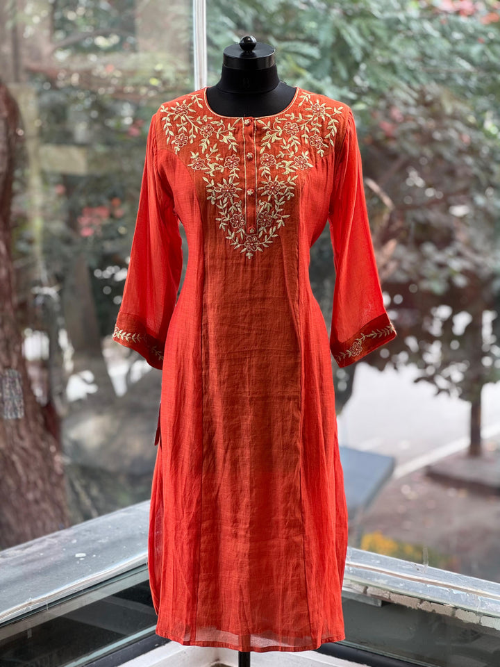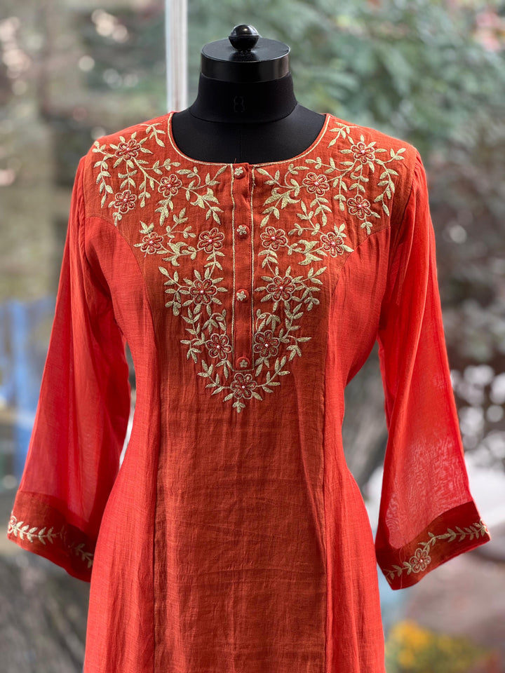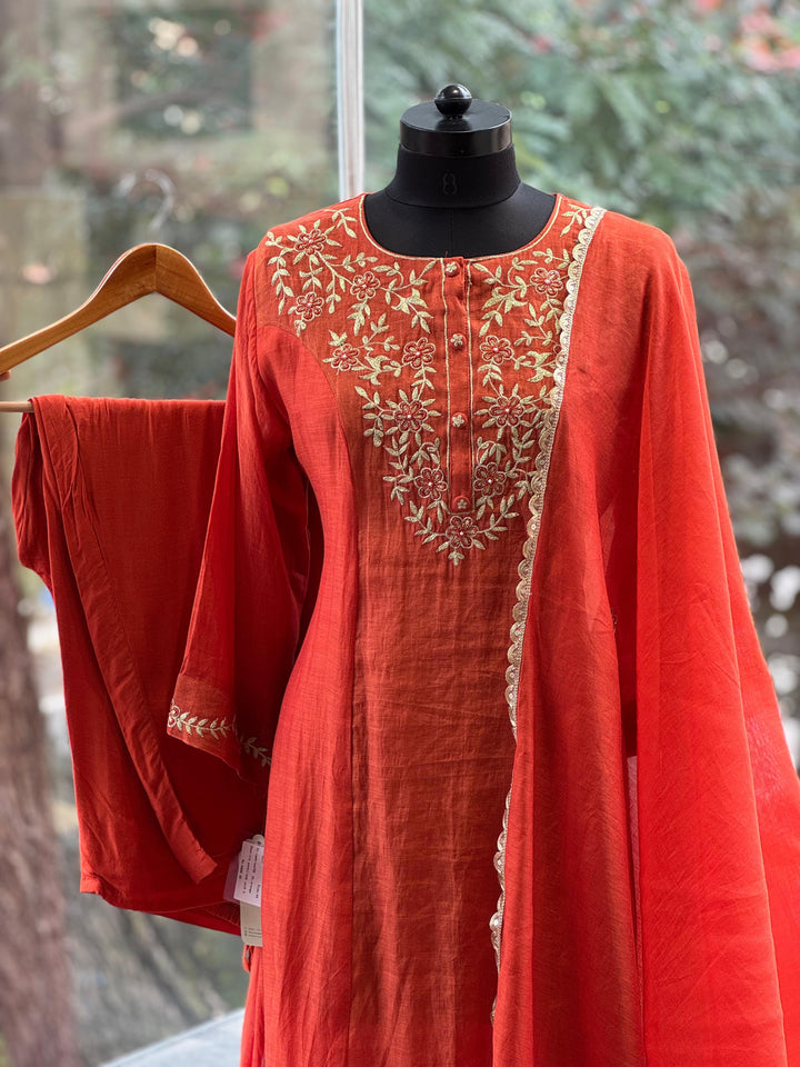 Orange pure mul kurta with yolk work and mul dupatta. Comes with comfort fit pants.