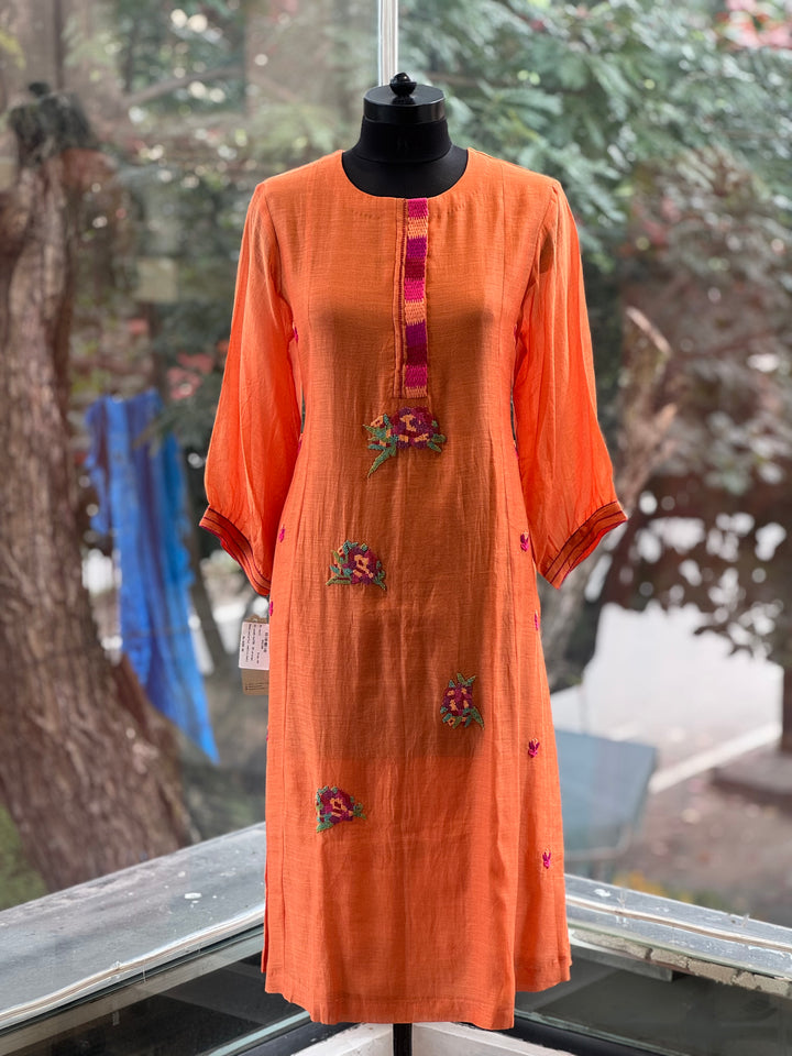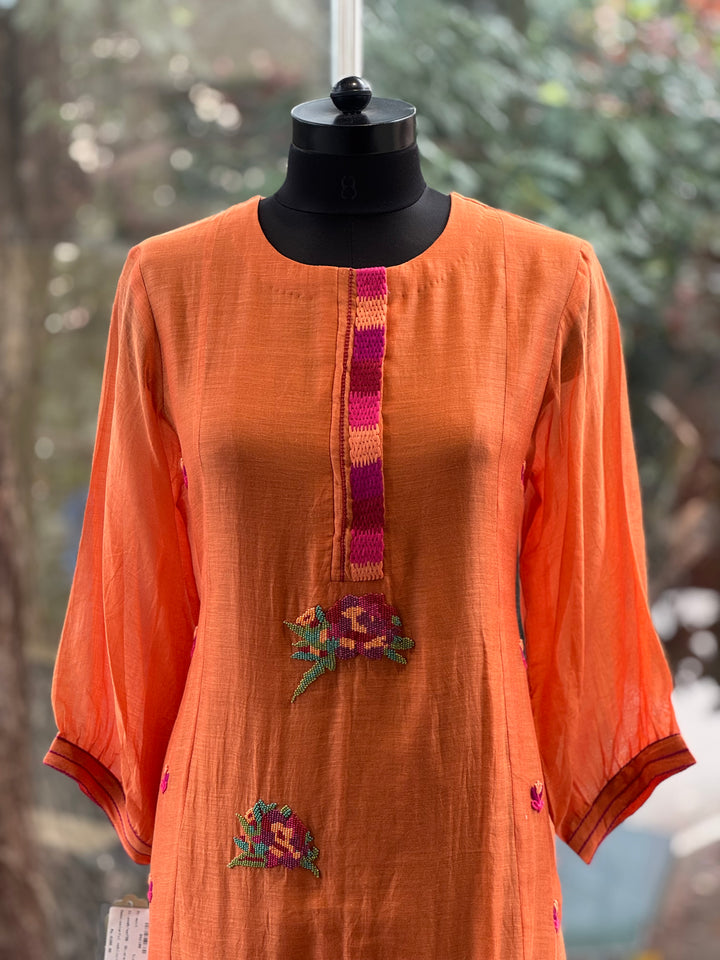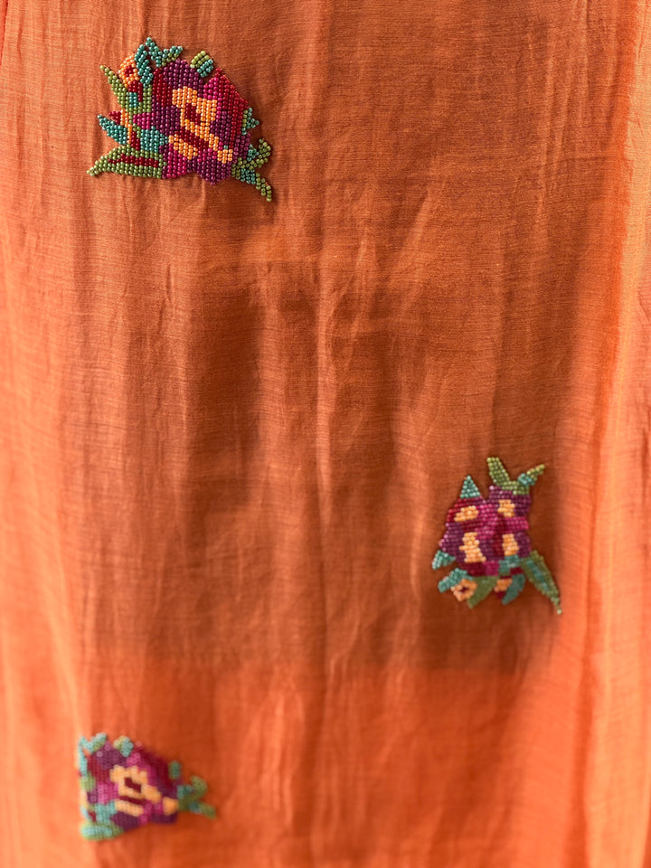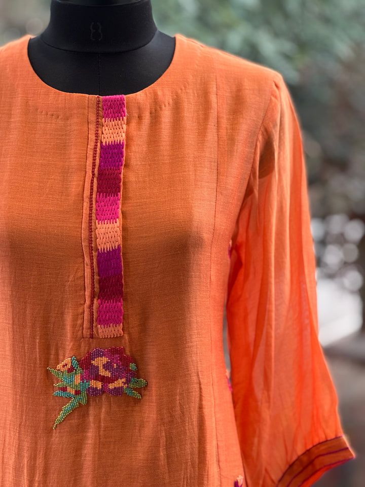 Pure mul kurta with intricate bead work & embroidered. Comes with crochia lace dupatta & comfort fit pants.