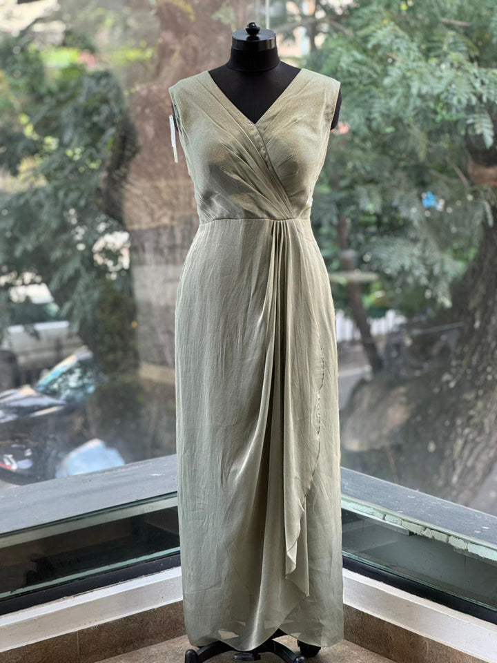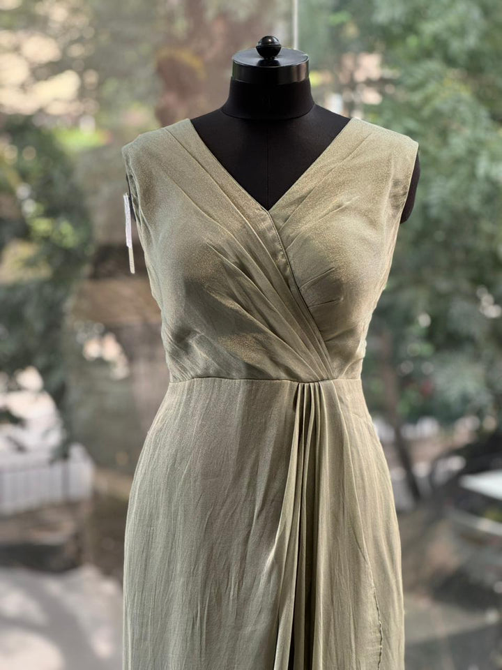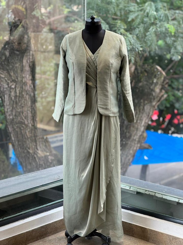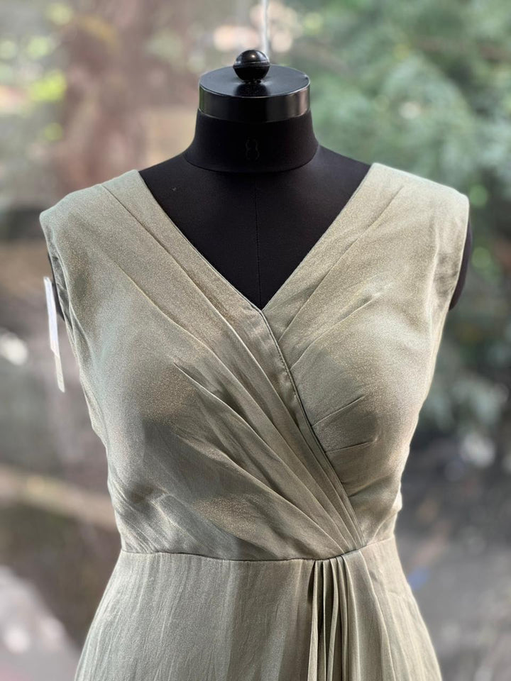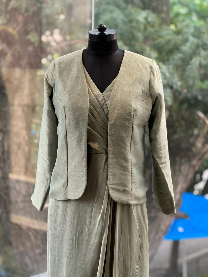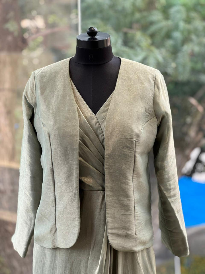 Puee glass tissue V neck pleated dress with glass tissue jacket.