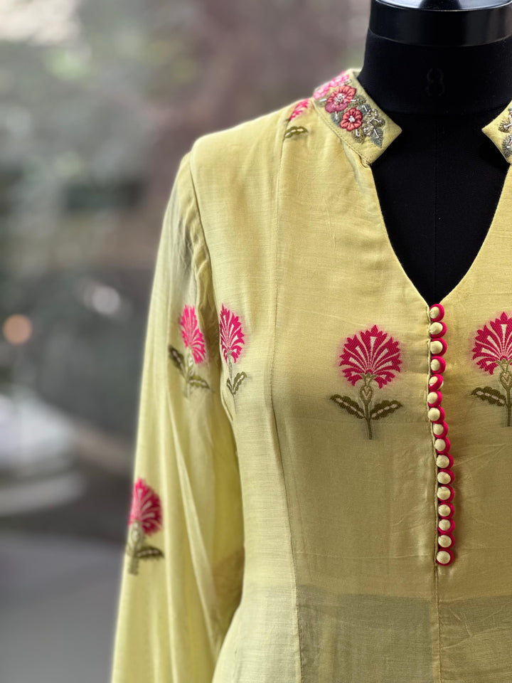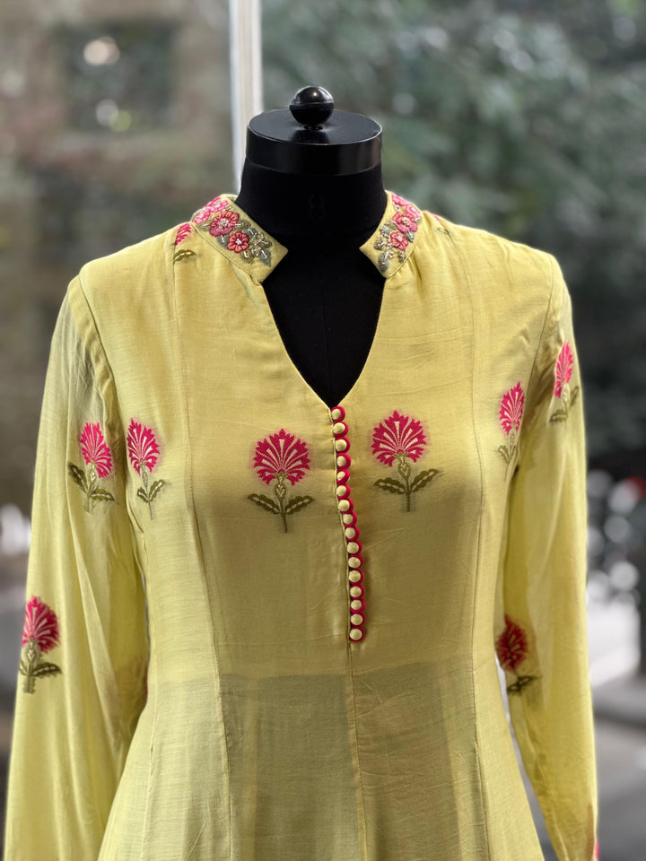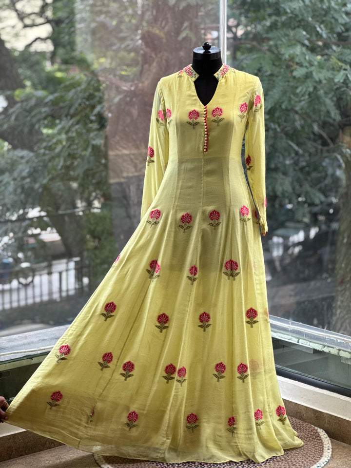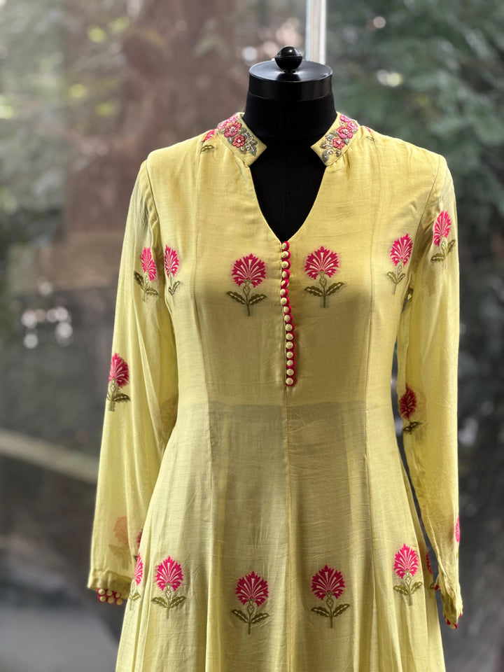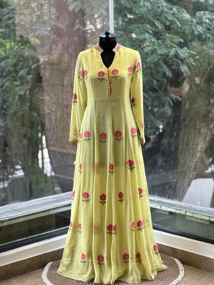 Pure banarasi organza pastel green gown with banarasi weaving buttas and hand embroidery on collar.