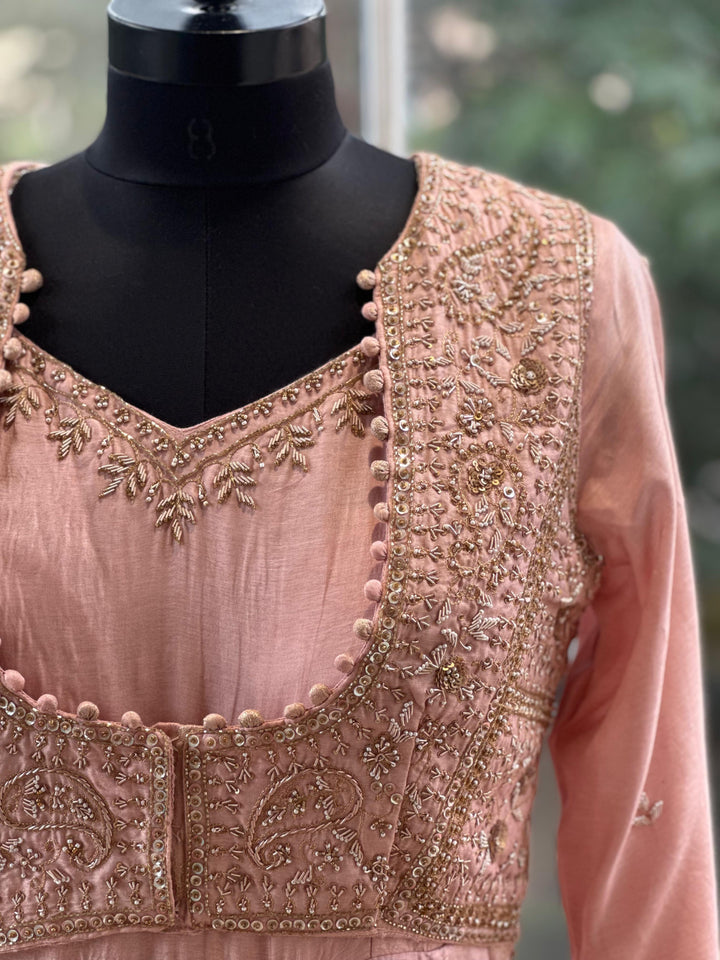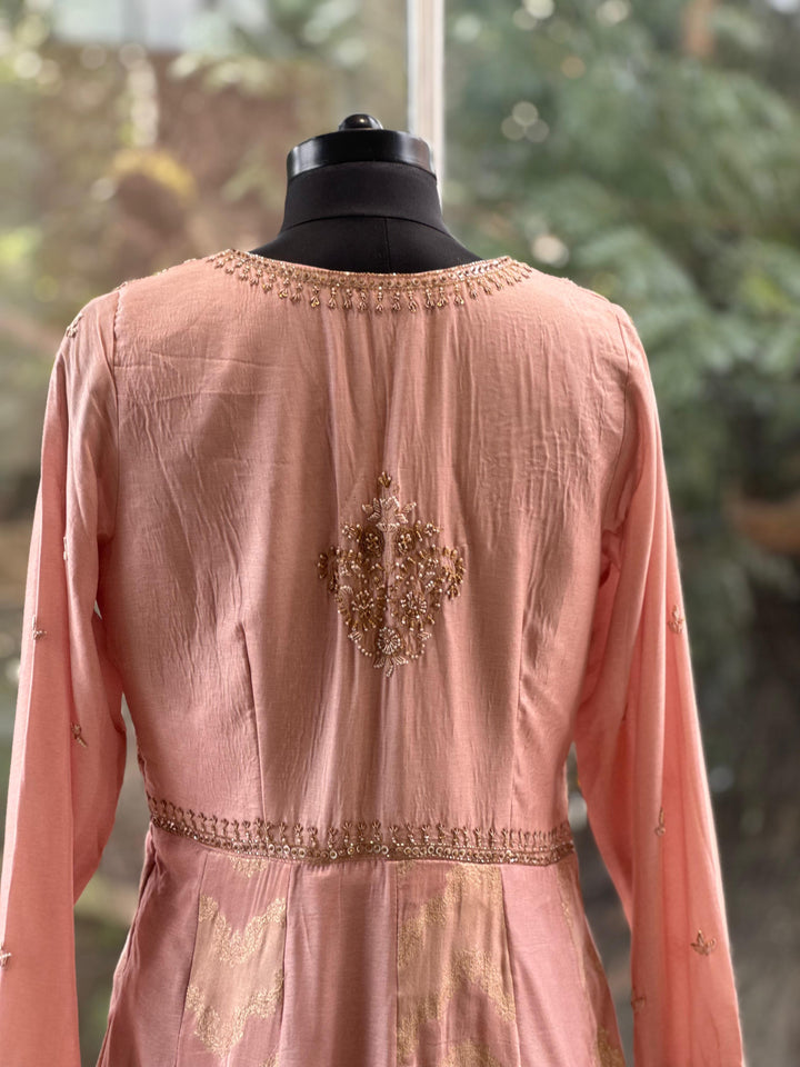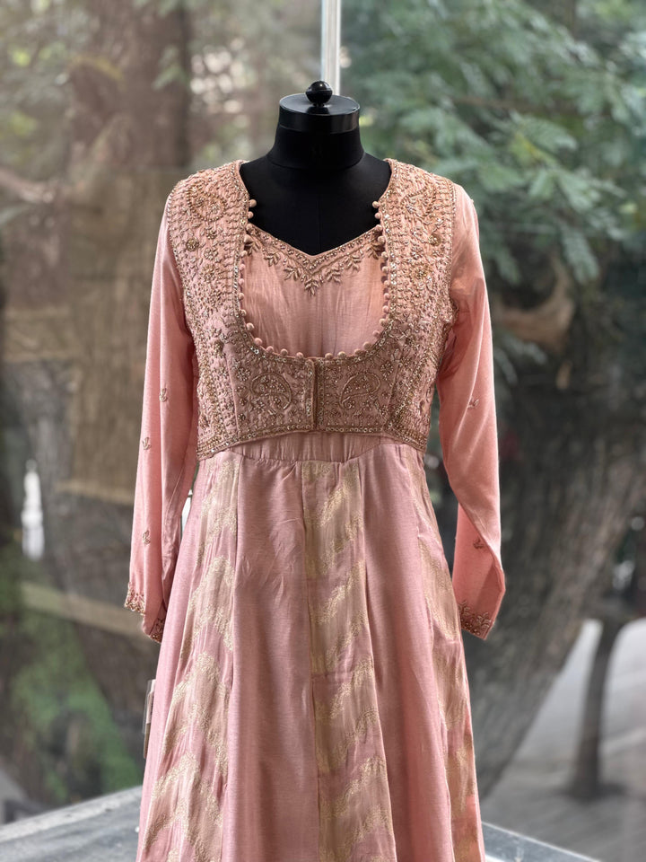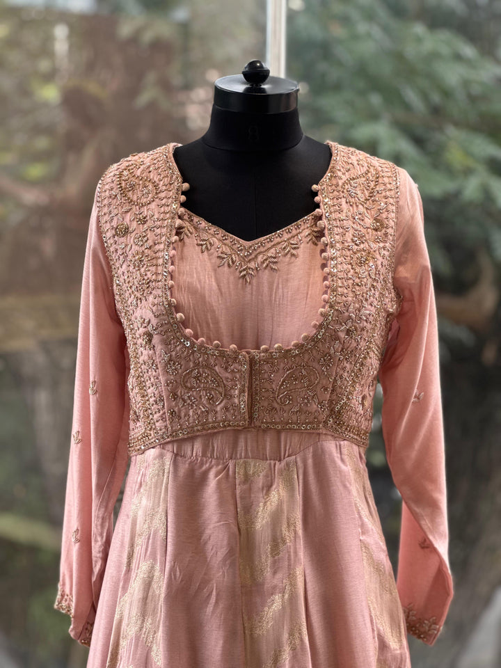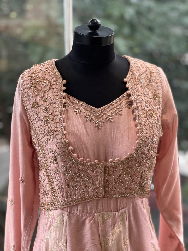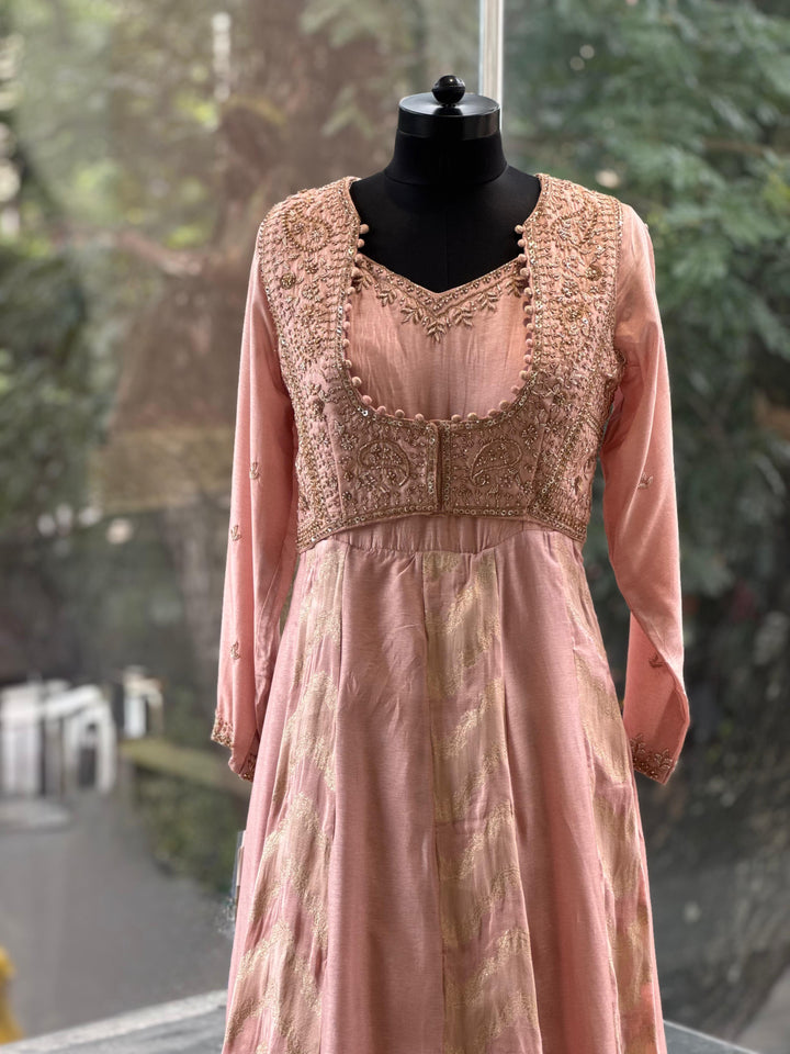 Peach pure silk gown with banarasi weaving kallis and intricate hand zardozi work on attached jacket.