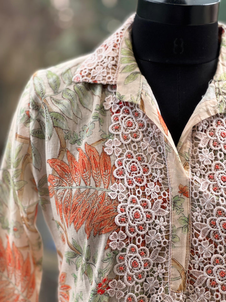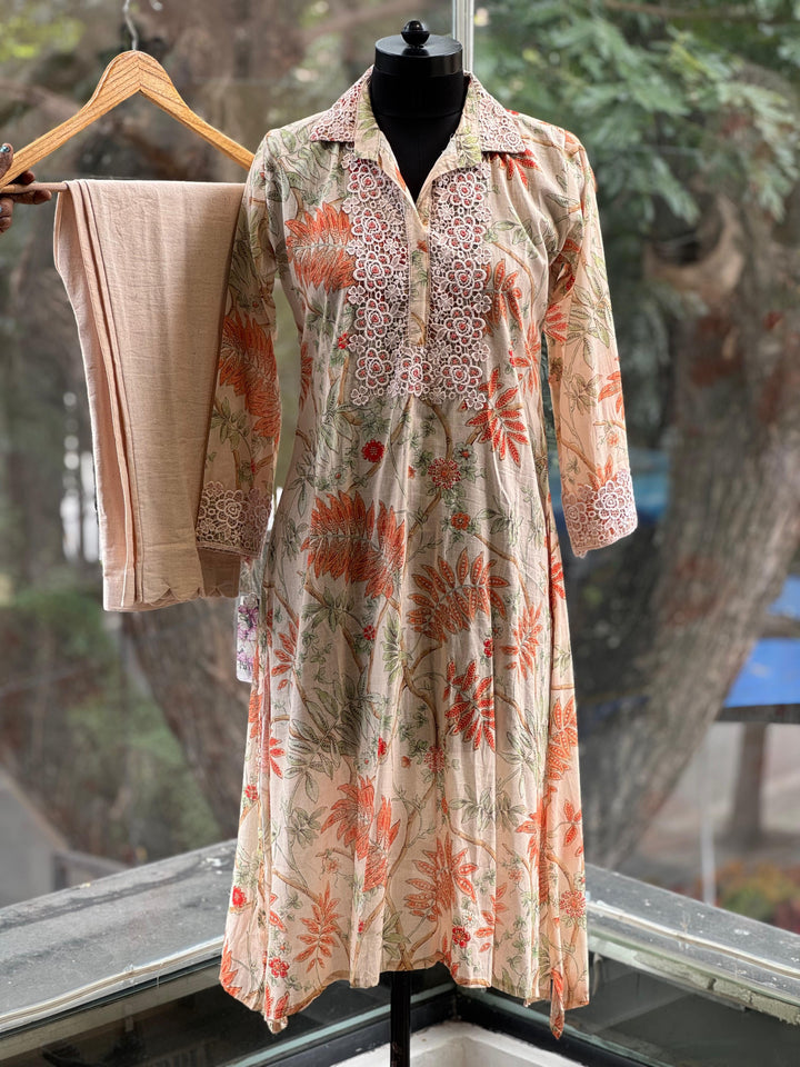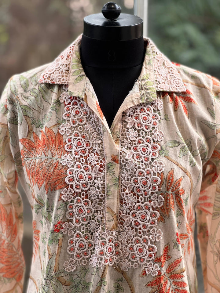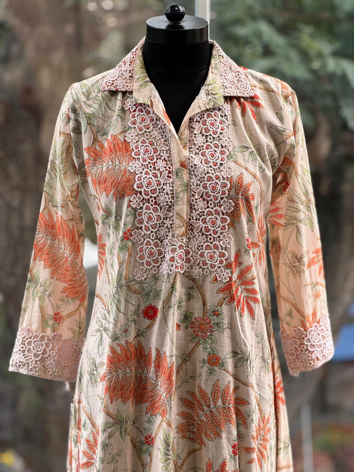 Soft linen collared neck crocia lace floral kurta with plain comfort fit pants.