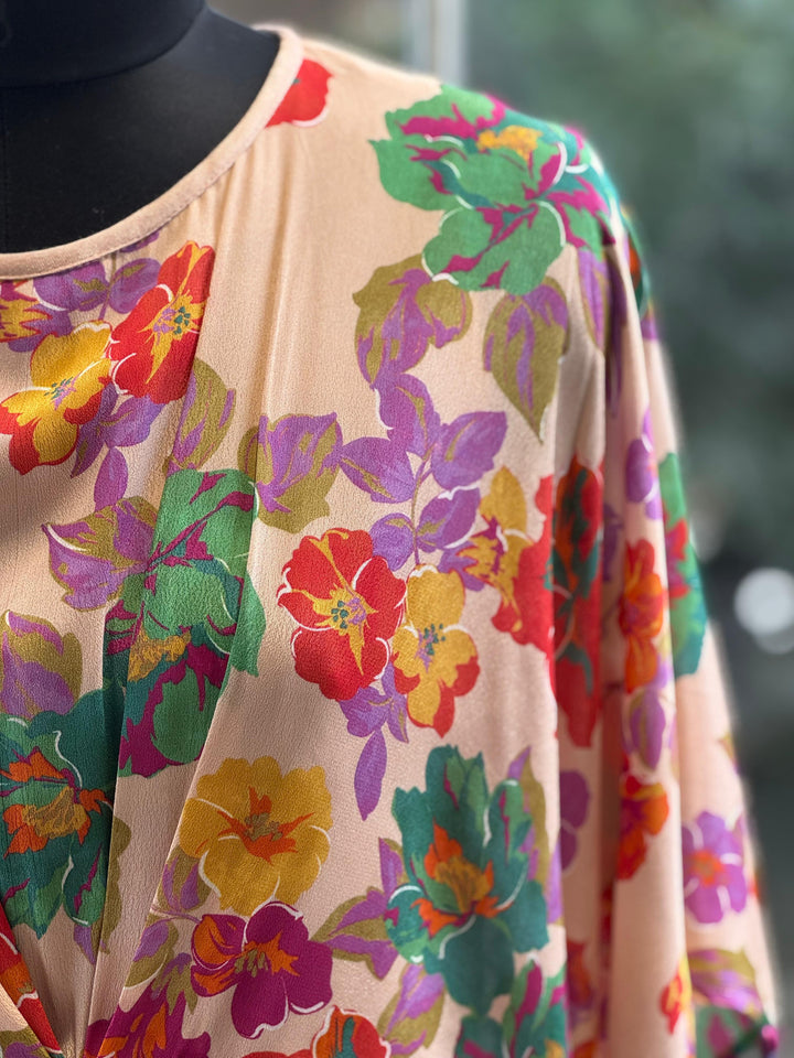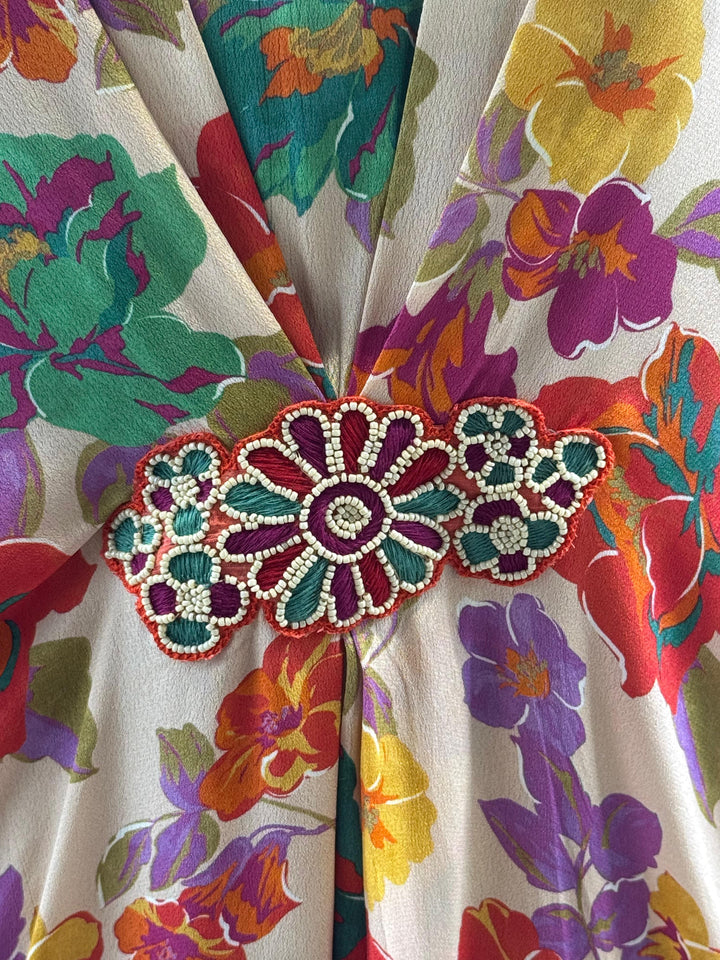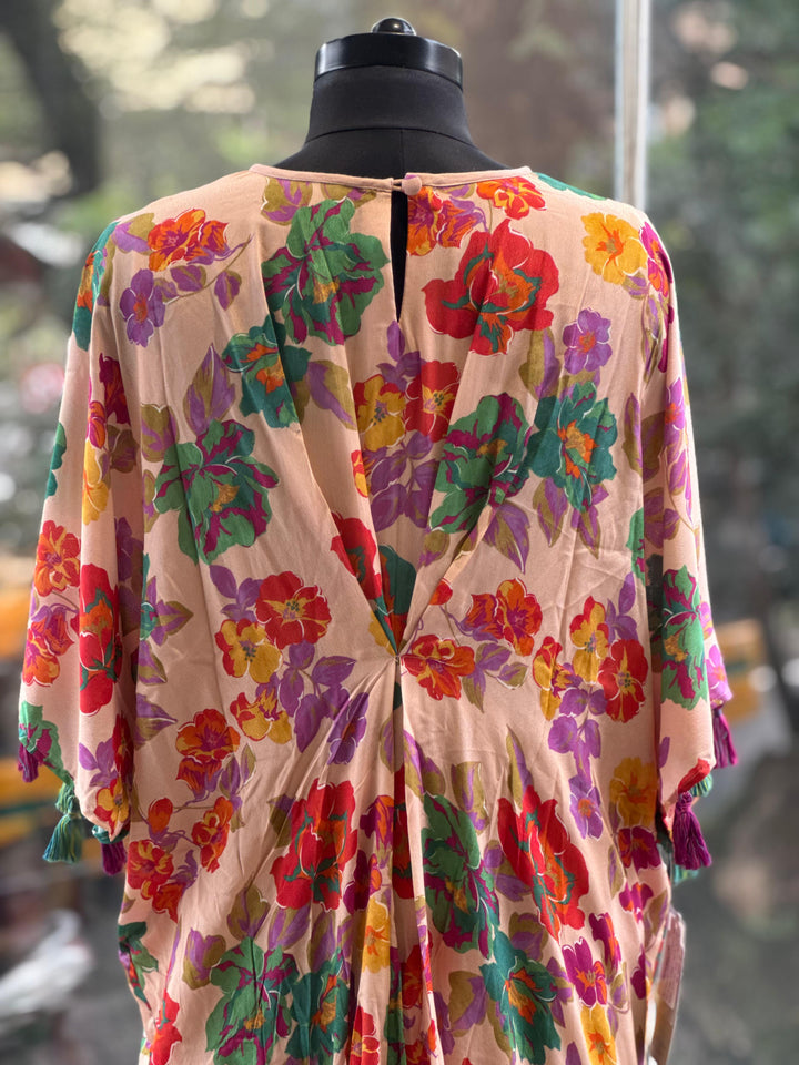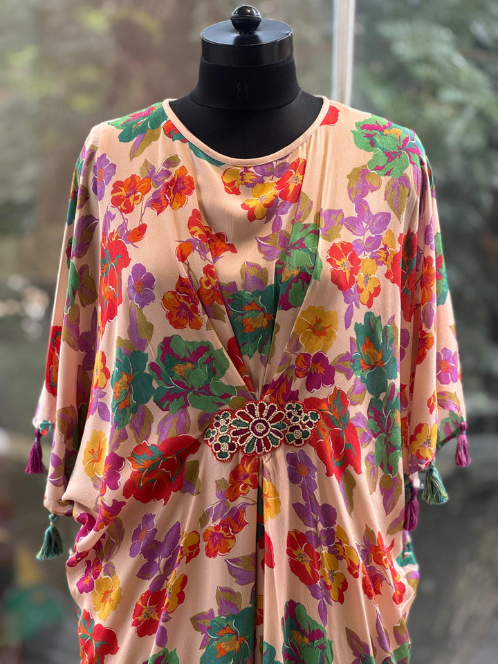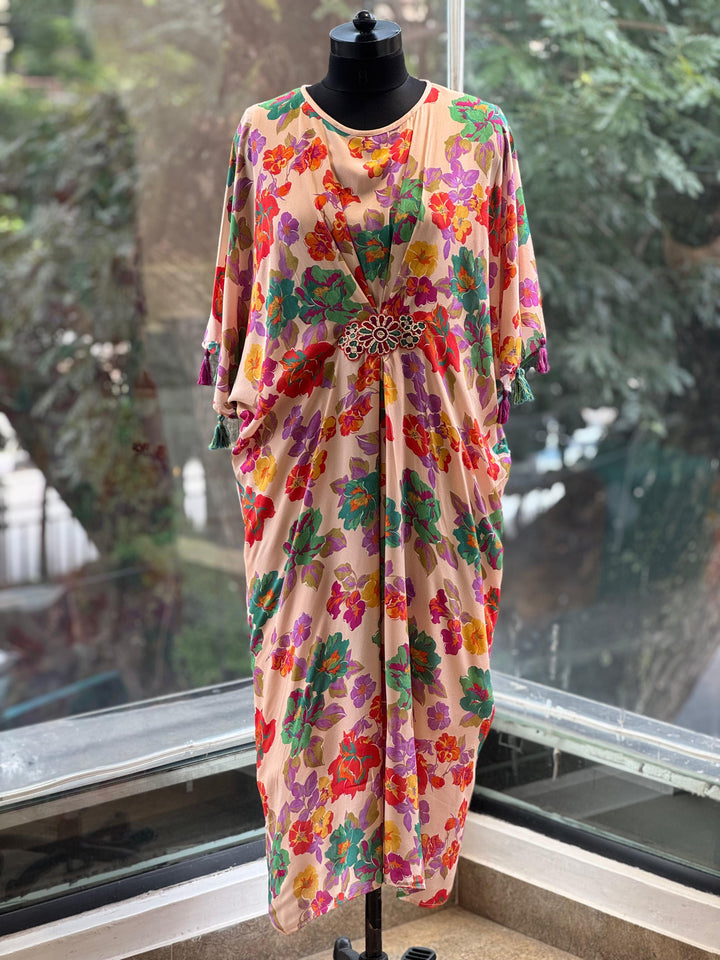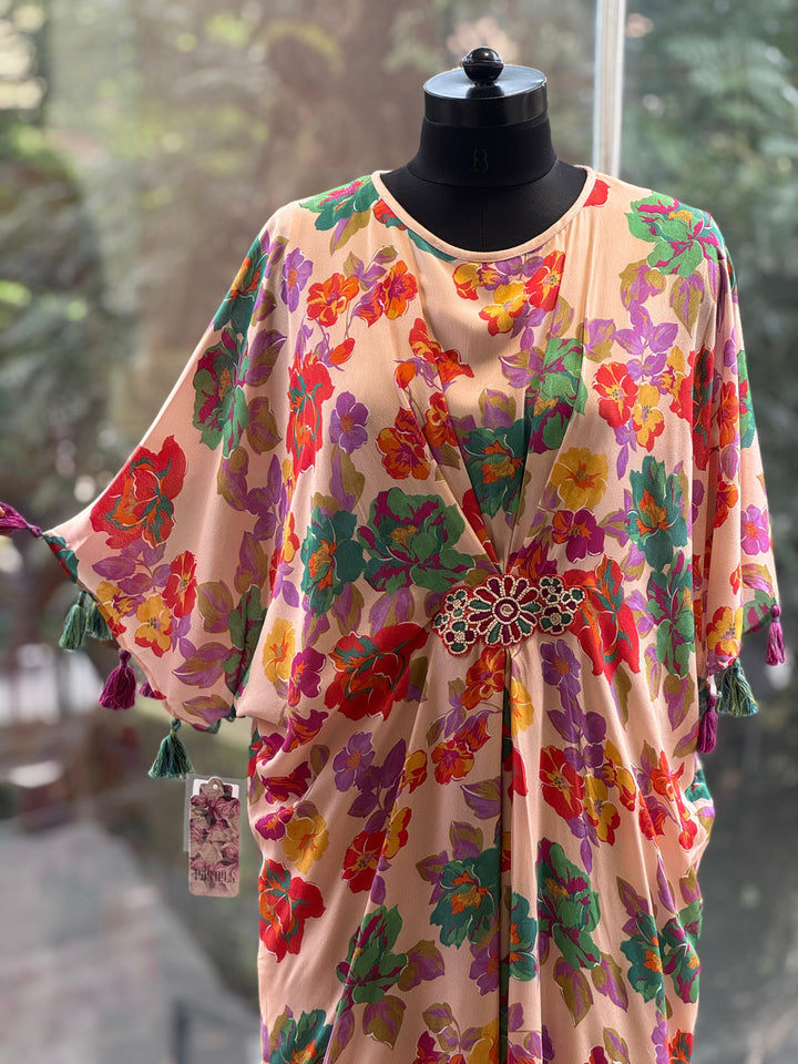 Smart floral cowl tunic in pure crepe with centre moti workbroche.. its comfortable wear kaftan style one piece dress..