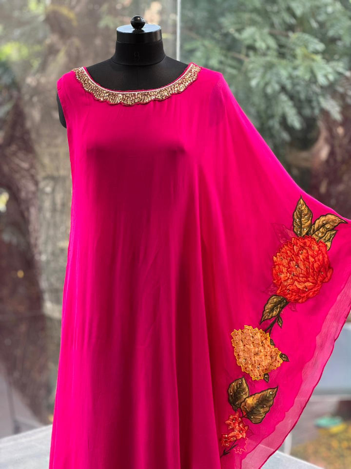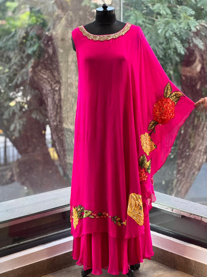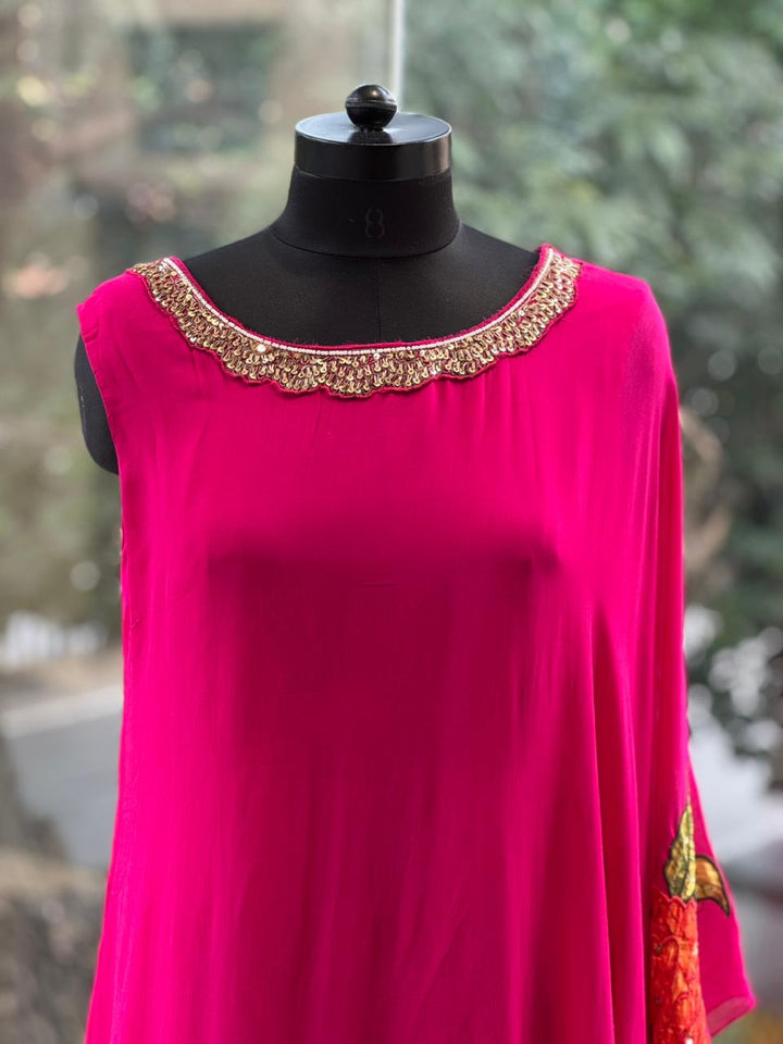 Pink georgette hi-low tunic with applique work detailling on one side flap.