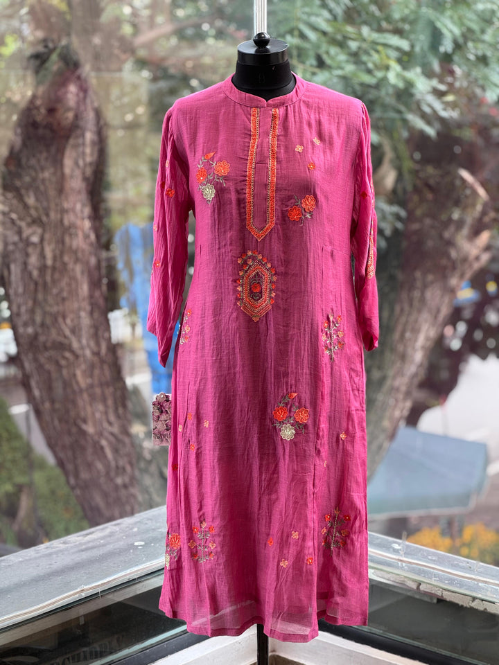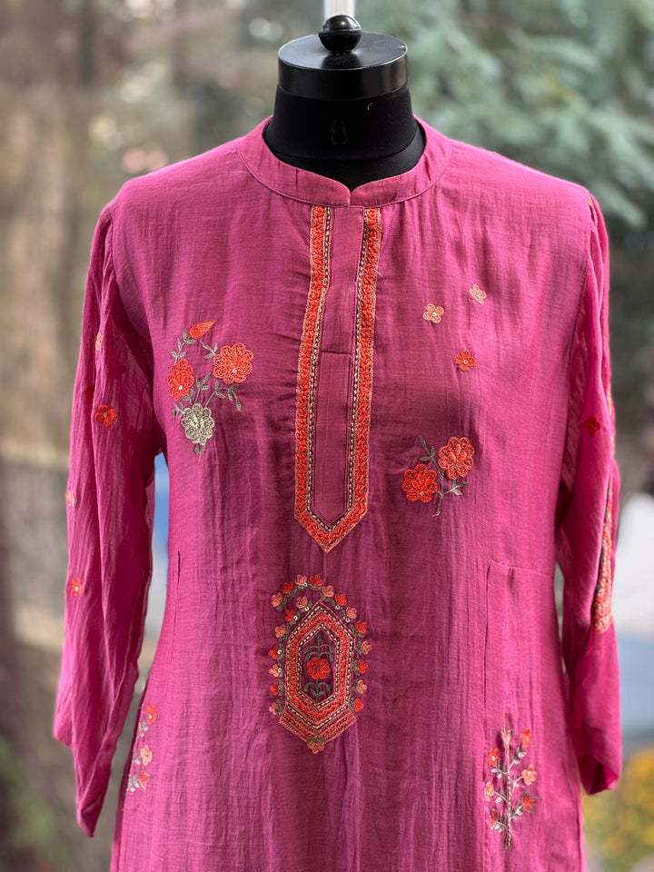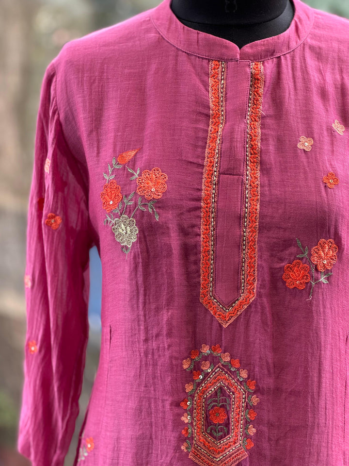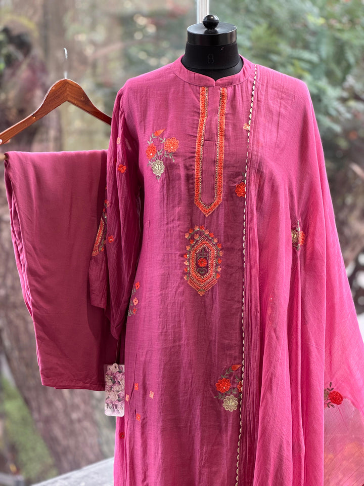 Pure mul chanderi pink chinese collar kurta with embroidery. Comes with comfort fit pants and embroidered dupatta.