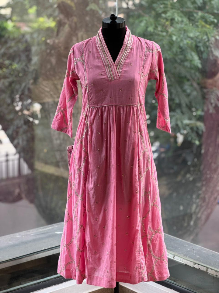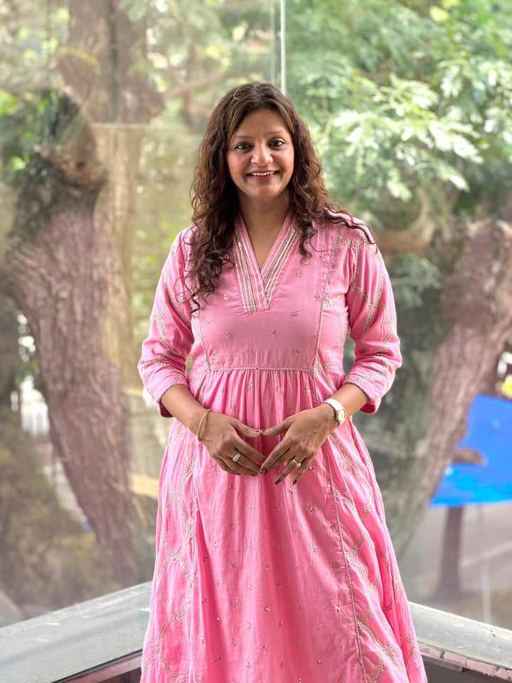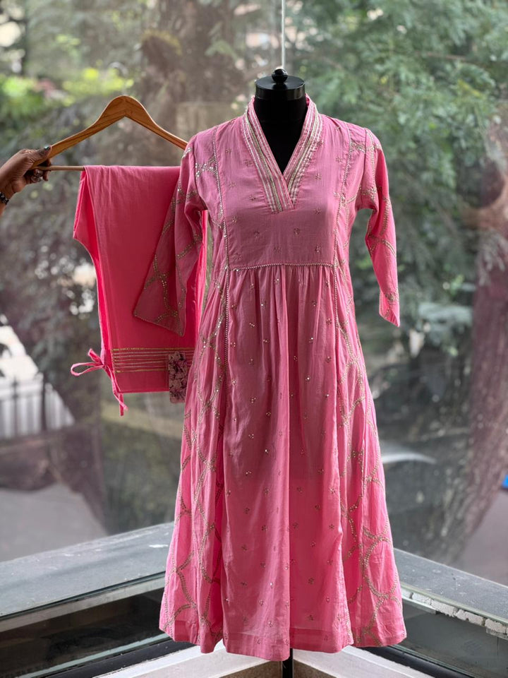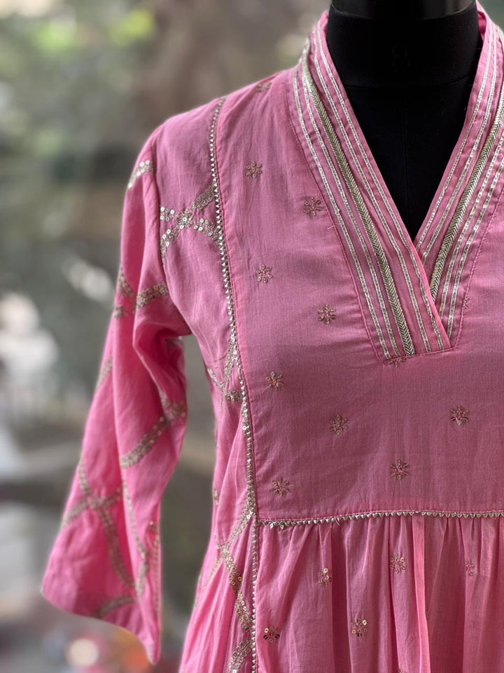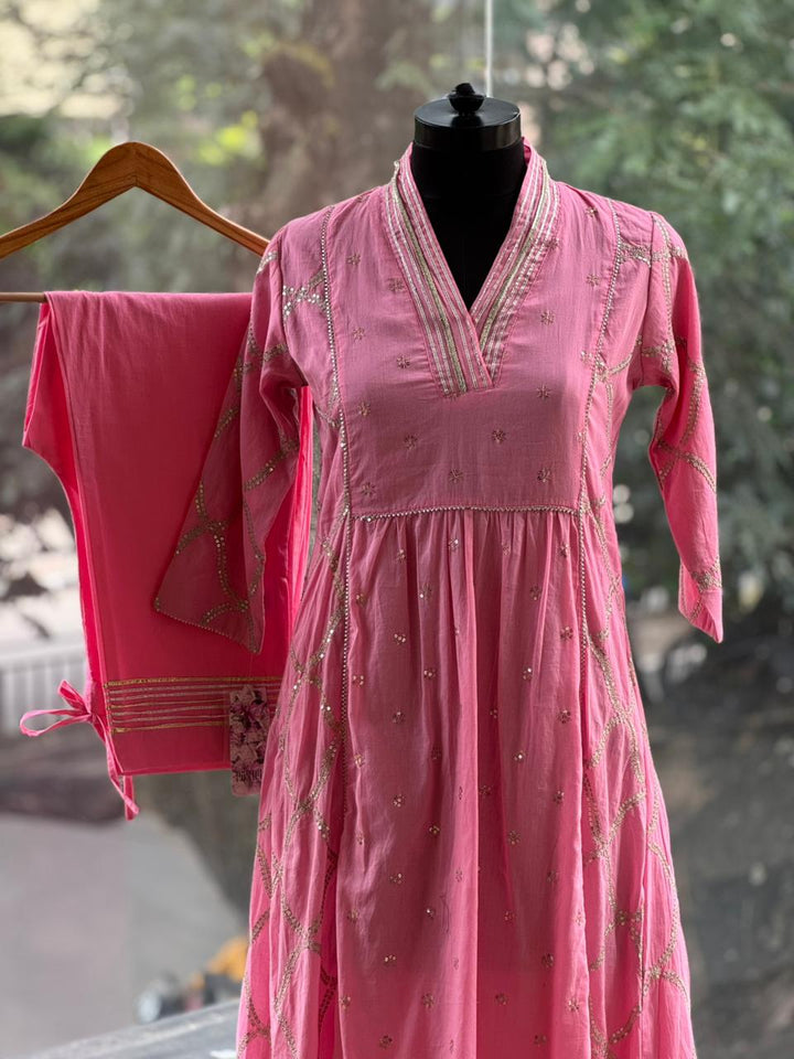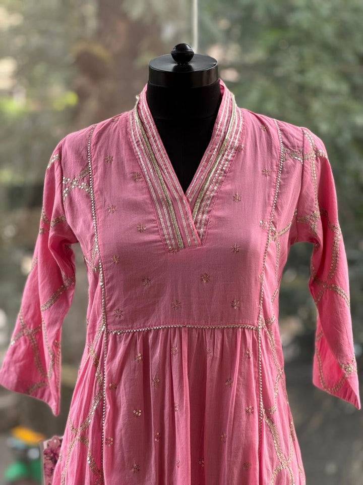 Pure mul pink V neckline work kurta with handwork and comfort fit pants.