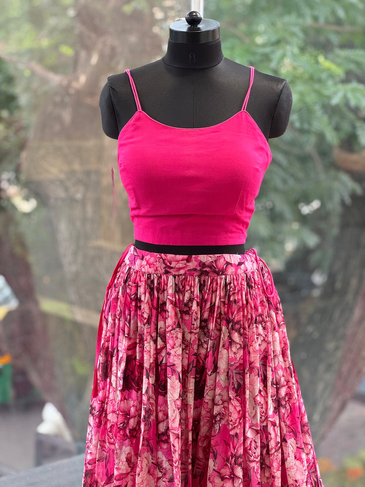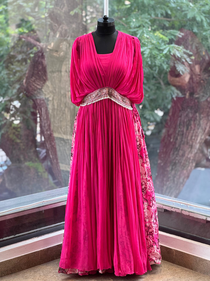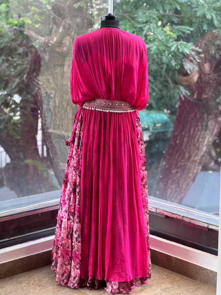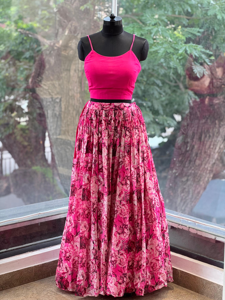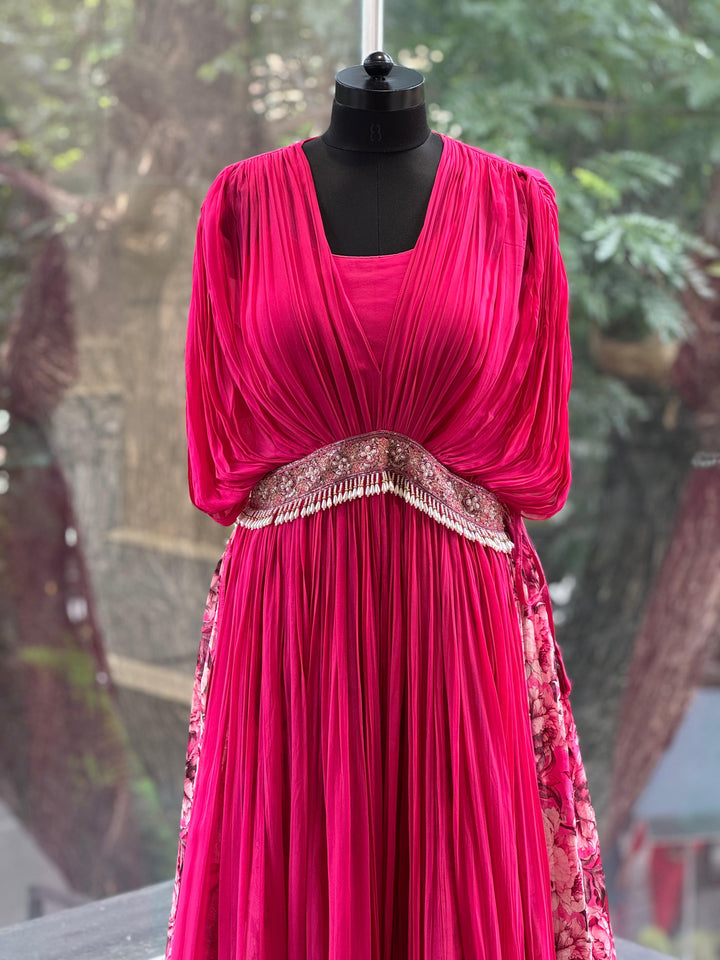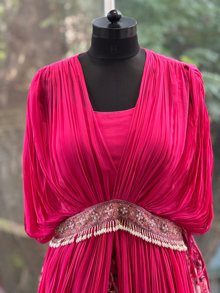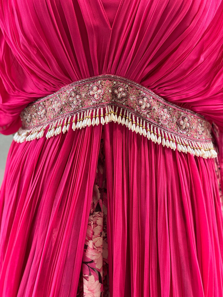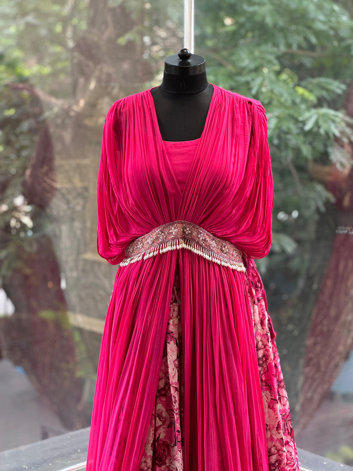Pure georgette spaghetti inner with beautiful pleated over jacket kind and flared floral lehenga.
