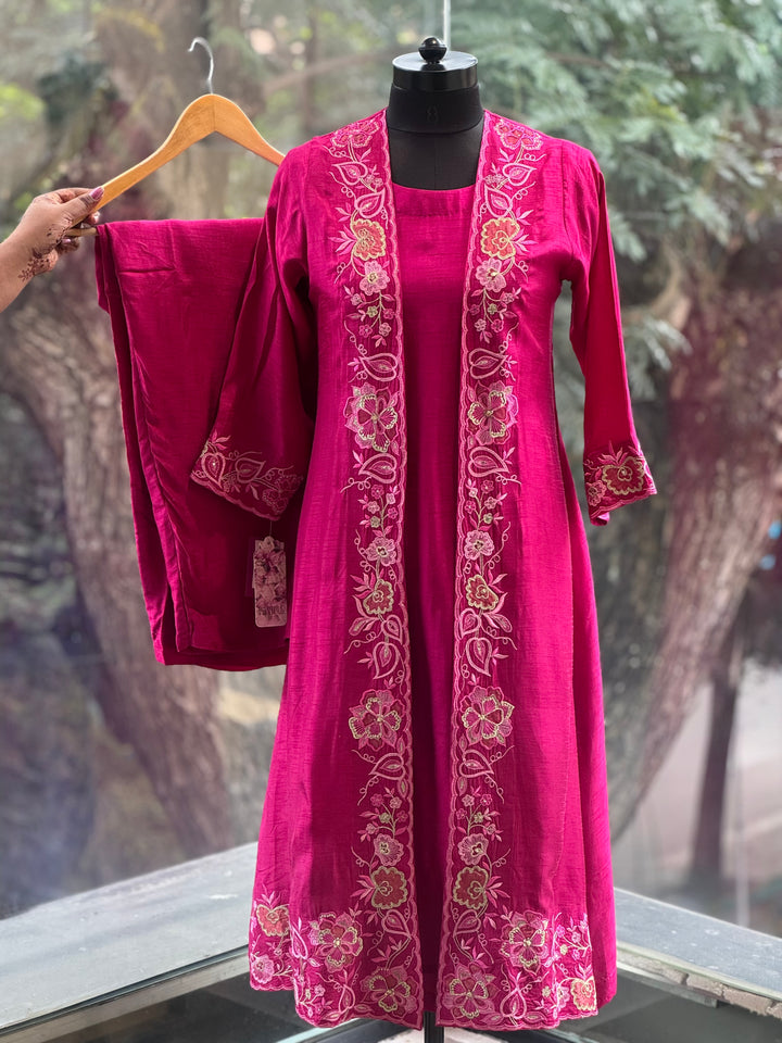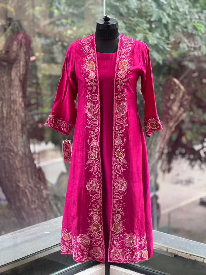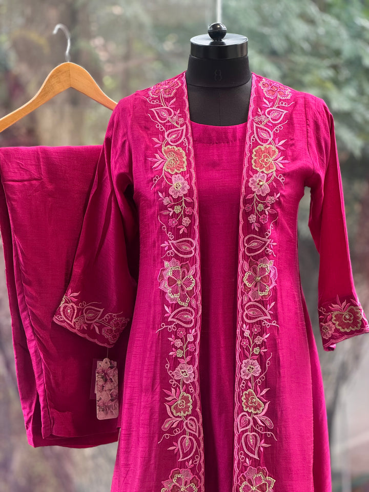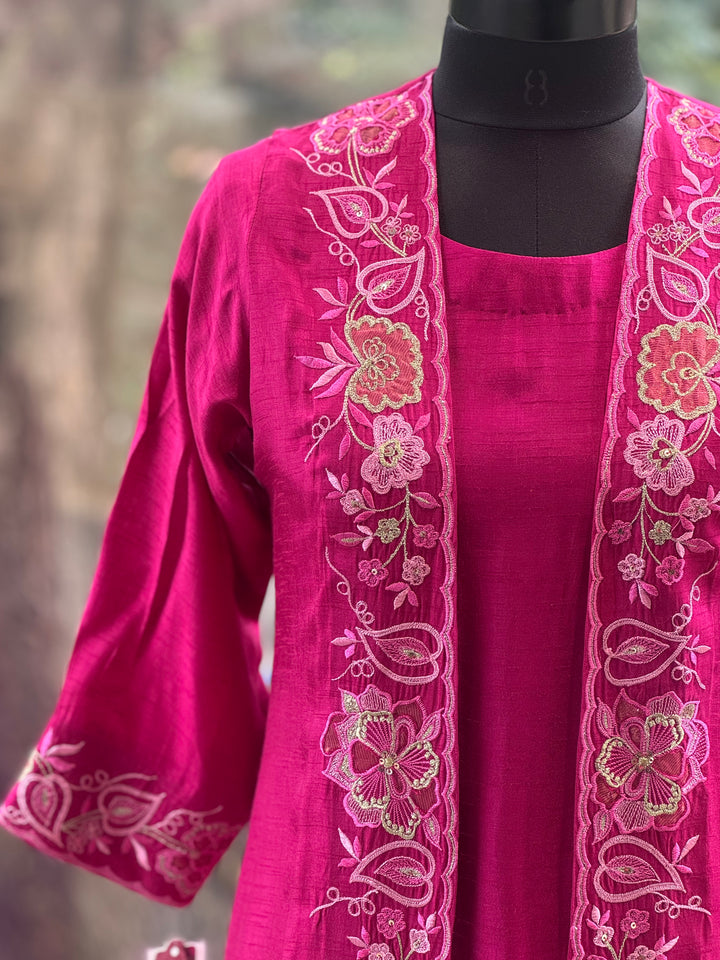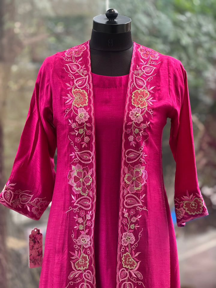 Pure silk sleeveless kurta with embroidered jacket and comfort fit pants.
