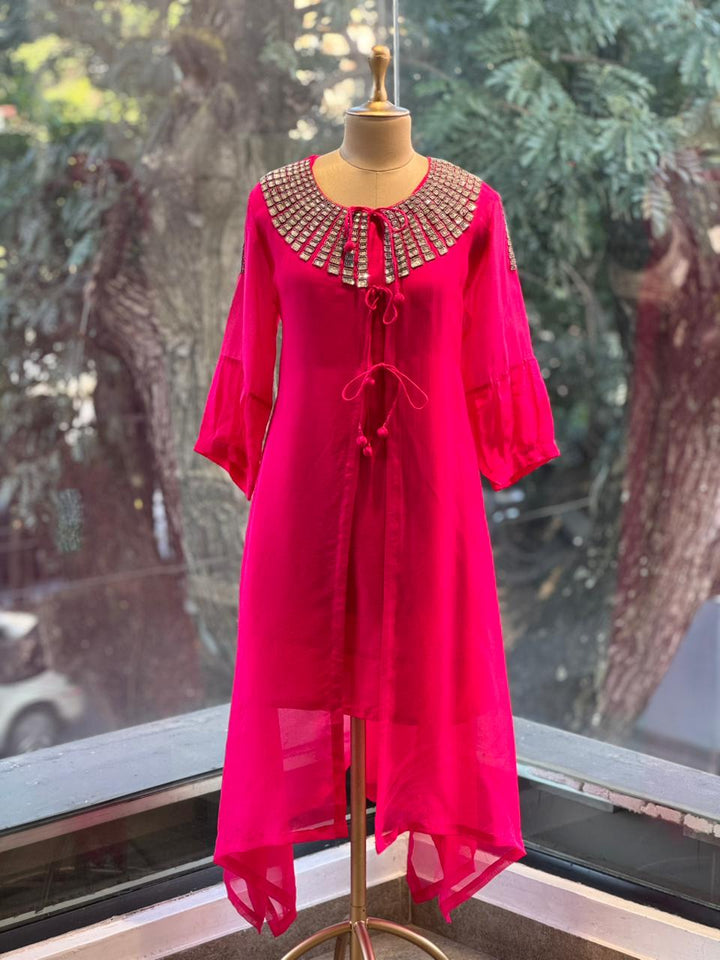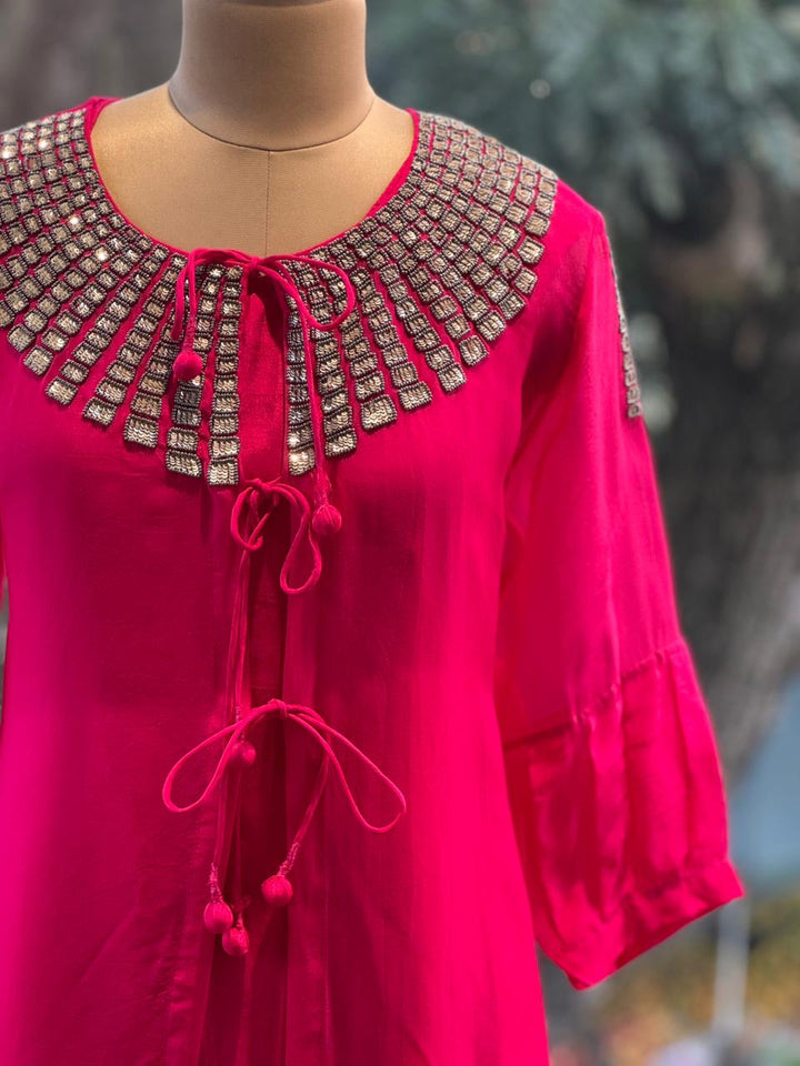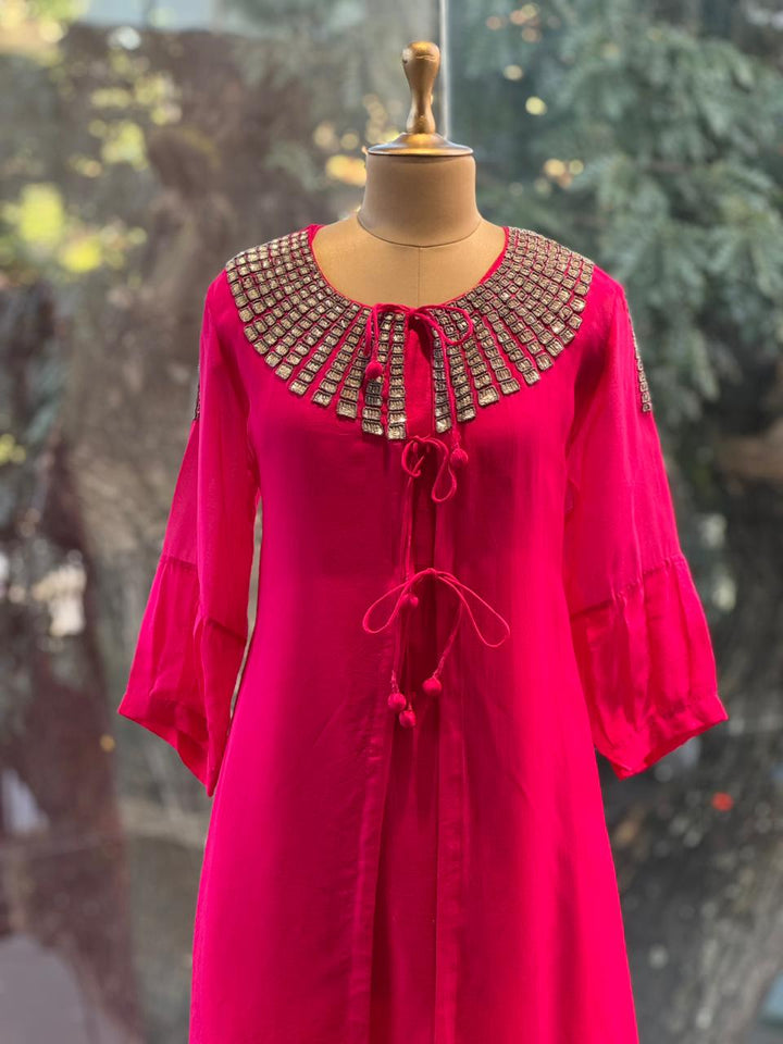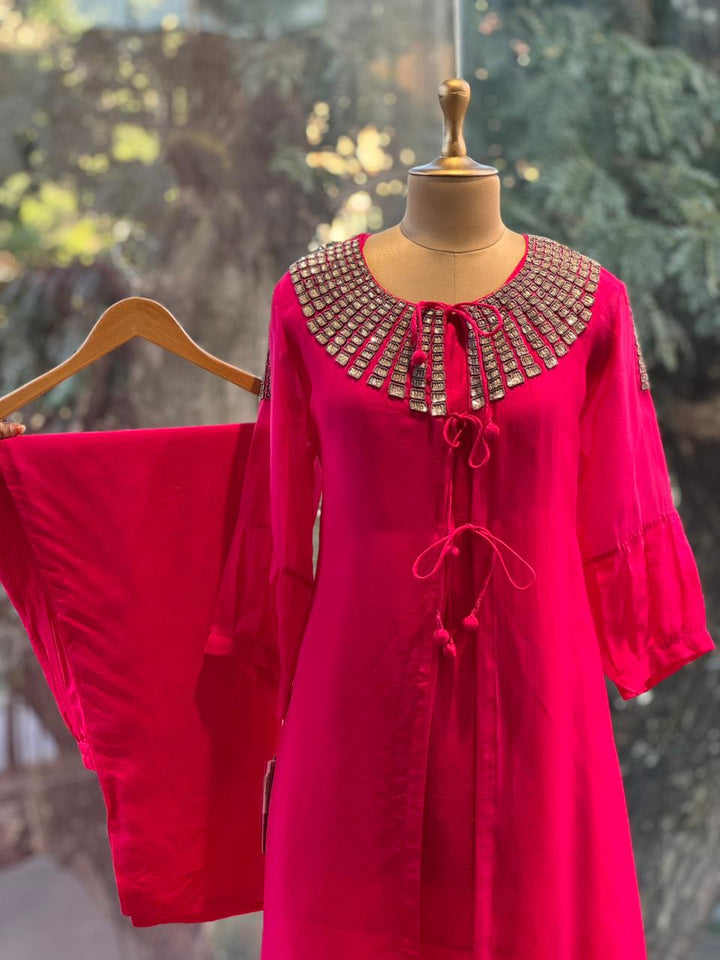 Pure soft silk sleeveless inner with comfort fit pants and soft organza silk jacket with intricate yolk work.