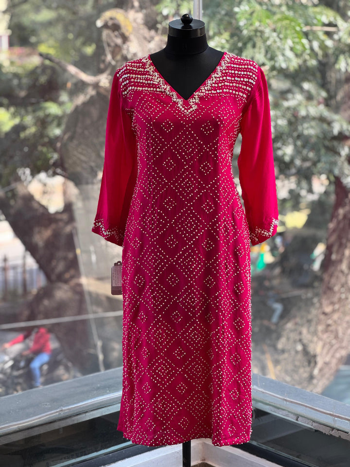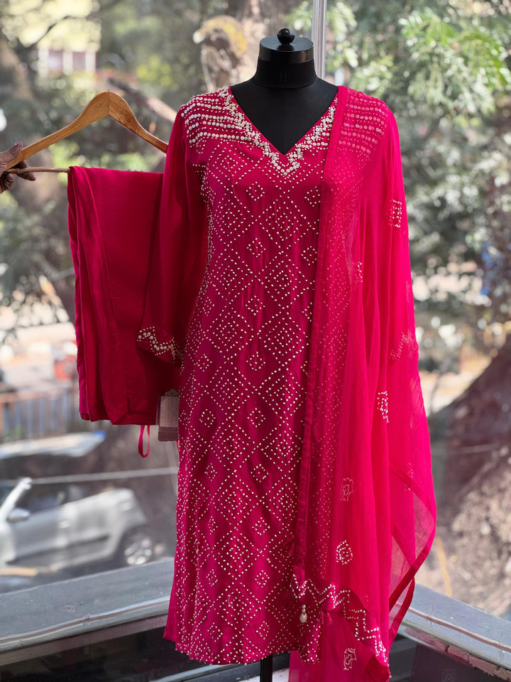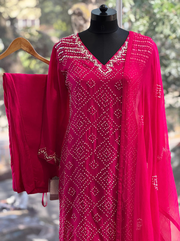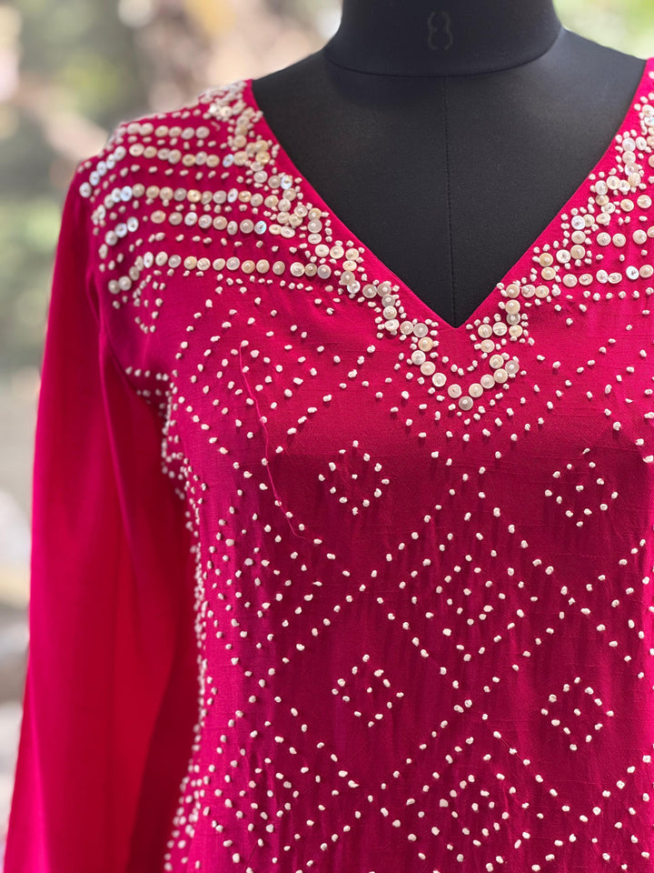 Pure silk work v neck knot work kurta with plain comfort fit pants and dupatta.