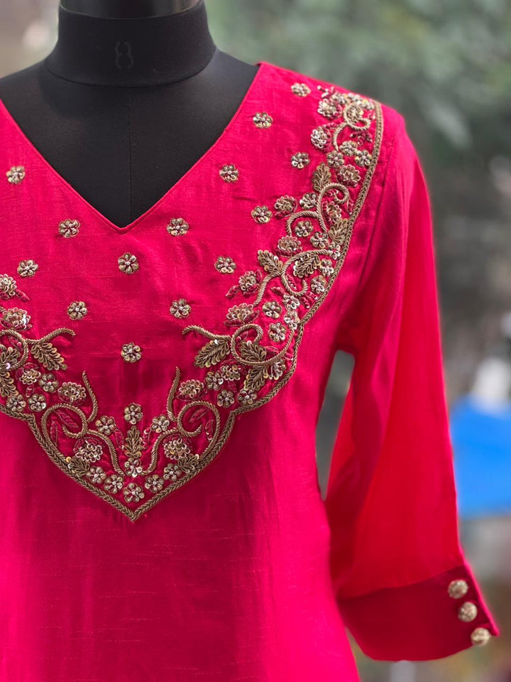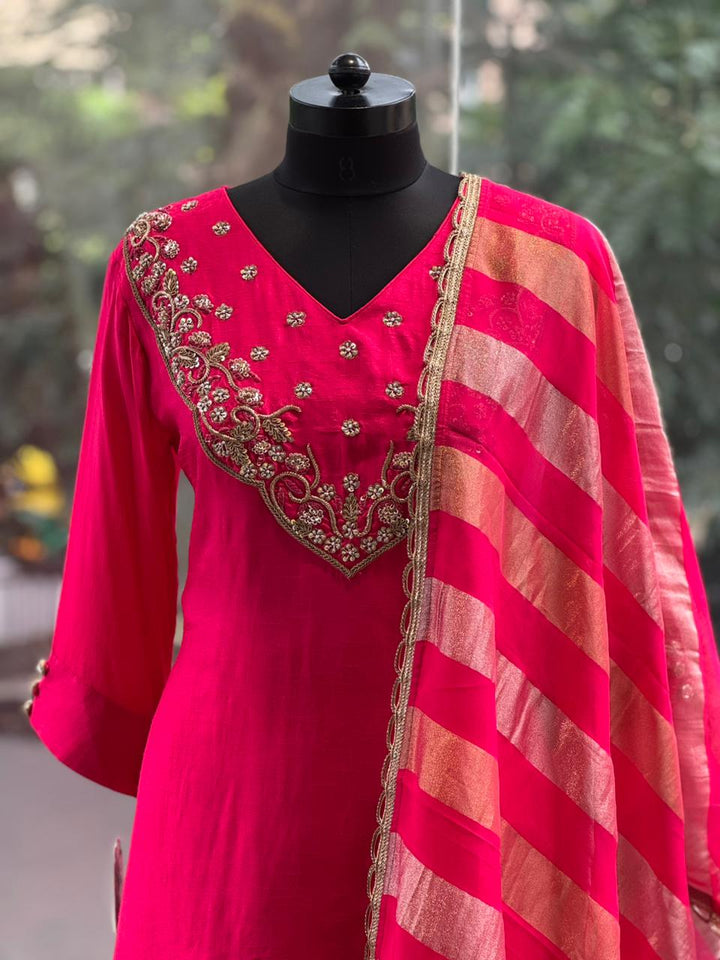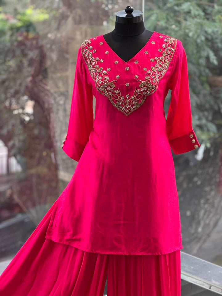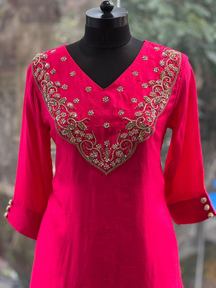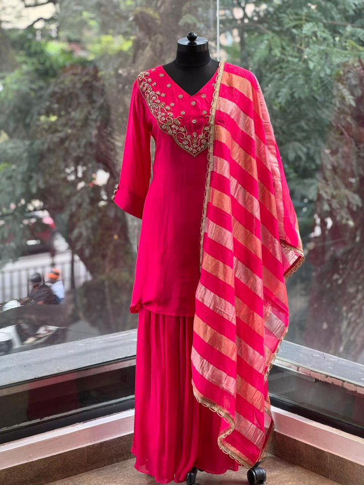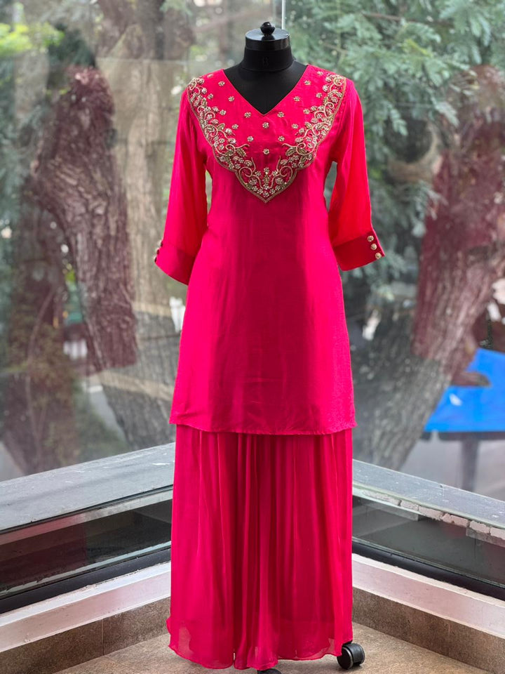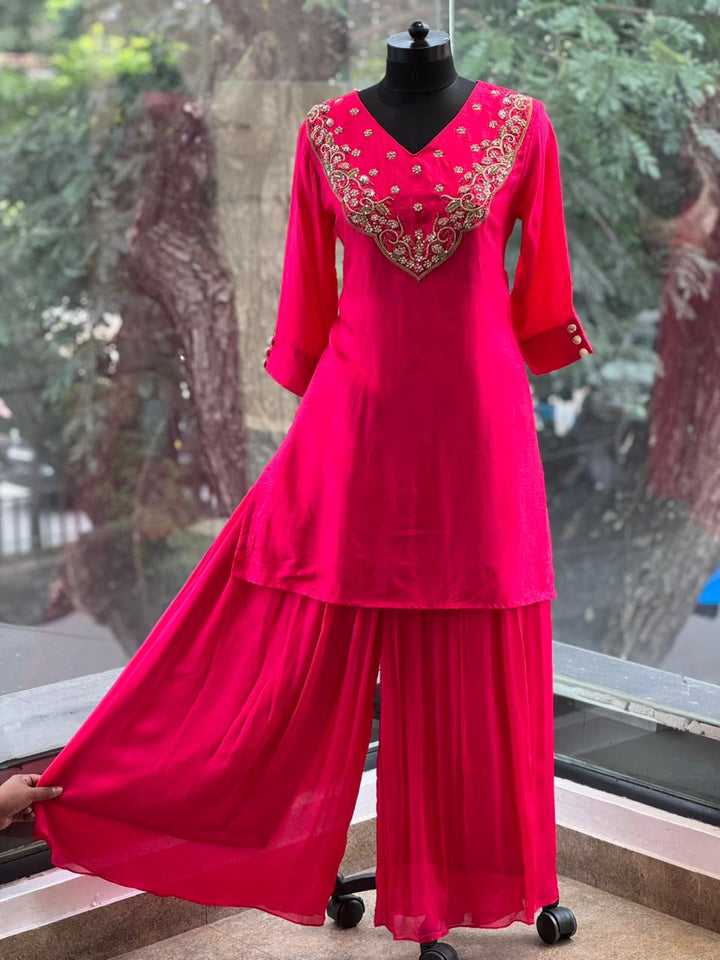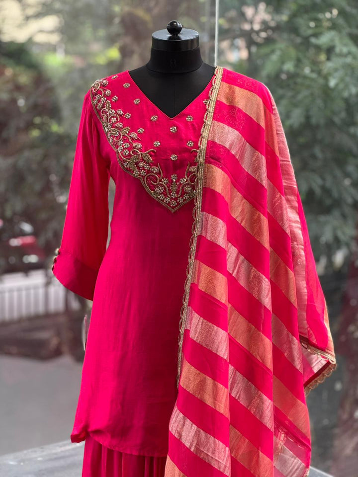 Pure silk short kurta in bright pink color with heavy zardozi work yolk, comes with wide palazzo with pure banarsi tissue dupatta.