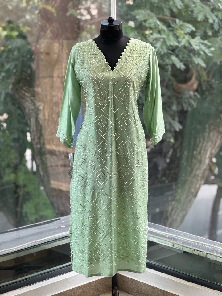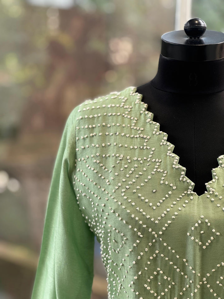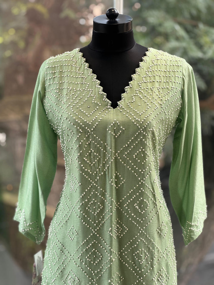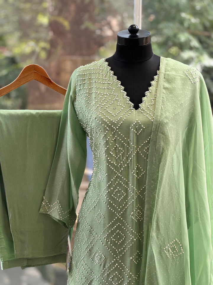 Pure silk hand knot work suit with comfort fit pants & soft organza dupatta.