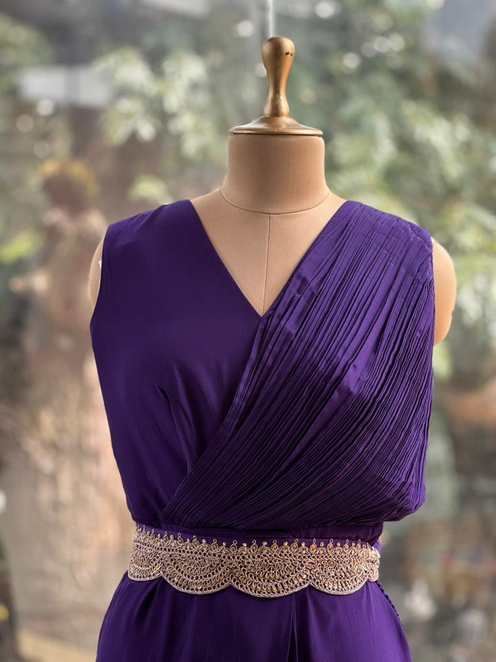 Pure silk sleeveless V pleated neck cowl tunic with pure gajji silk original bandhej cape with detachable work belt.