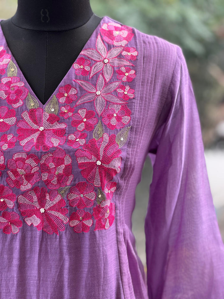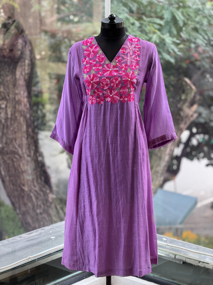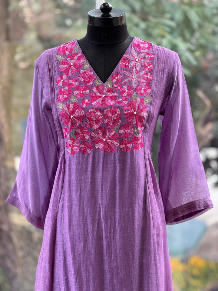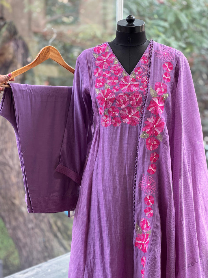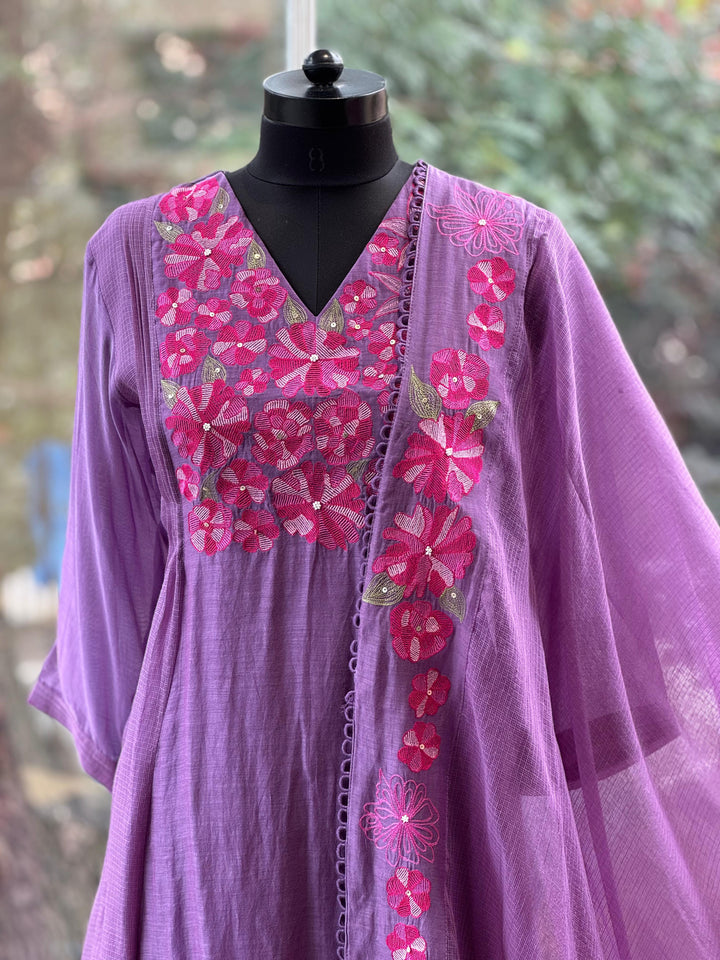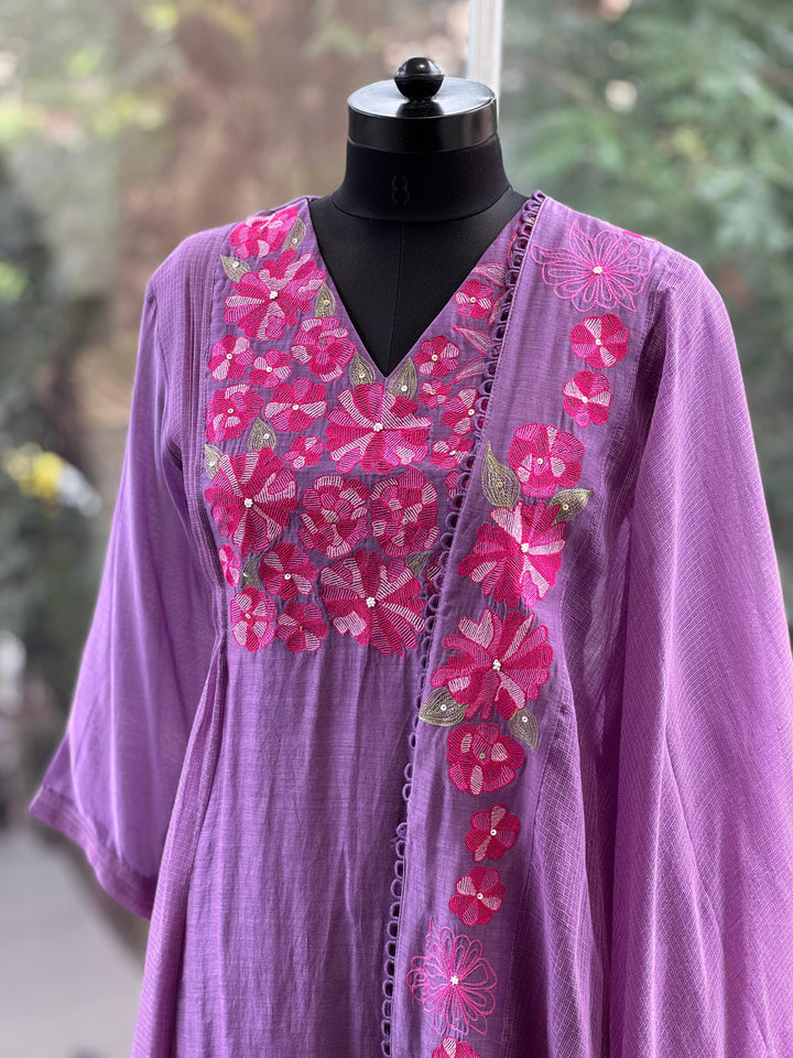 Pure mul V neck embroidery yolk kurta with kota side panel work with kota and embroidered dupatta and comfort fit pants.