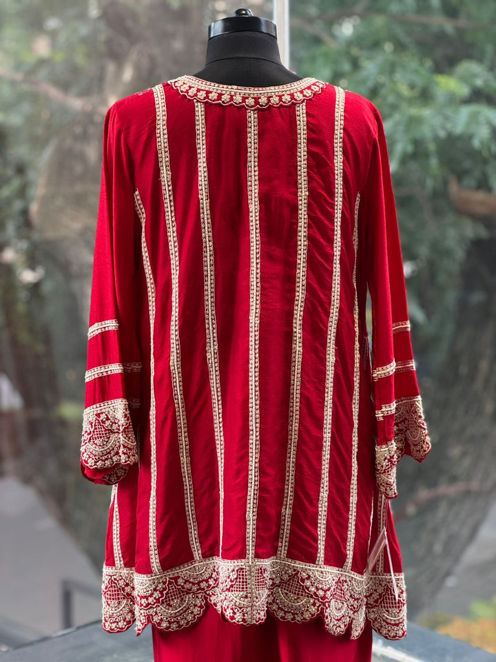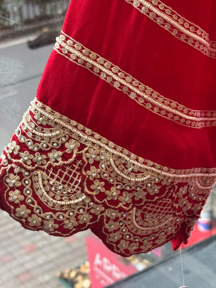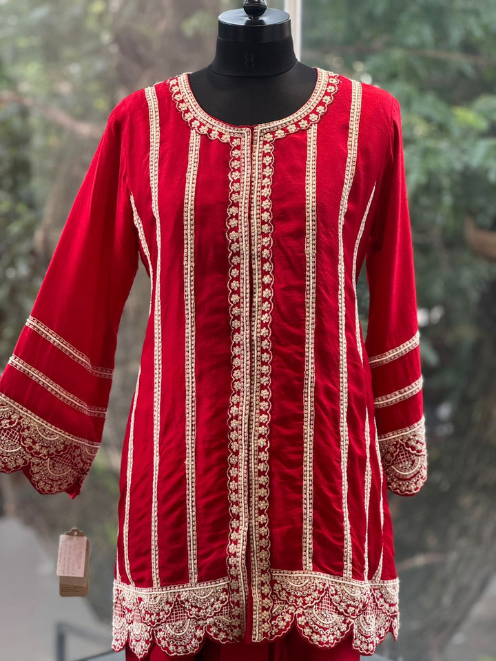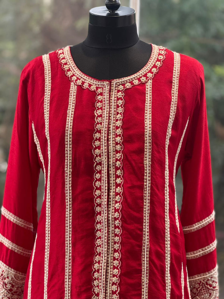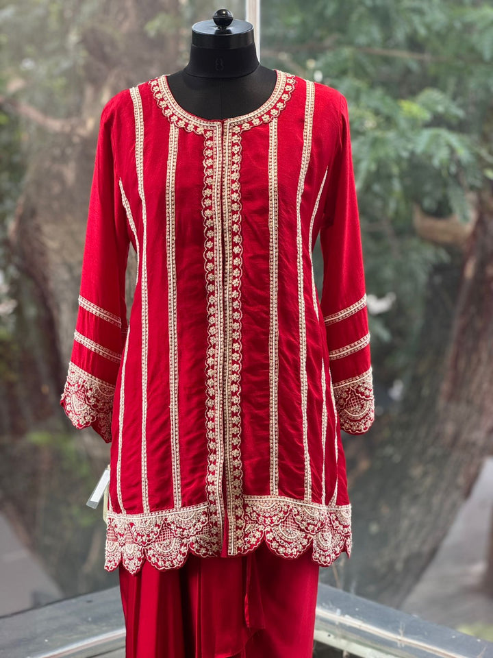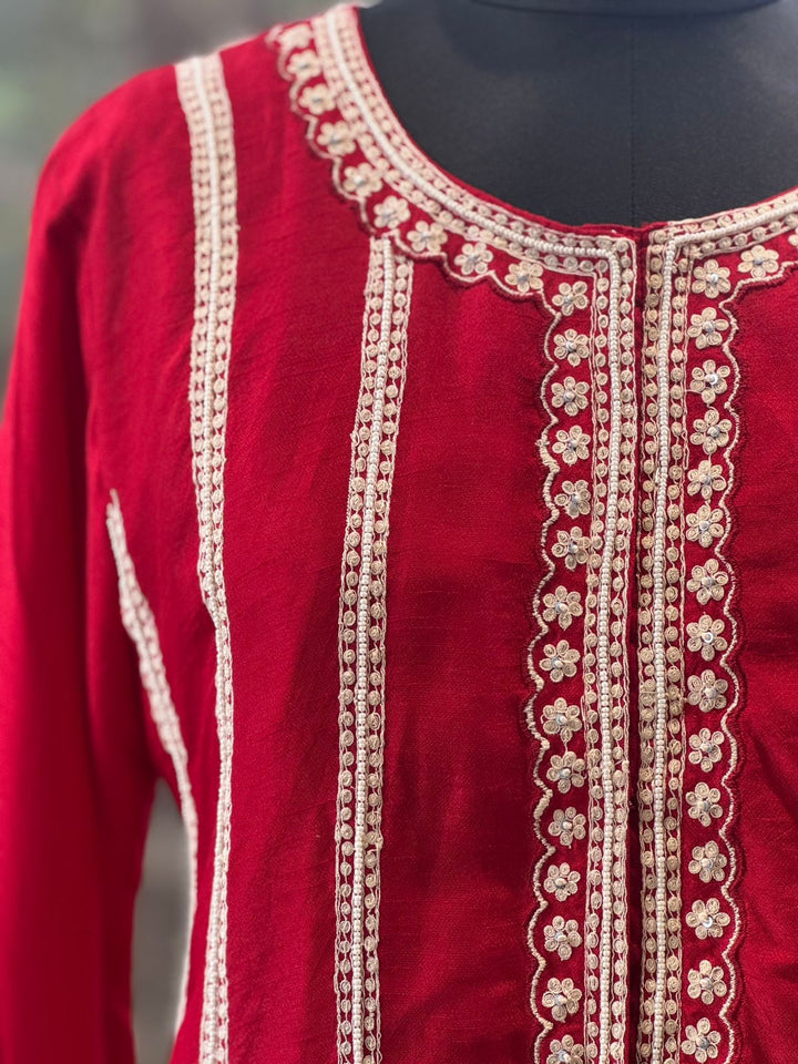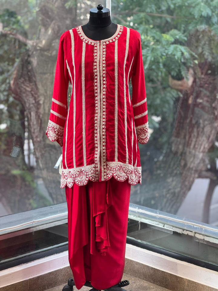 Pure silk hand embroidered scallop design top with front pleated skirt in pure satin .